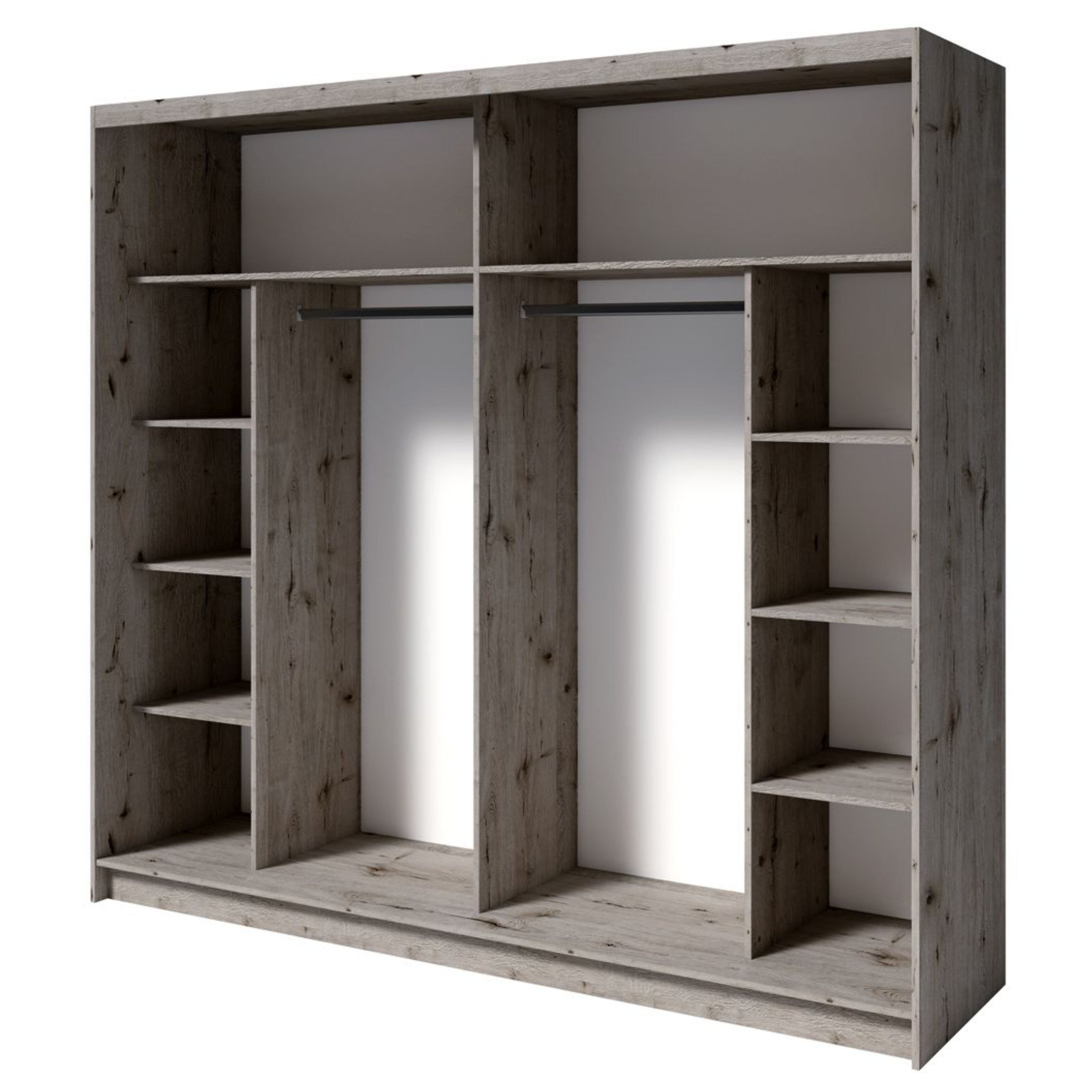 Skriňa obsahuje vnútorné vybavenie v podobe 4 vložených políc a 1 šatníkovej tyče v každej polovici skrine. Šatníkové tyče umožňujú pohodlné zavesenie väčších alebo krčivých odevov. Dve široké horné police poskytujú dostatok miesta na uloženie lôžkovín alebo momentálne nepoužívaného oblečenia. Skriňu uzatvárajú posuvné dvere, ktoré šetria cenný priestor zvonka aj zvnútra skrine. Sú vyplnené zrkadlami, vďaka ktorým si môžete kedykoľvek upraviť svoj vzhľad. Skriňa je vyrobená z laminovaného dreveného materiálu s povrchom nenáročným na údržbu.