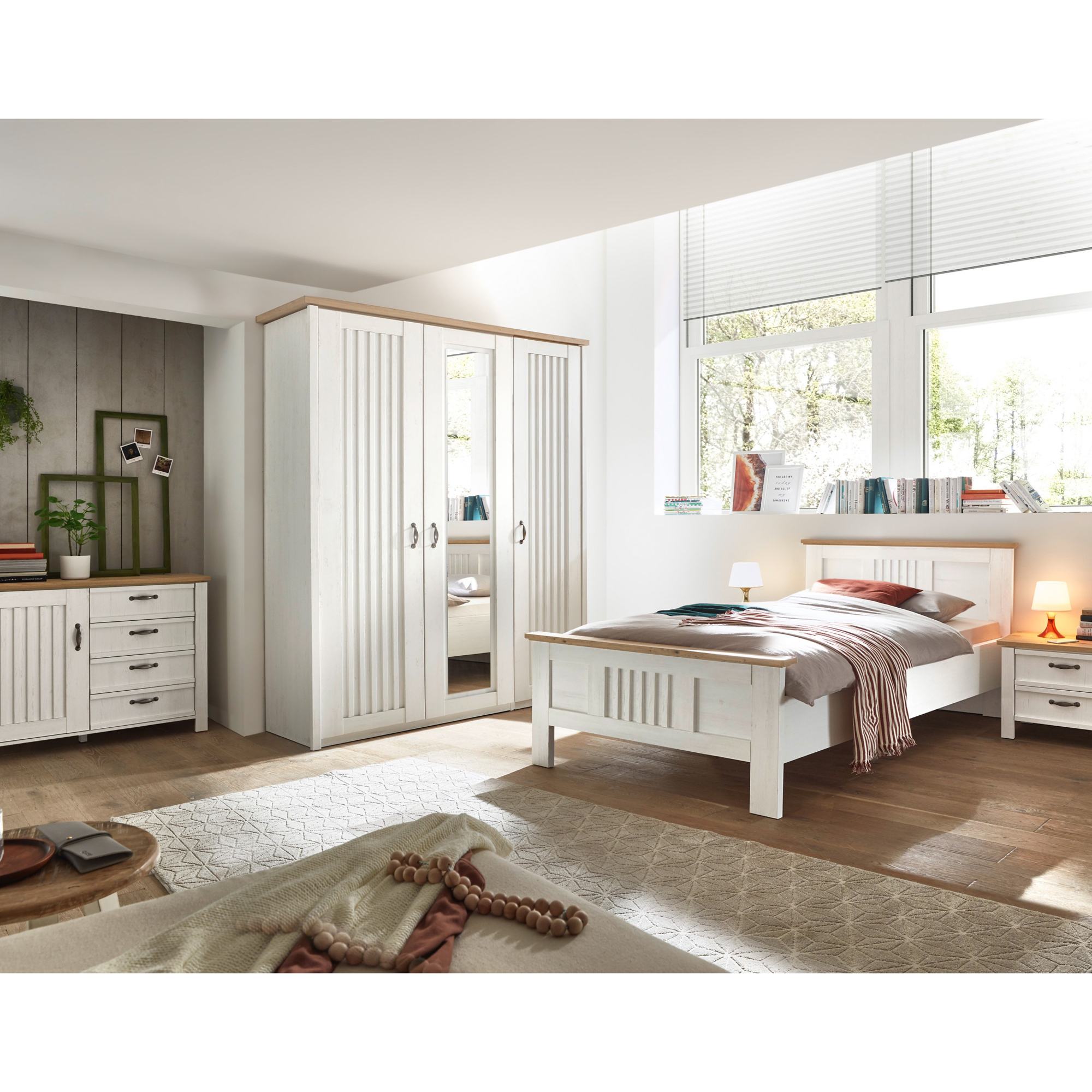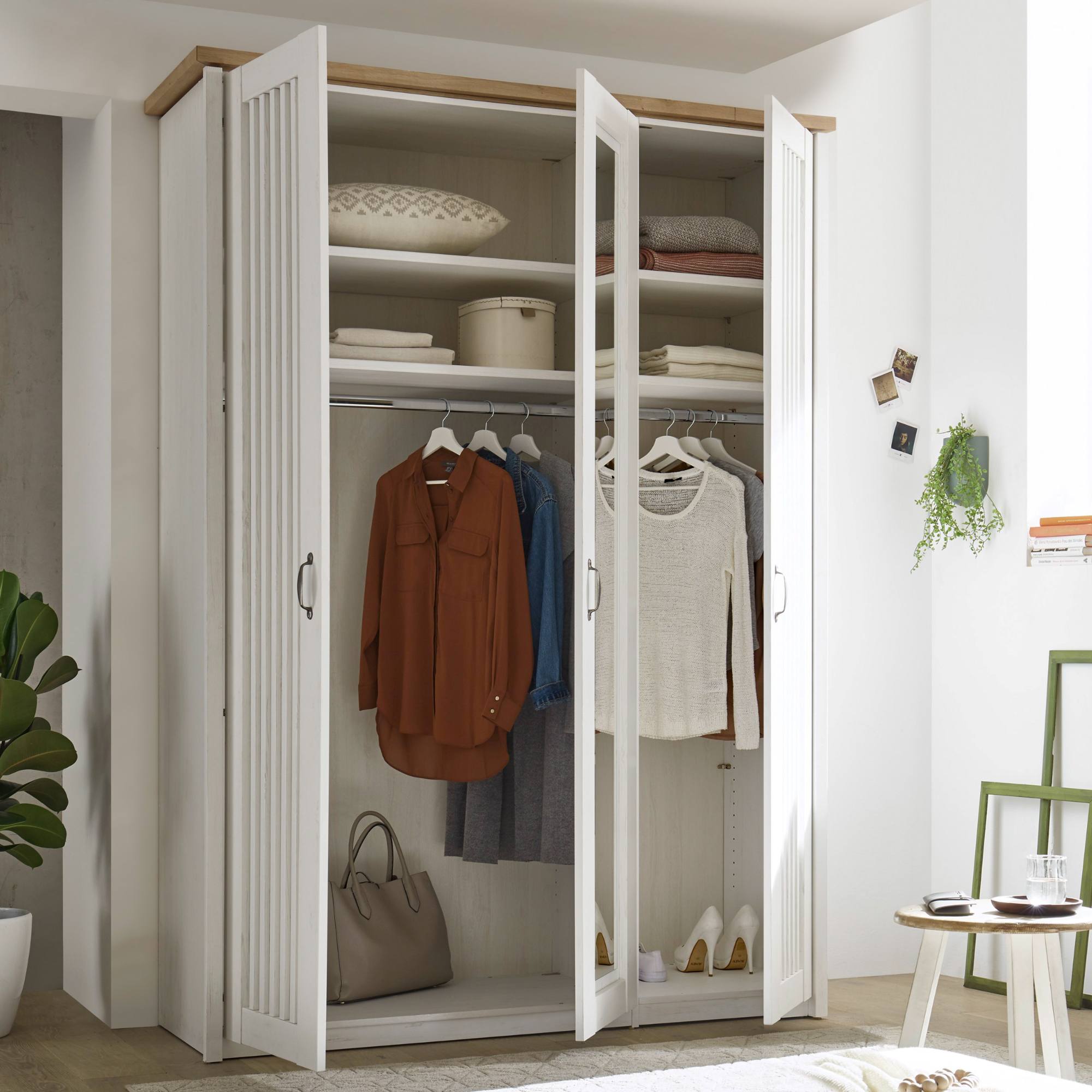 Priestranná šatníková skriňa TRIENT je vyrobená v príjemnom štýle Provence. Odľahčujúci biely odtieň dekora borovice andersen je doplnený výraznejším dekorom duba artisan v podobe hornej dosky.