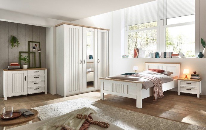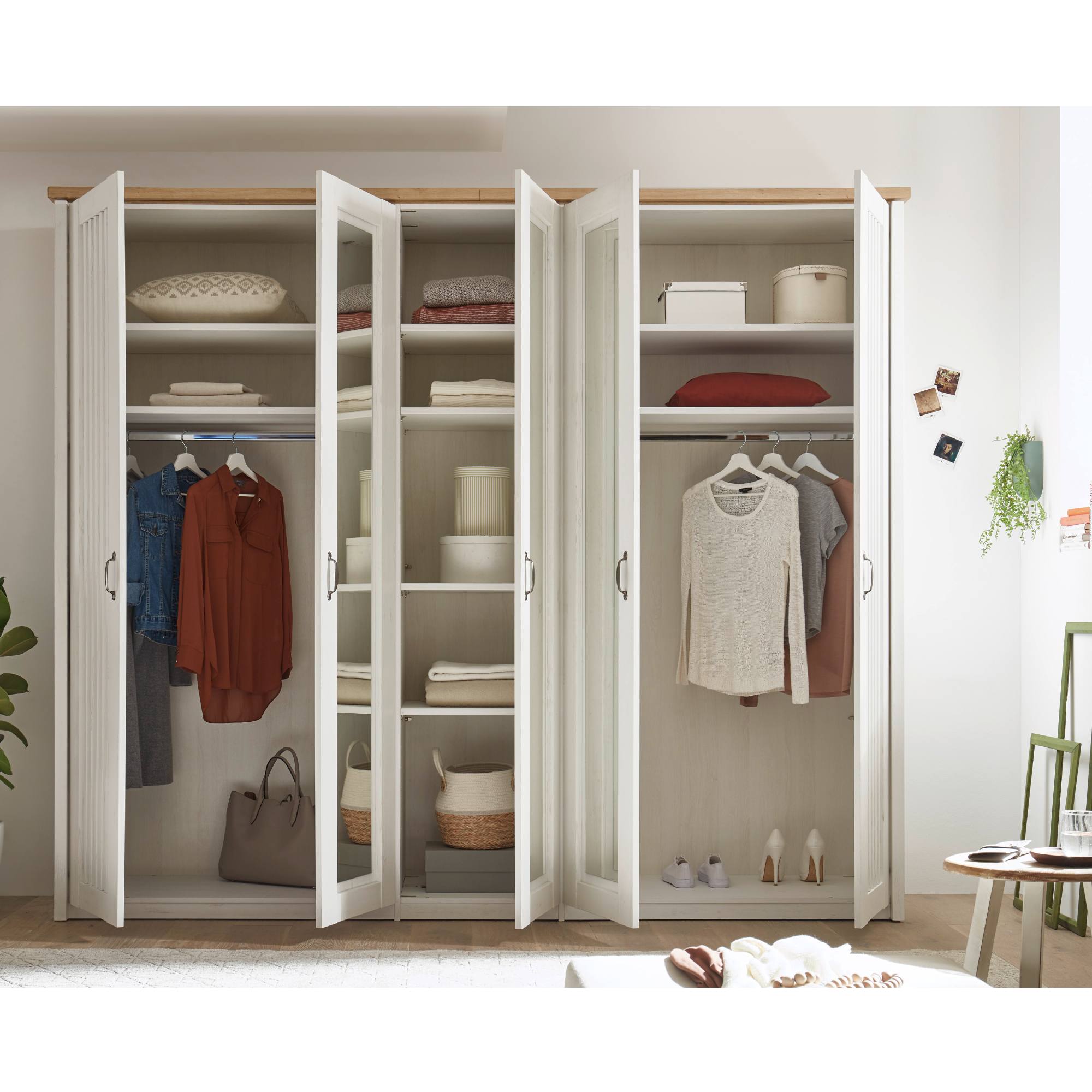 Priestranná šatníková skriňa TRIENT je vyrobená v príjemnom štýle Provence. Odľahčujúci biely odtieň dekora borovice pinie je doplnený výraznejším dekorom duba artisan v podobe hornej dosky.