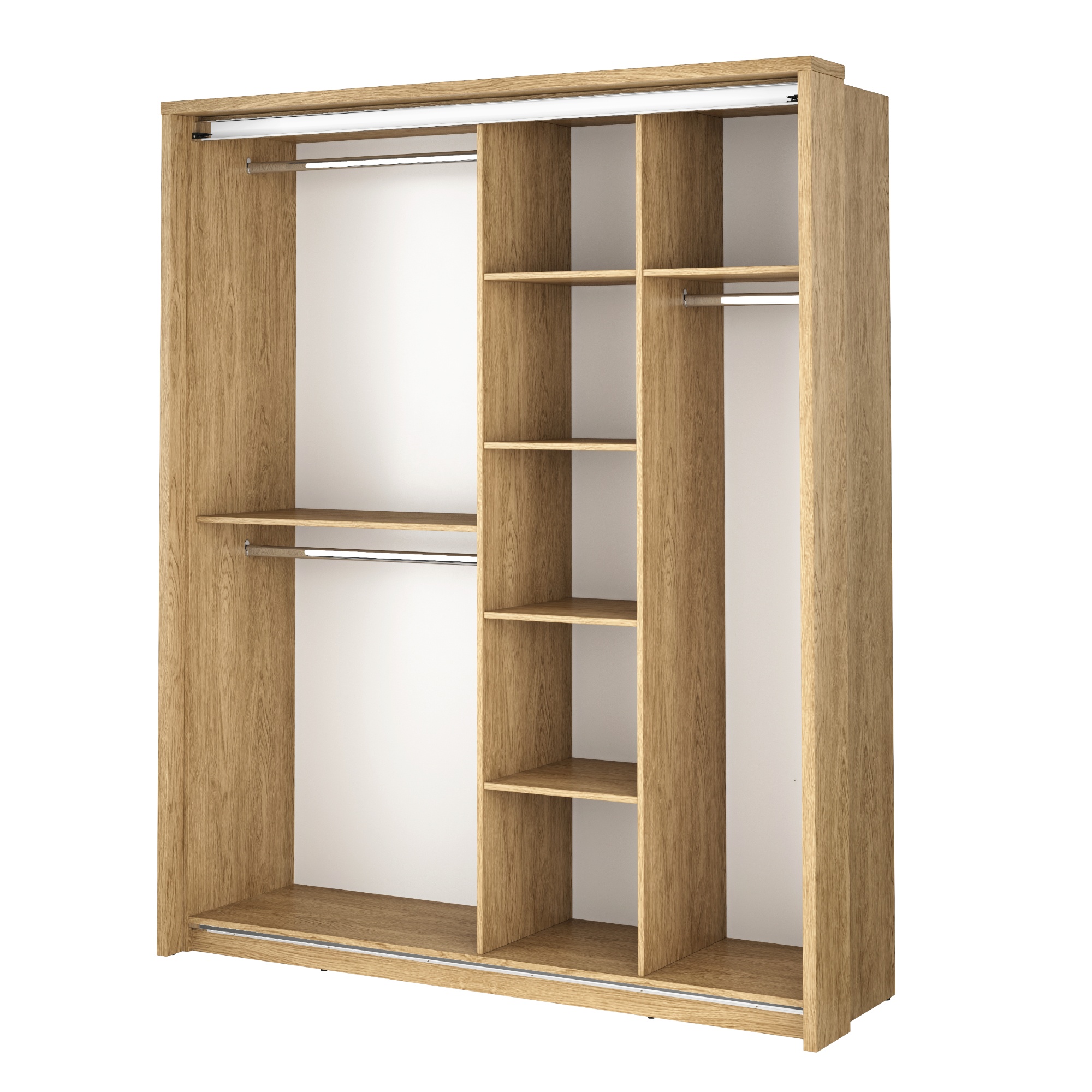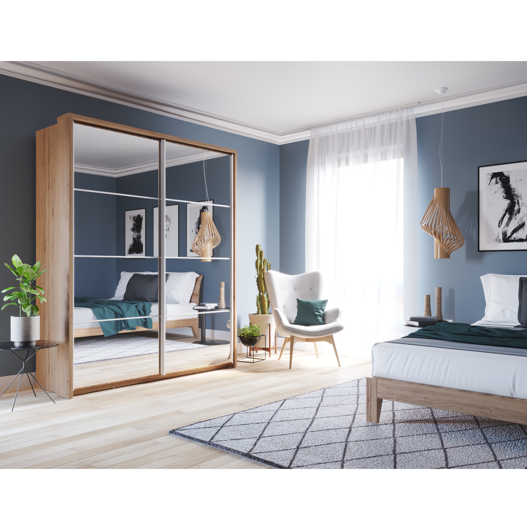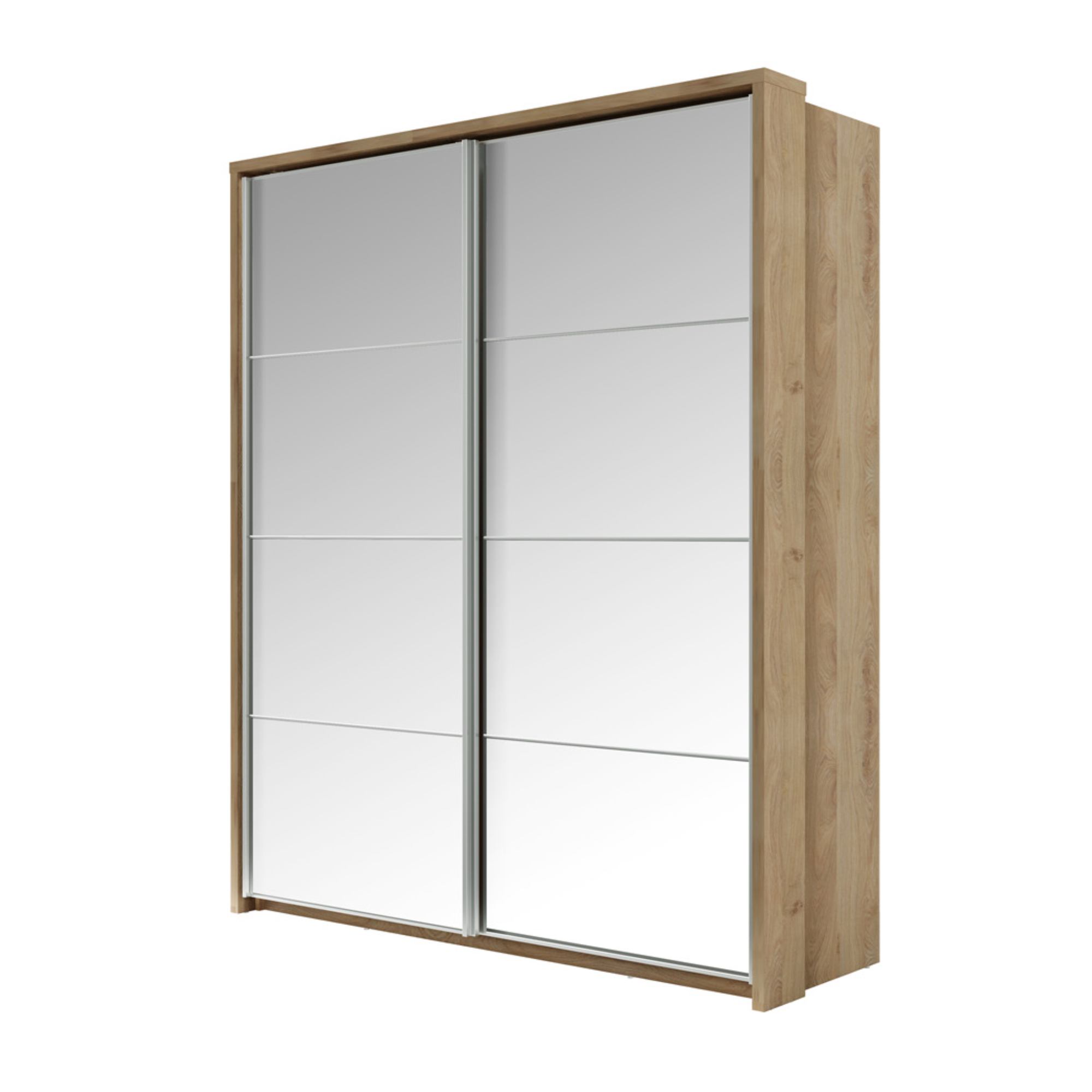 Šatníková skriňa disponuje dvojicou zrkadlových posuvných dverí, vďaka čomu pomôžu k doladeniu vášho outfitu a zároveň ušetria miesto pri otváraní. Bohatý úložný priestor zaisťuje šesť políc a tri šatníkové tyče. Všetko oblečenie tak bude vždy logicky a prehľadne usporiadané. Skriňa je vyrobená z laminovaného dreveného materiálu, ktorý sa vyznačuje ľahkou udržiavateľnosťou aj dlhou životnosťou.