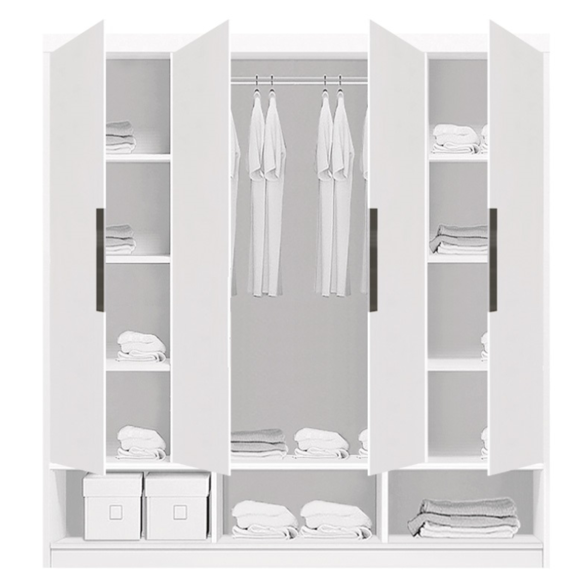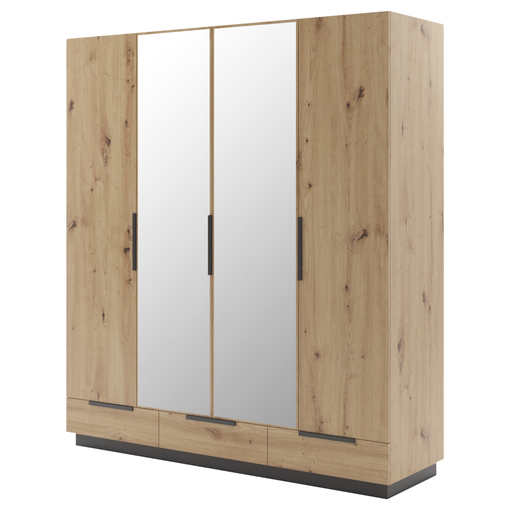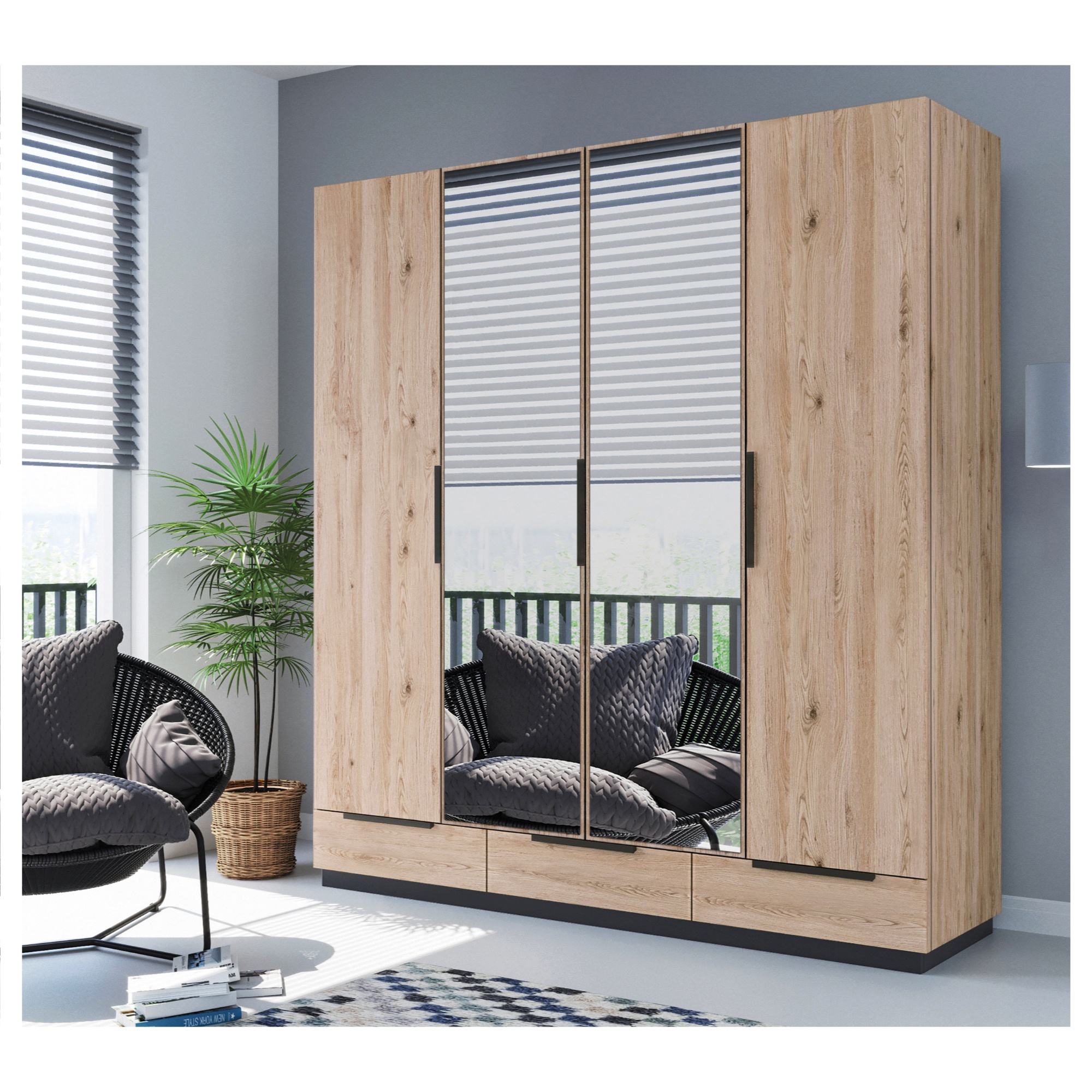 Skriňa je uzatvárateľná 4 otočnými dverami z ktorých 2 sú vybavené zrkadlami, vďaka ktorým si môžete kedykoľvek upraviť svoj vzhľad. Práve za prostredným párom dverí sa nachádza prepojený priestor so šatníkovou tyčou na zavesenie krčivých a objemnejších odevov. Samostatné ľavé dvere, rovnako ako tie pravé, za sebou ukrývajú 3 vložené police. V spodnej časti skrine sa nachádzajú ešte 3 zásuvky na oddelenie drobnejších predmetov. Všetky predné plochy sú na ľahšiu manipuláciu osadené kontrastnými rúčkami. Konštrukcia skrine je vyrobená z fóliovanej drevotriesky s povrchom nenáročným na údržbu.