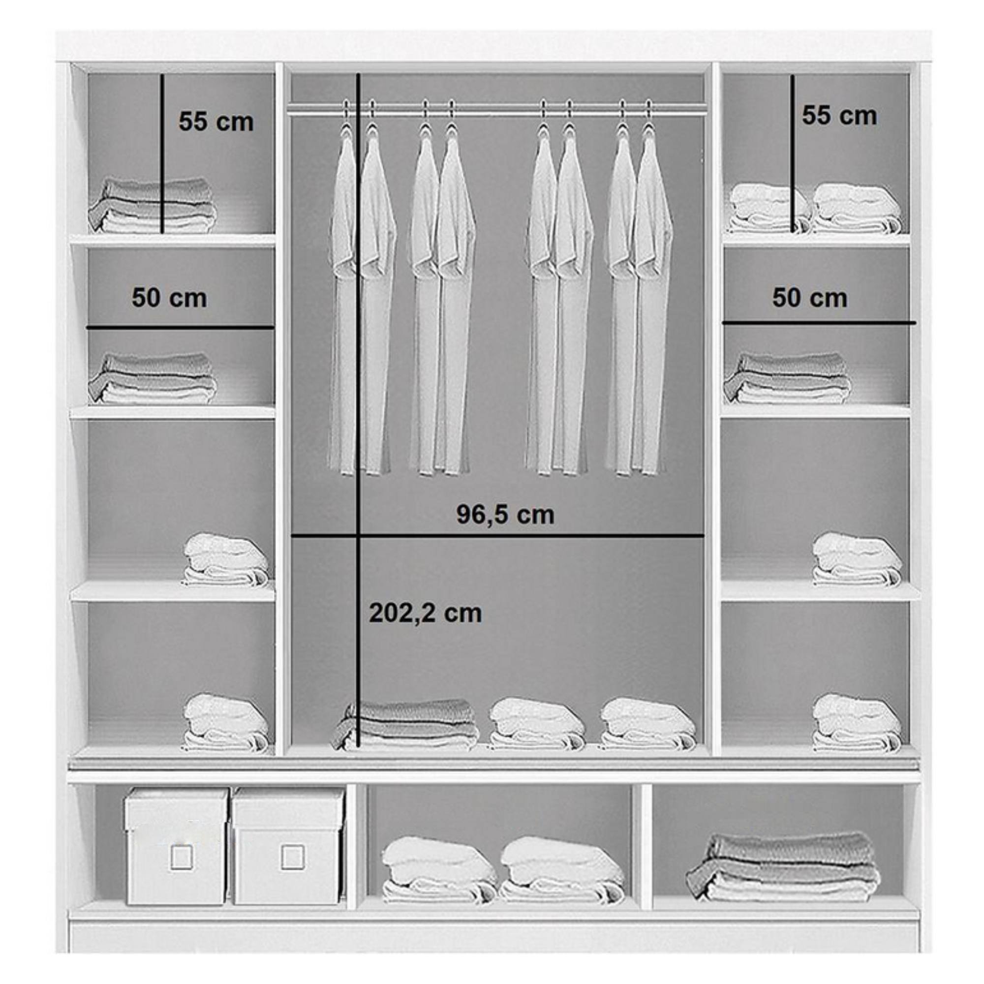 - Šatníková tyč, 6 vložených políc a 3 zásuvky