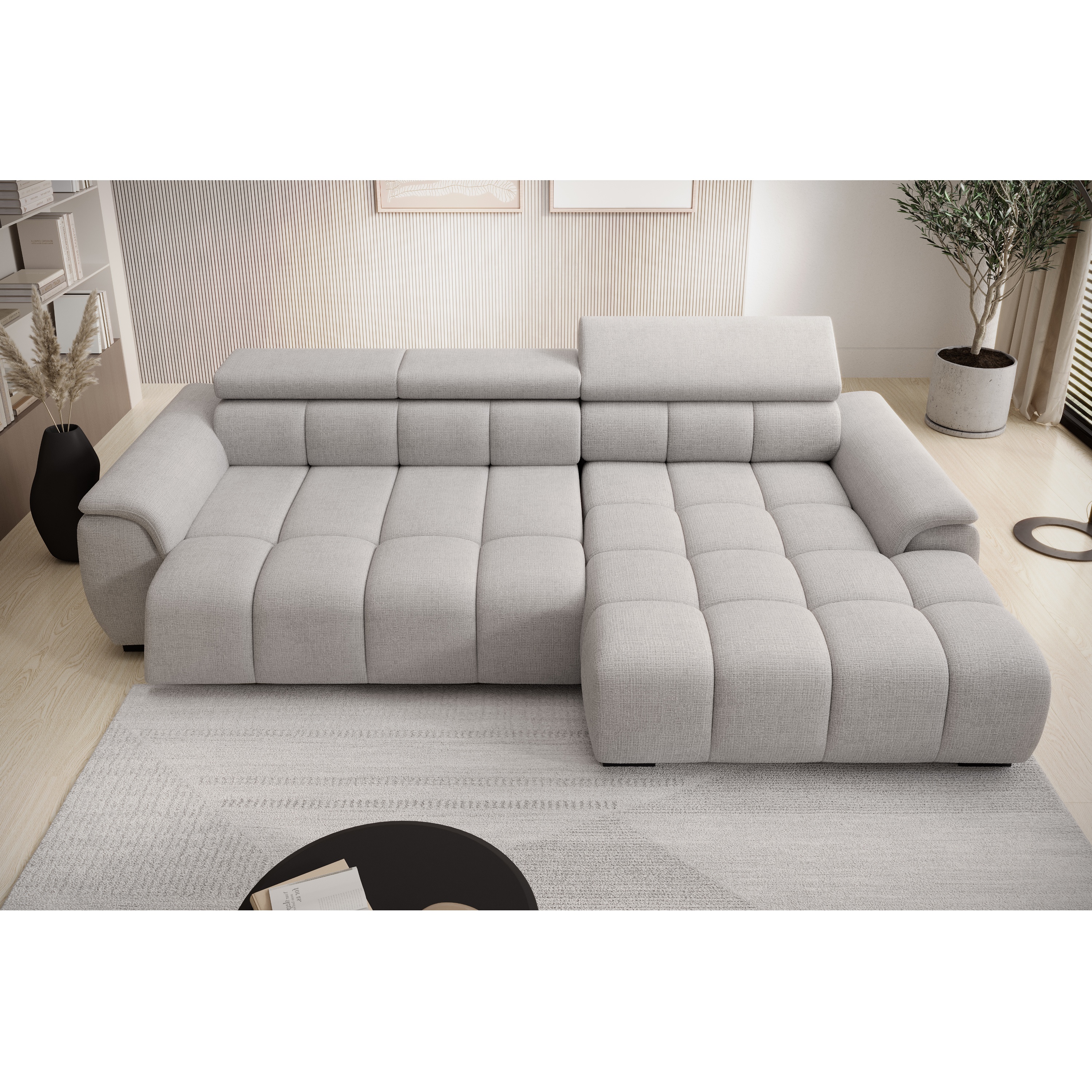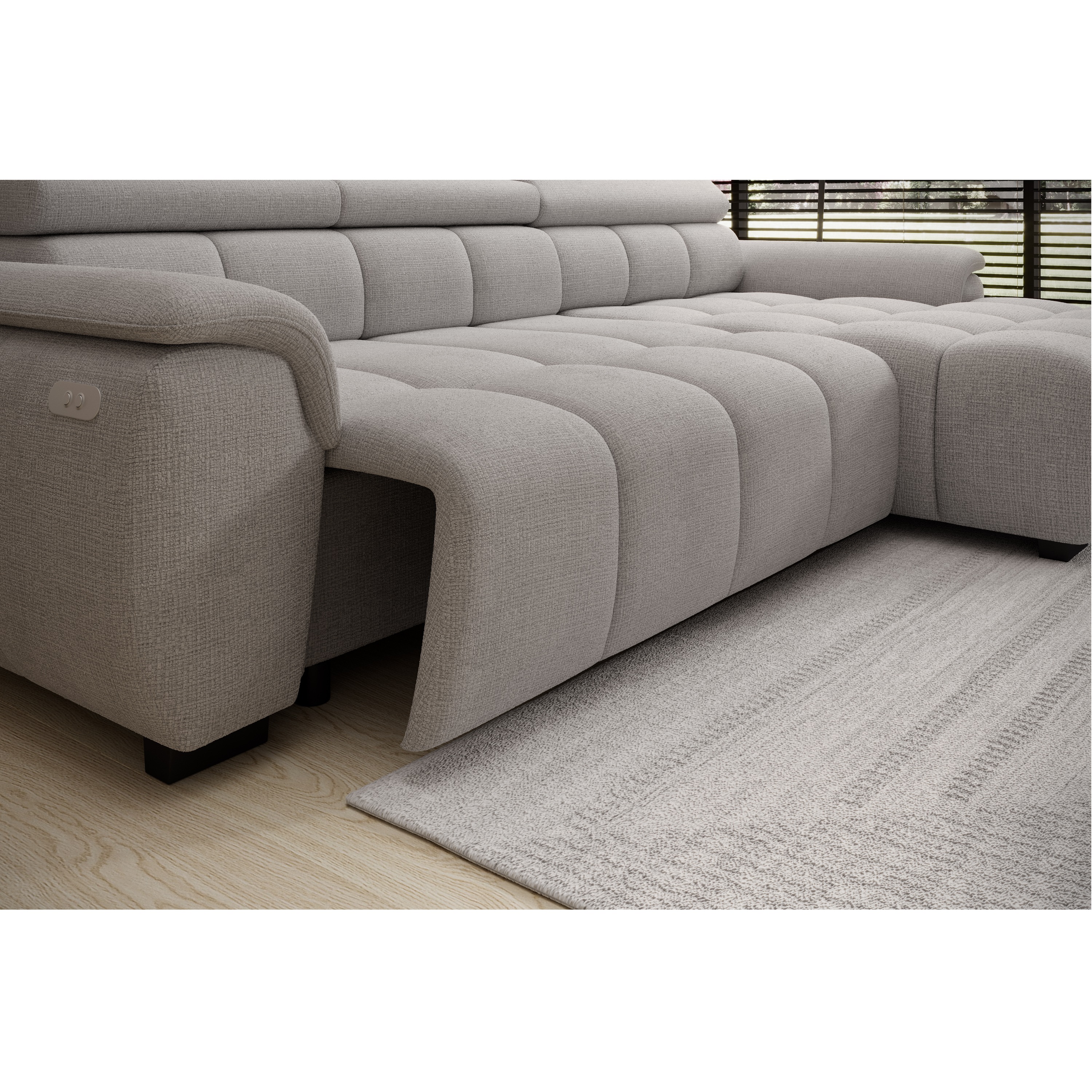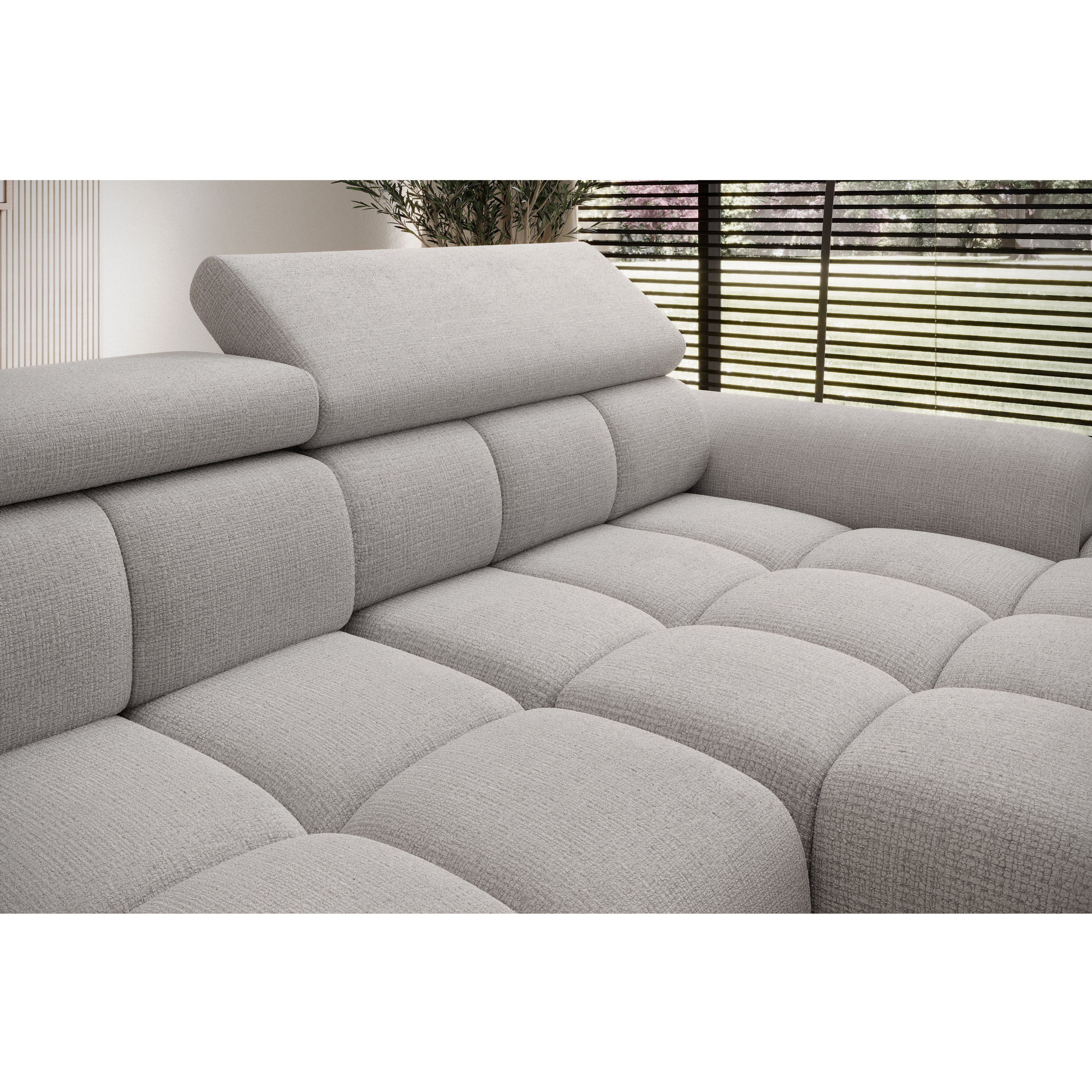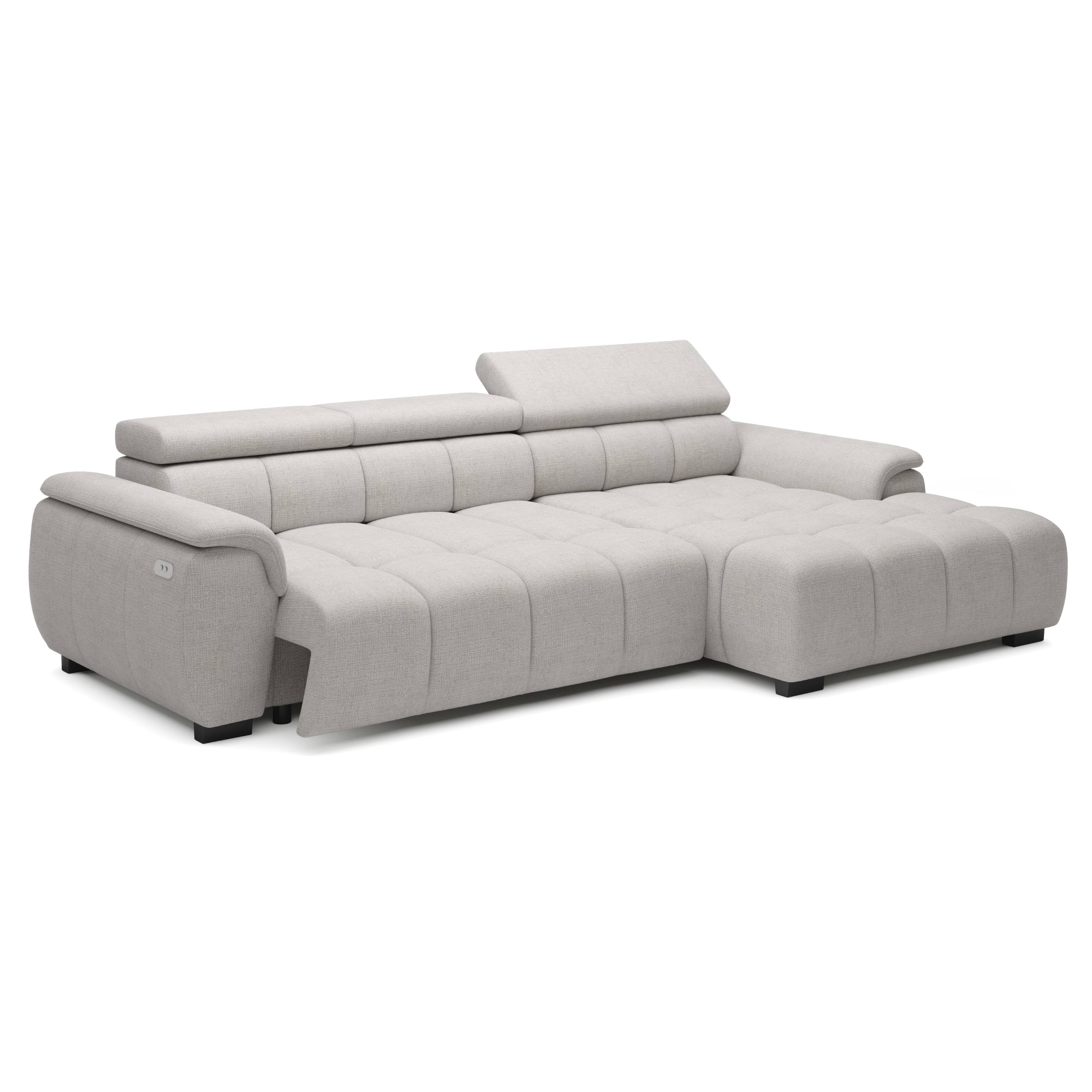 Konštrukcia vyrobená v kombinácii drevených materiálov je čalúnená príjemnou tkaninou zo 100 % polyesteru. Sedacia súprava ponúka komfortné sedenie pre 3 osoby s výplňou z polyuretánovej peny v kombinácii s nosagovým a pásovým odpružením. Pre maximálne pohodlie sedačka umožňuje elektrické nastavenie hĺbky sedu a je vybavená aj 3 polohovateľnými opierkami hlavy. Vďaka možnosti zväčšenia sedacej plochy môžete sedačku využiť aj ako prídavné lôžko na občasné prespanie vašich hostí.