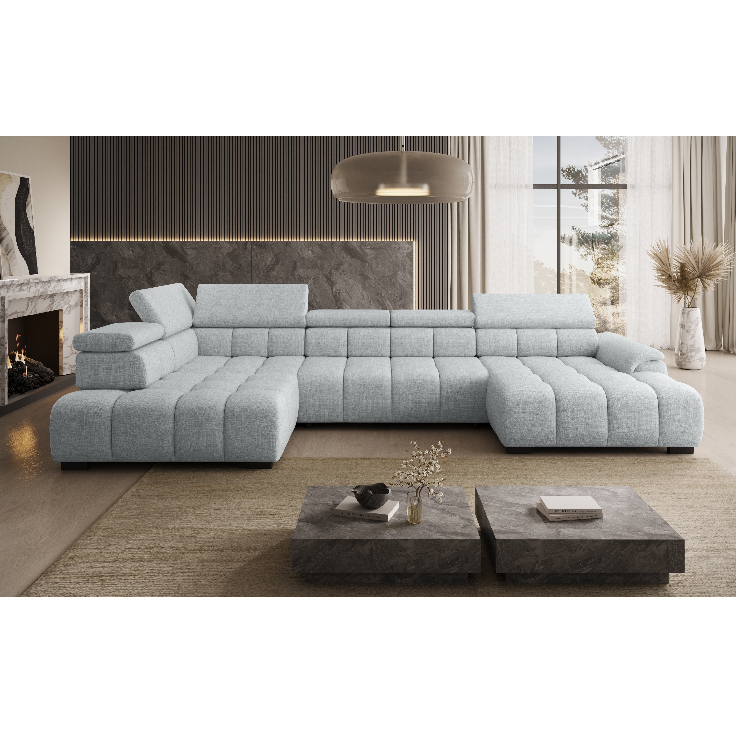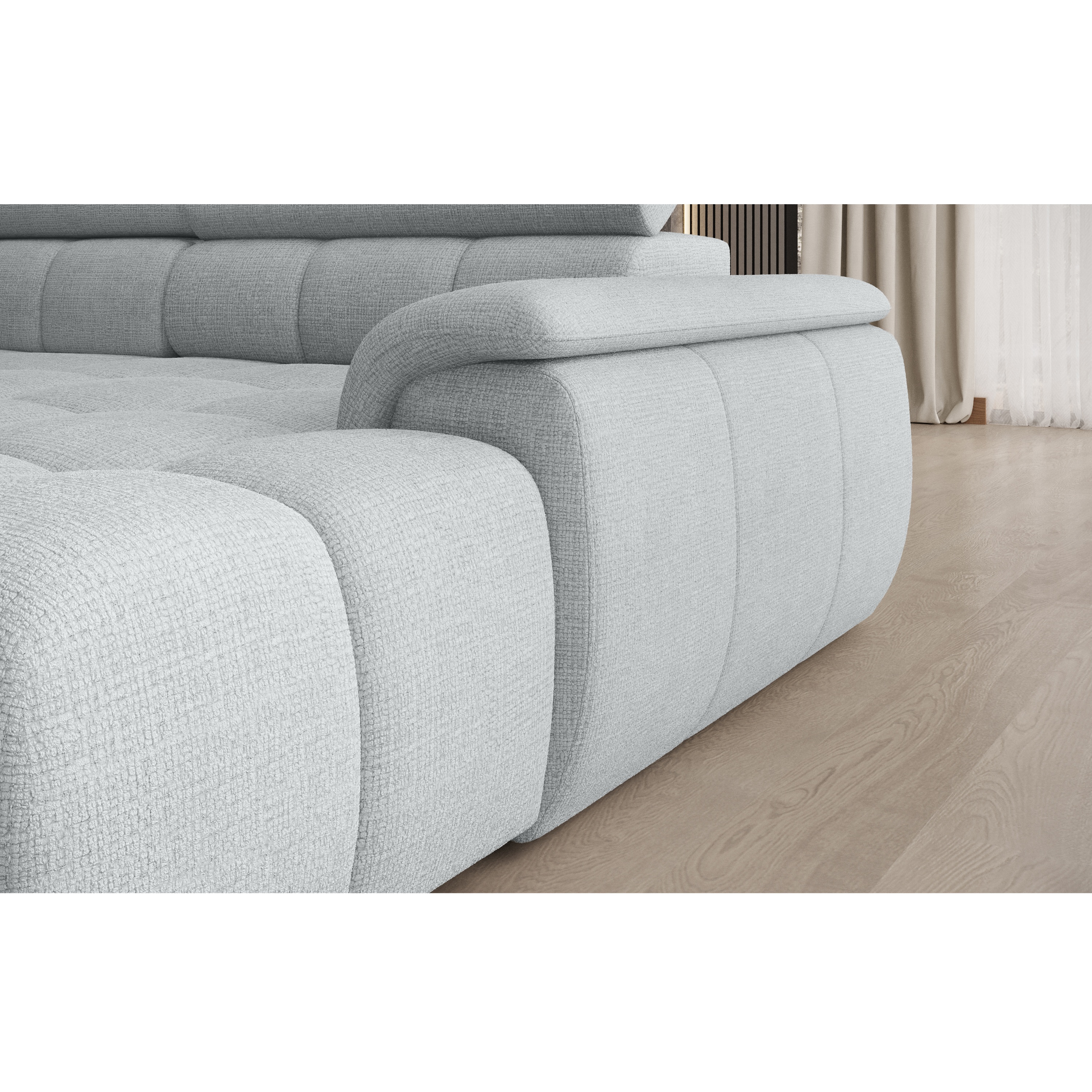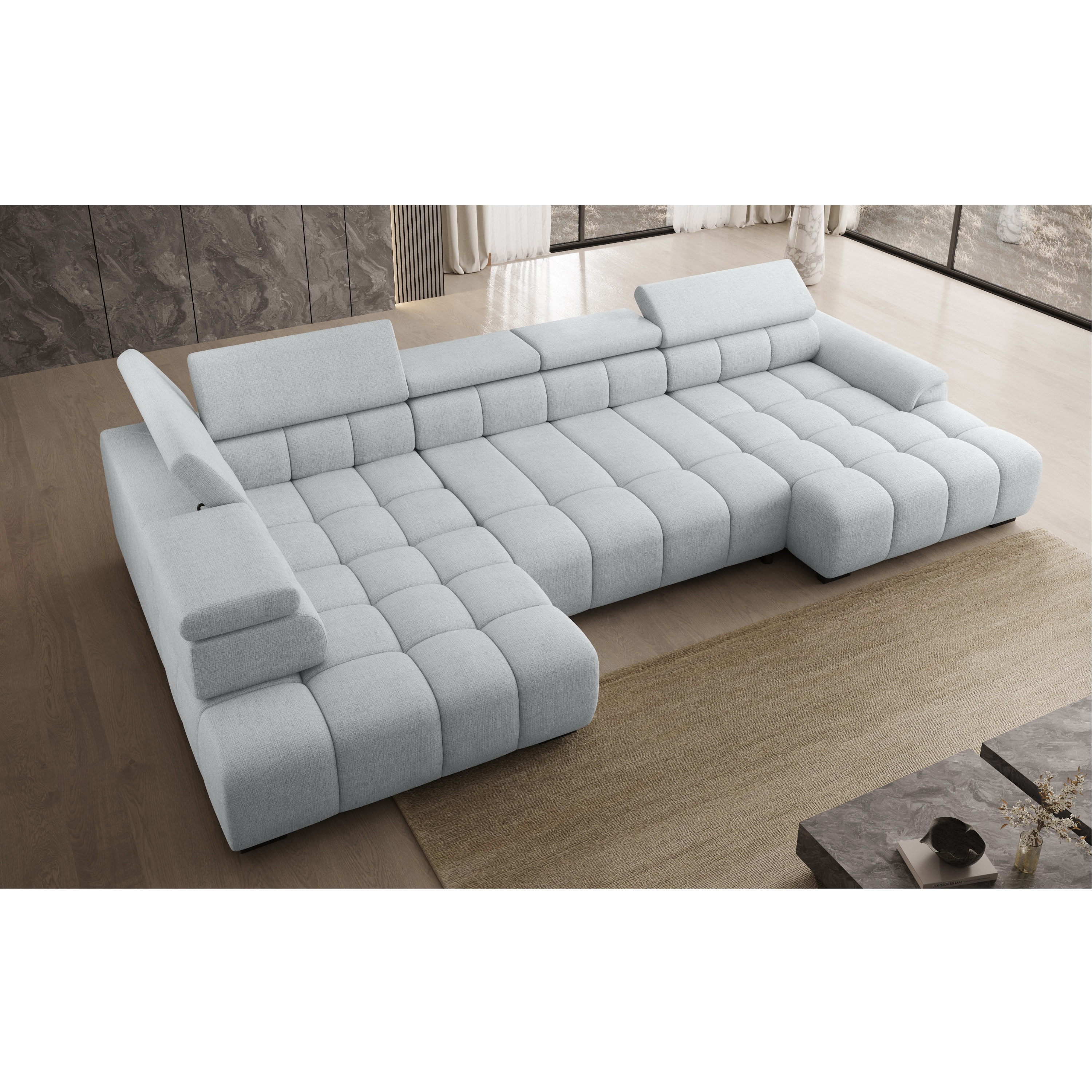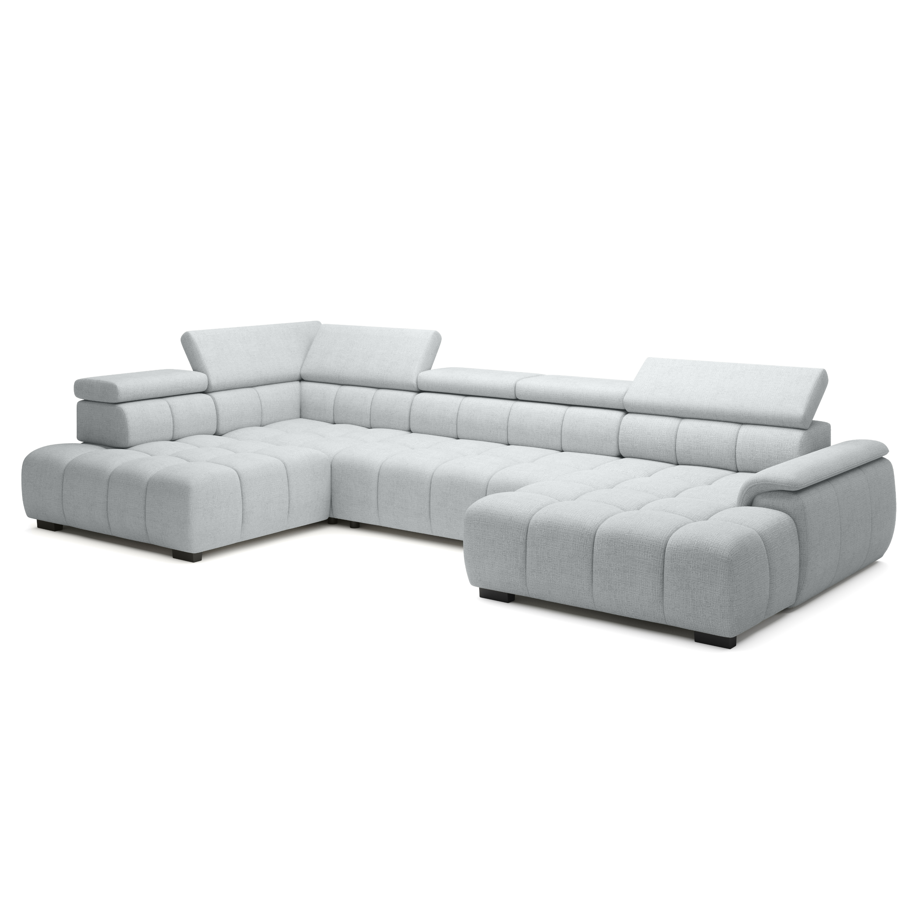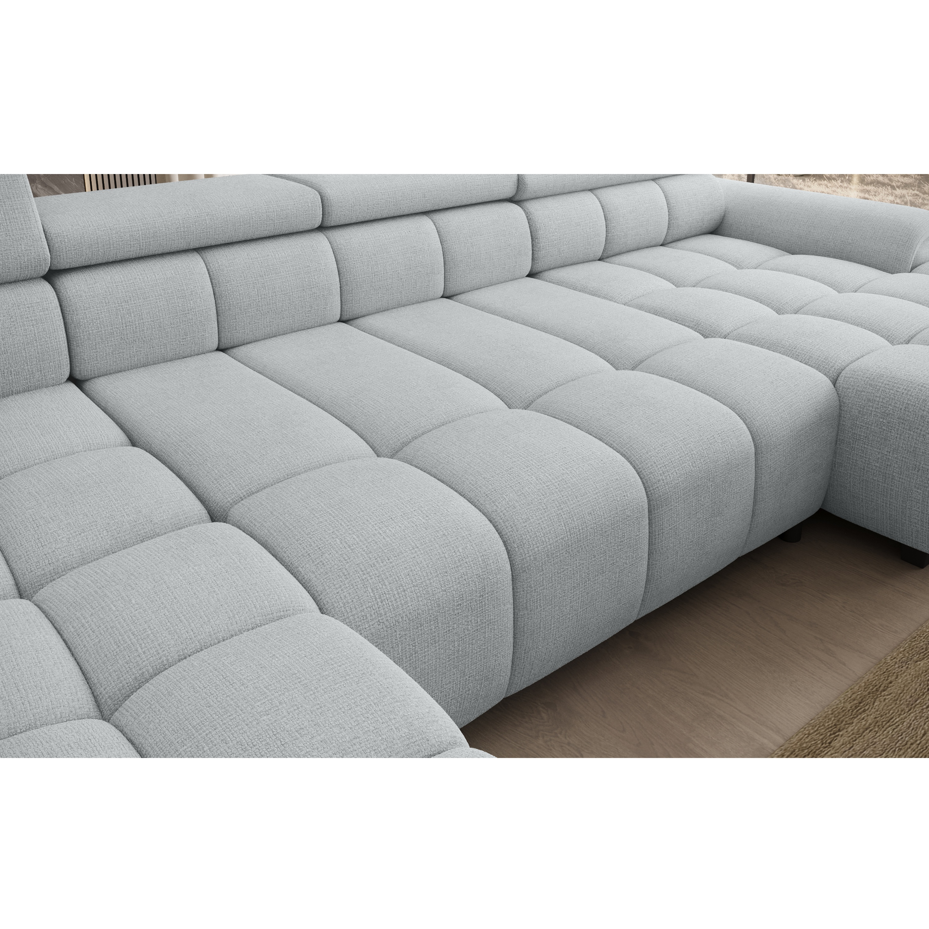 Konštrukcia vyrobená v kombinácii drevených materiálov je čalúnená príjemnou tkaninou zo 100 % polyesteru. Sedacia súprava ponúka komfortné sedenie pre 5 osôb s výplňou z polyuretánovej peny v kombinácii s nosagovým a pásovým odpružením. Pre dosiahnutie maximálneho pohodlia sedačka umožňuje elektrické nastavenie hĺbky sedu a je vybavená aj 6 polohovateľnými opierkami hlavy. Vďaka možnosti zväčšenia sedacej plochy môžete sedačku využiť aj ako dodatočné lôžko na občasné prespanie vašich hostí.