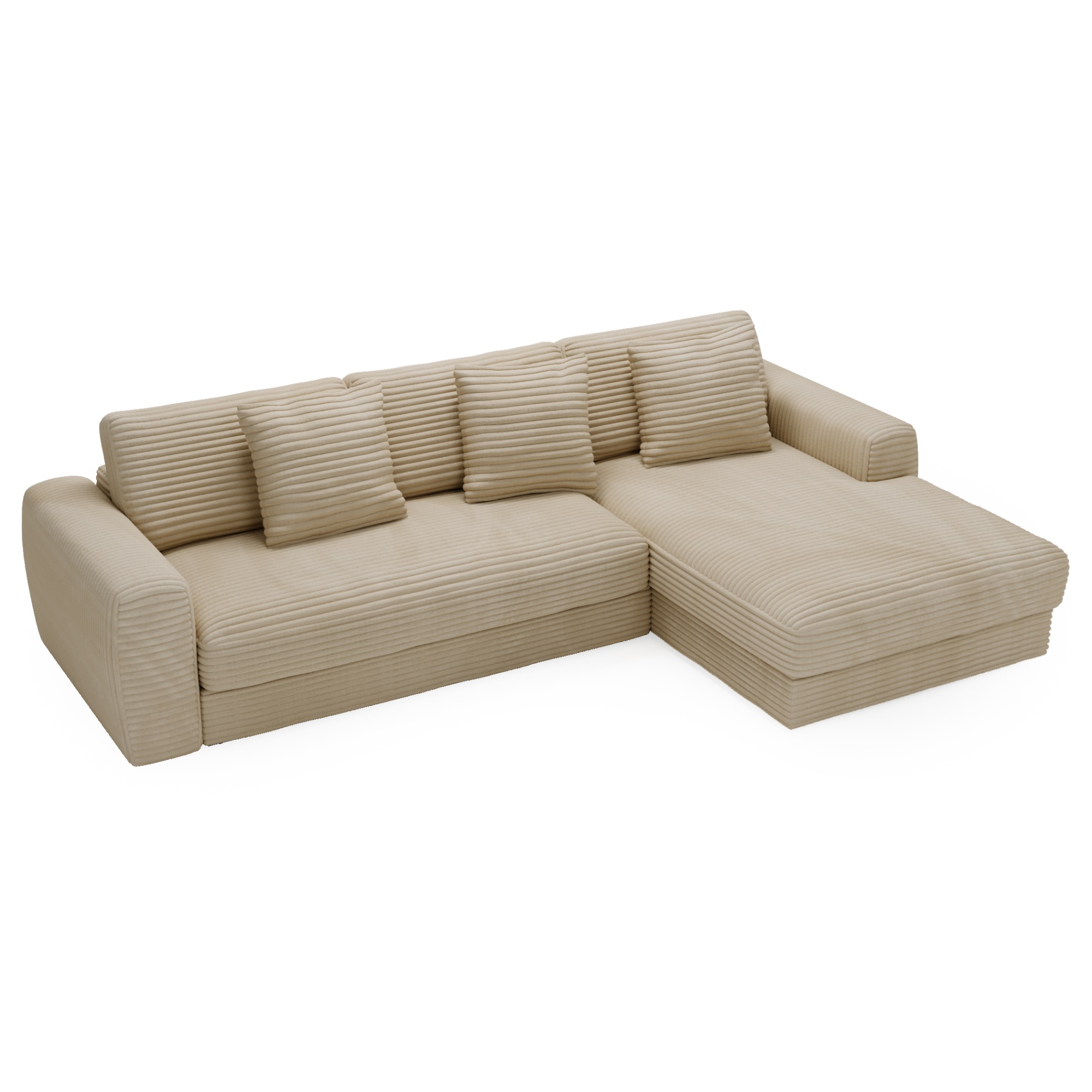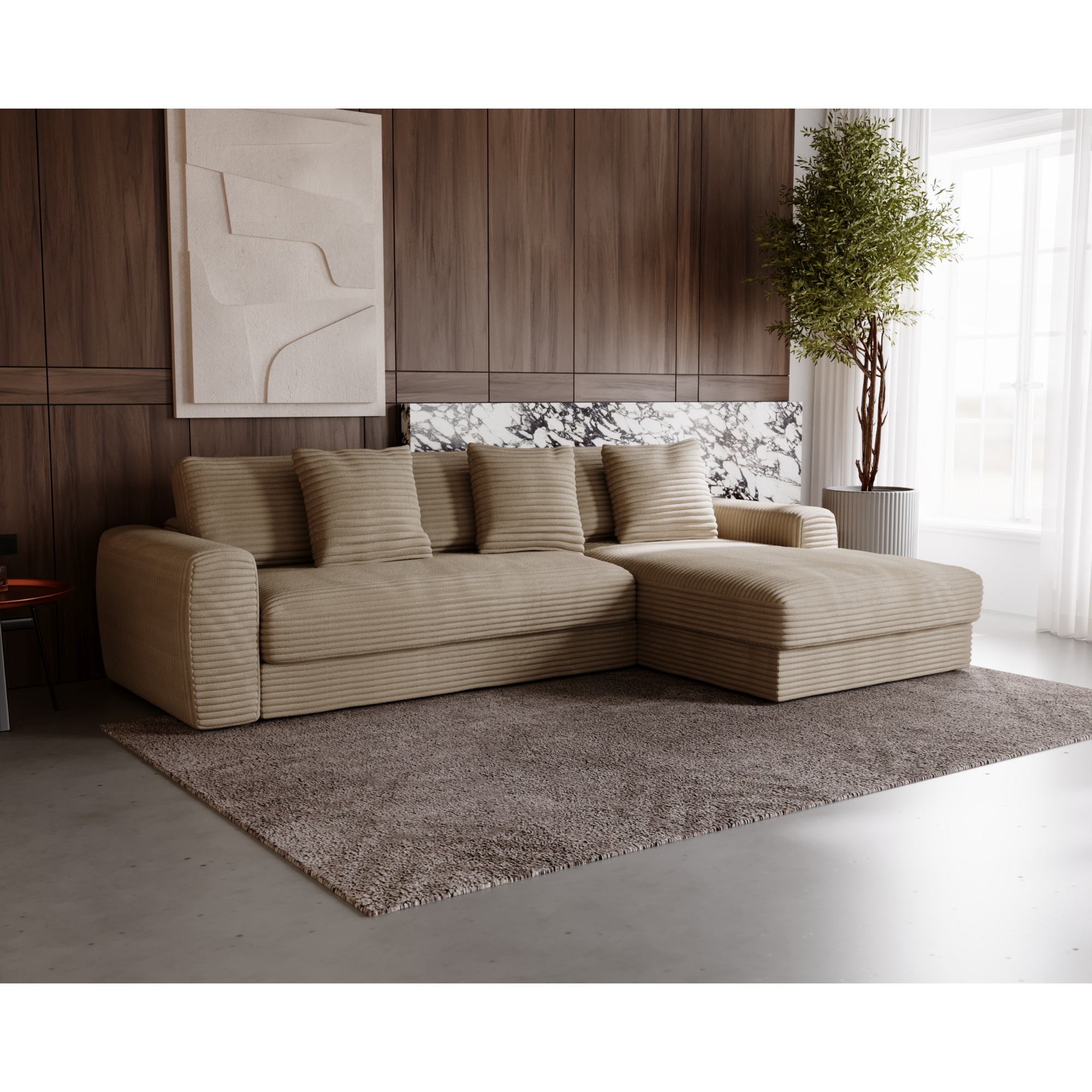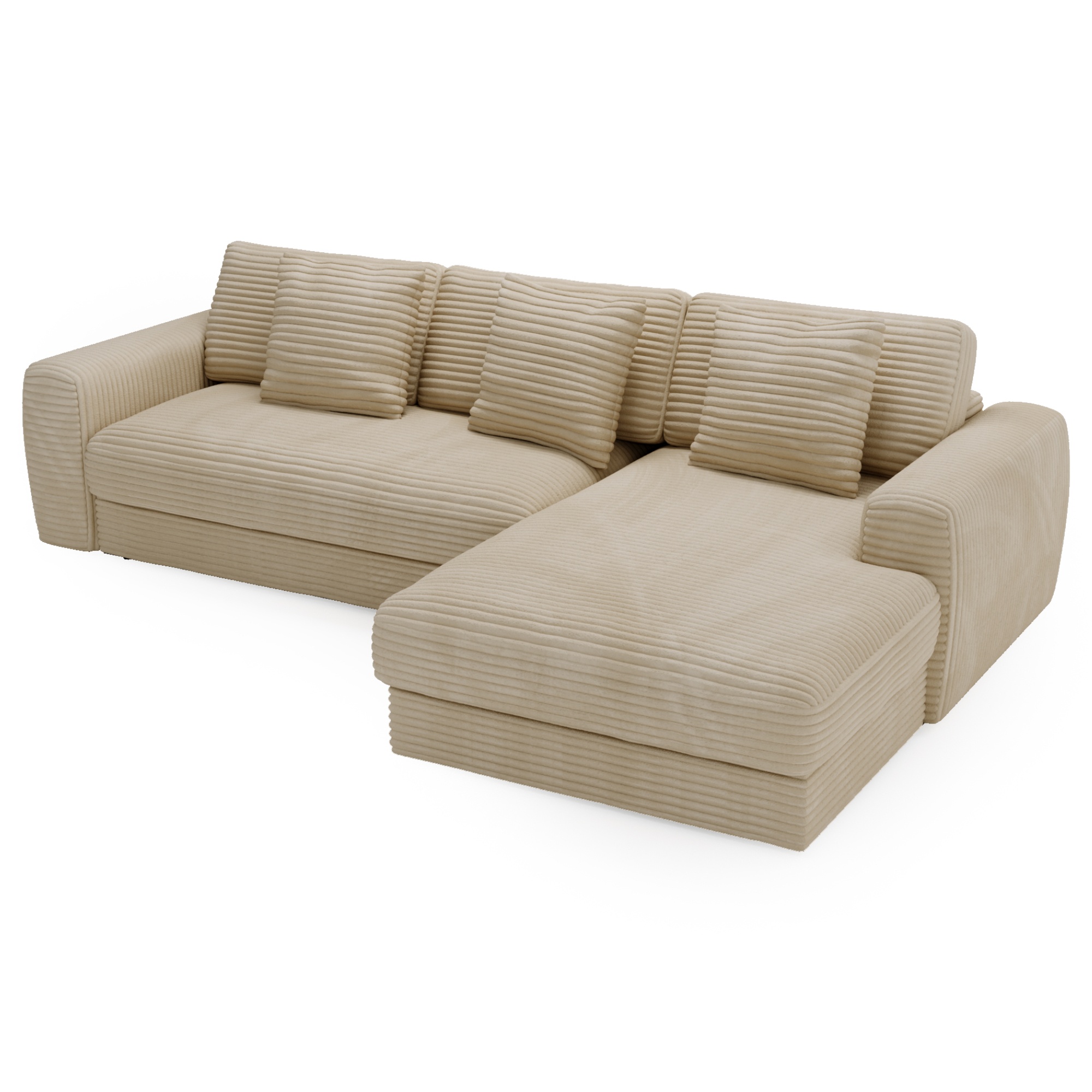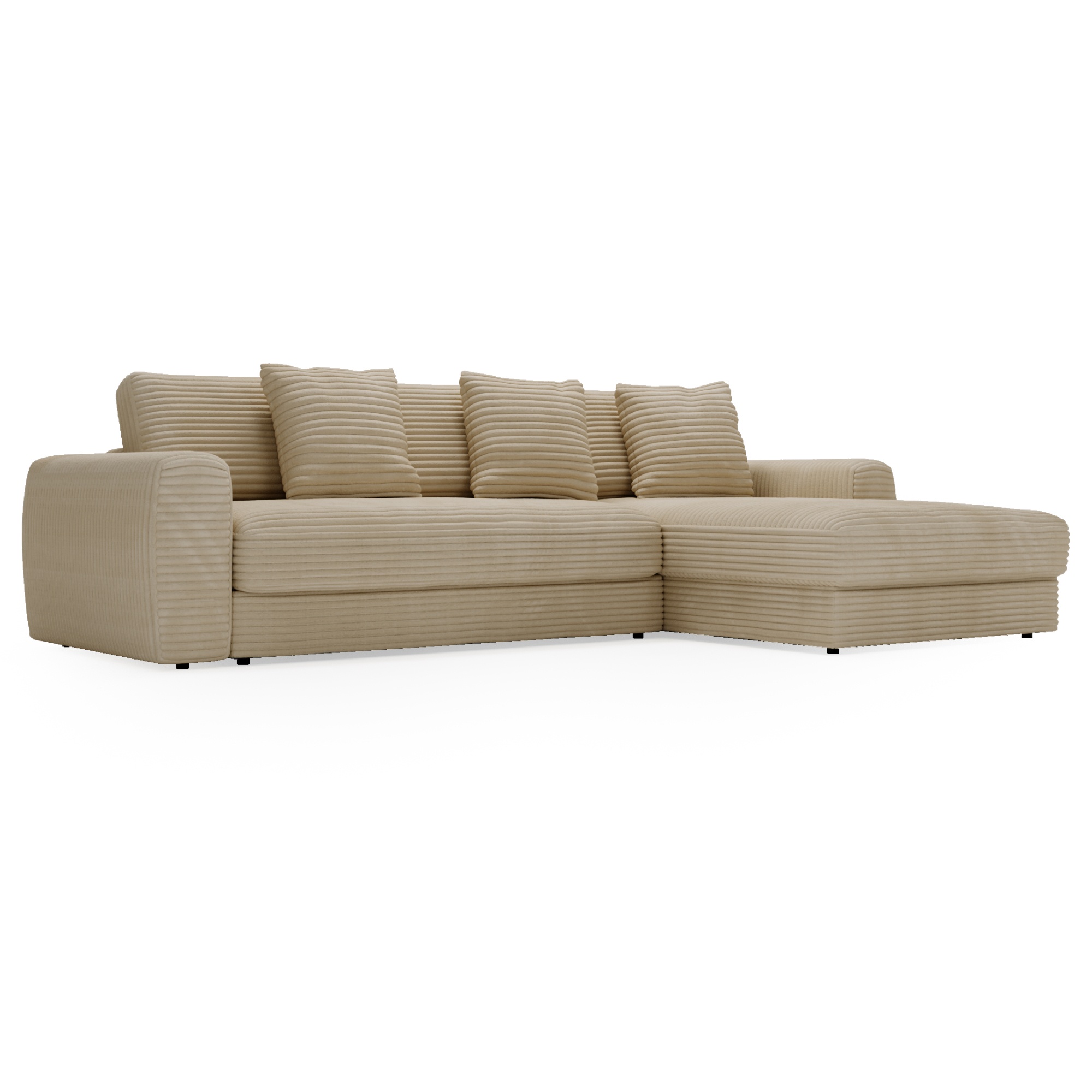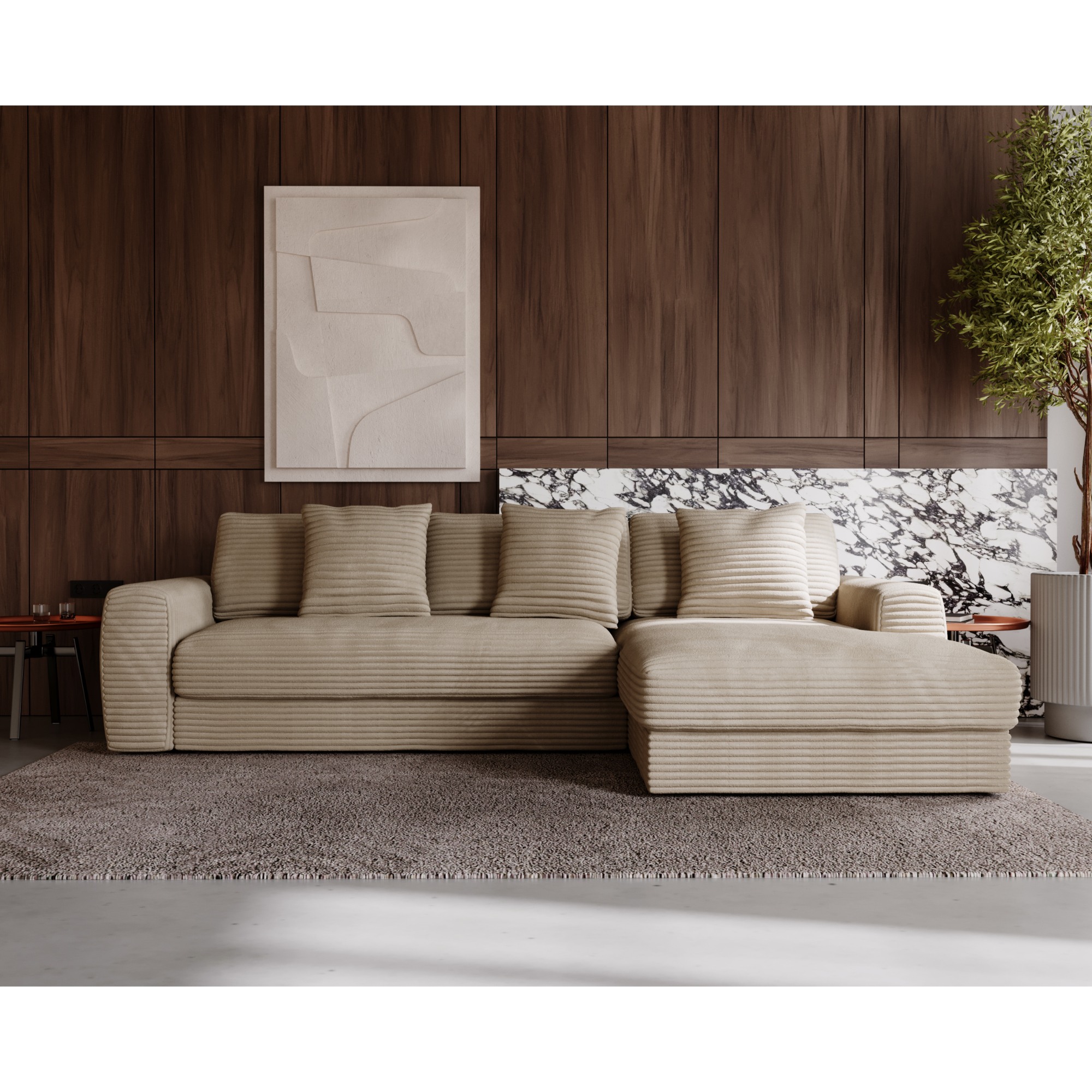 Opierky sú dostatočne vysoké nielen na opretie ruky, ale aj aby ste sa mohli na sedačke pohodlne uvelebiť napríklad pri televízii. Odnímateľné vankúše a dekoračné vankúšiky vám umožnia užívať si optimálne pohodlie. Vďaka poťahu menčestrového vzhľadu sa budete cítiť v sedačke priamo kráľovsky.