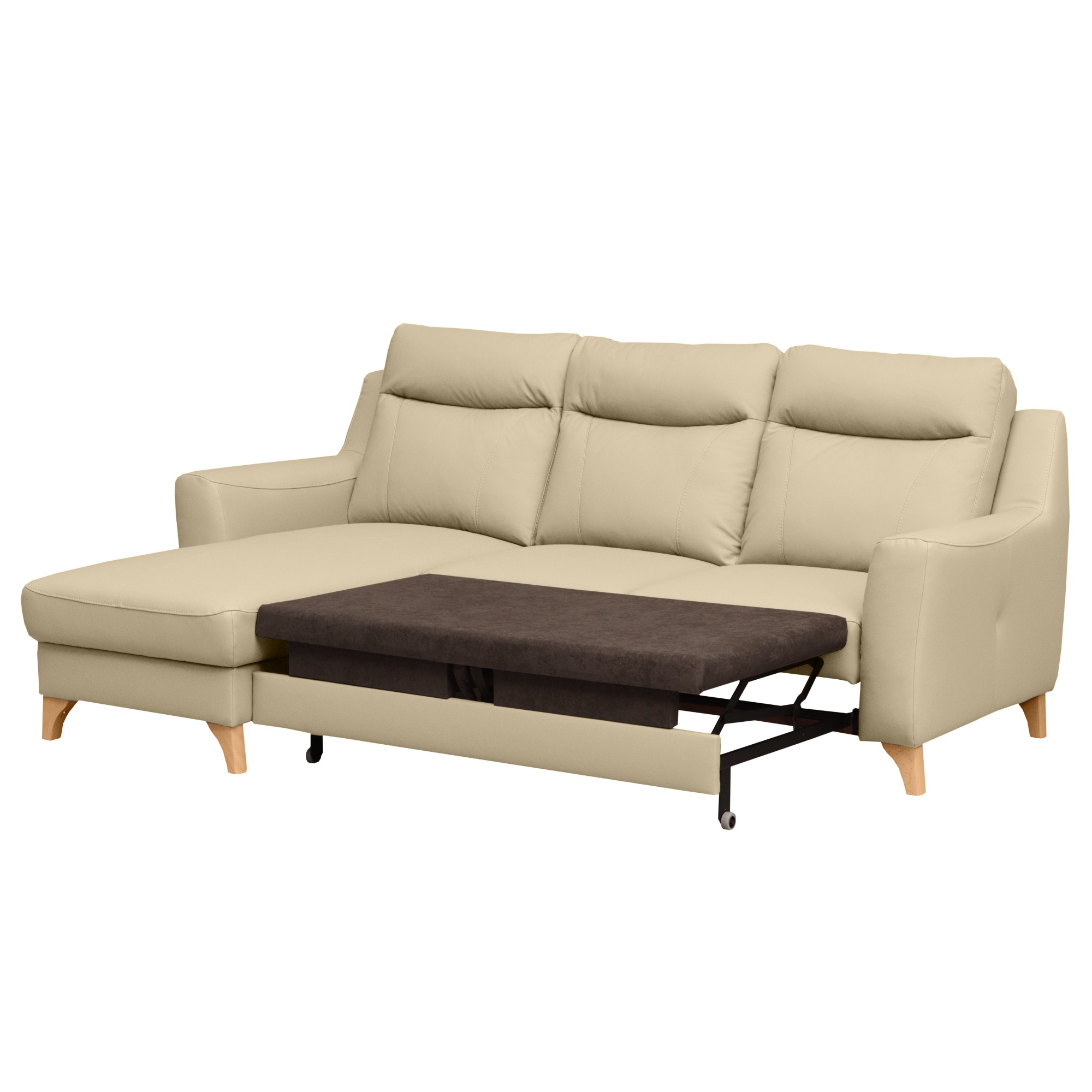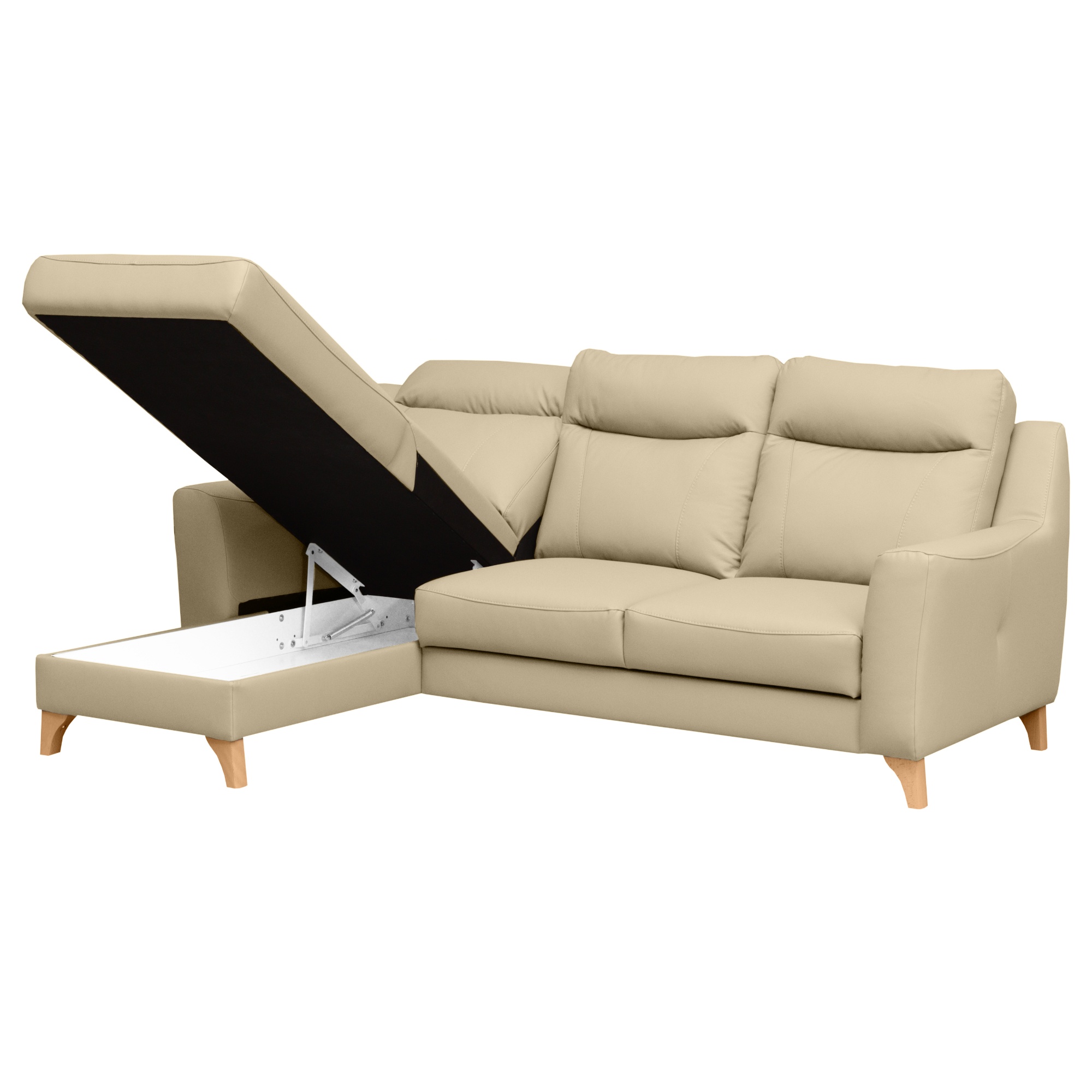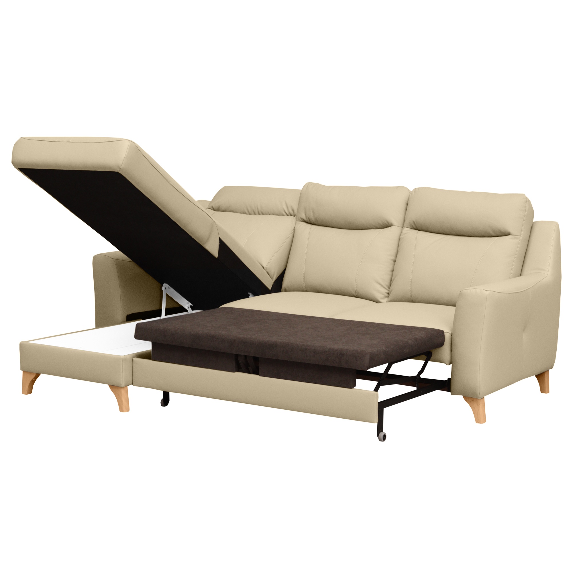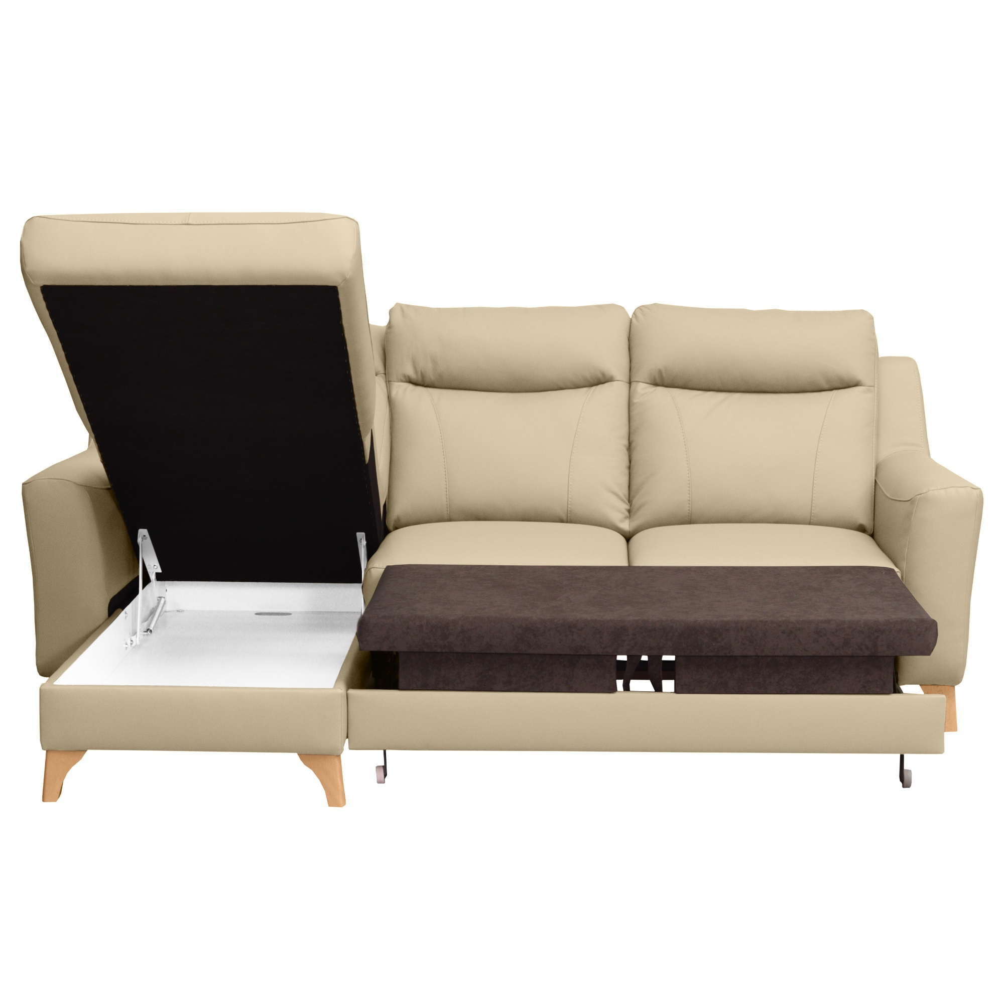 Svojou veľkosťou poskytne príjemné sedenie až 3 pre osoby. Sedadlo je tvorené vlnovými pružinami a veľmi kvalitnou studenou penou. V kombinácii s koženým poťahom sa môžete tešiť na veľmi komfortné posedenie aj po dlhšiu dobu strávenú na sedačke. Ďalej ju môžete behom chvíľky ľahko rozložiť na lôžko na občasné prespanie. Úložný priestor v otomane uschová všetky lôžkoviny, ktoré tak budete mať vždy po ruke. Nôžky z masívneho dreva zvýrazňujú nielen elegantný vzhľad gauča, ale taktiež zaistia jeho stabilitu. Priestor pod sedačkou je vďaka nim ľahko prístupný, a tak udržanie poriadku pod sedačkou nie je žiadna veda.
