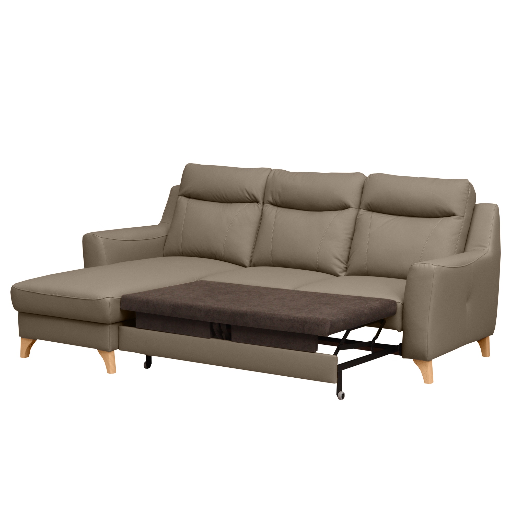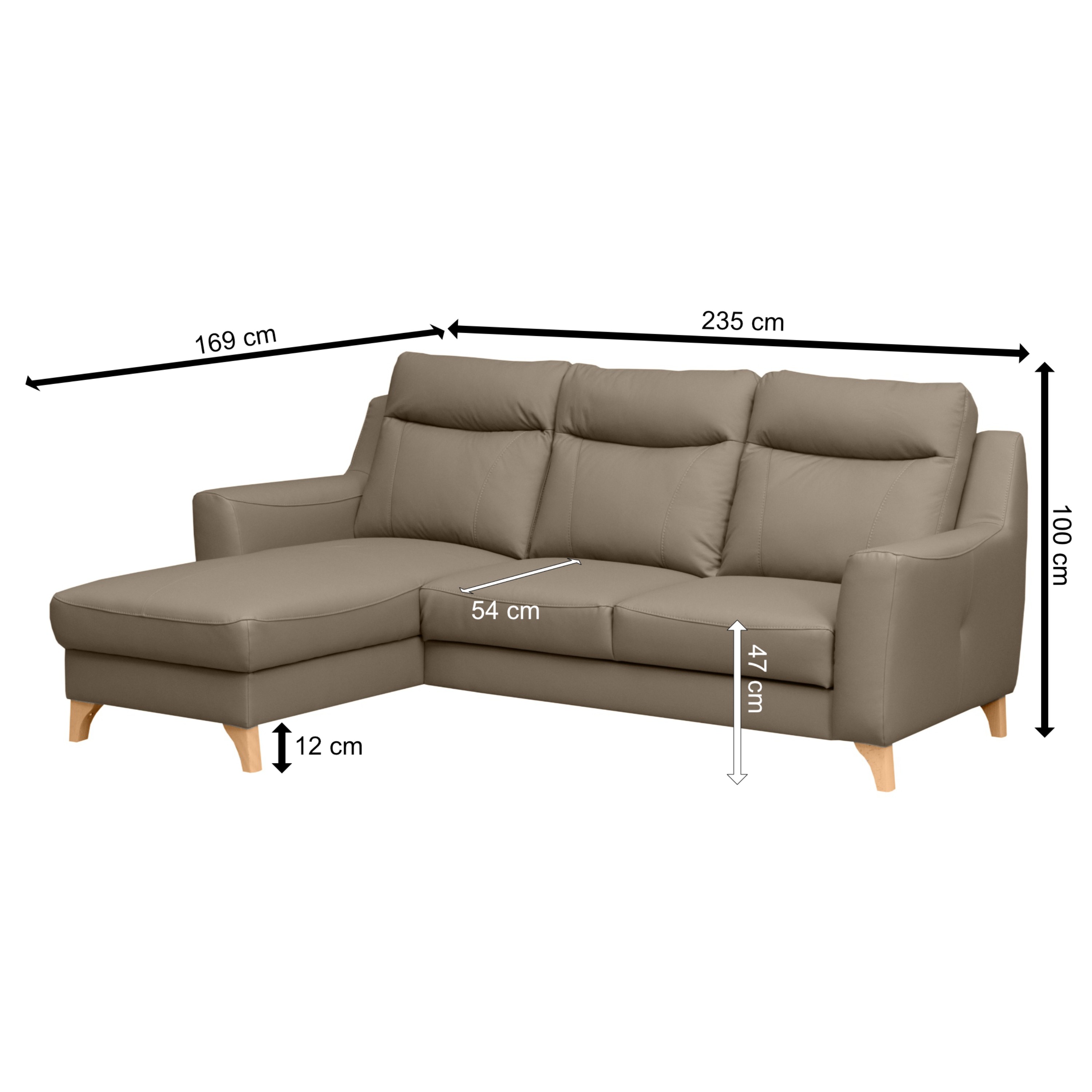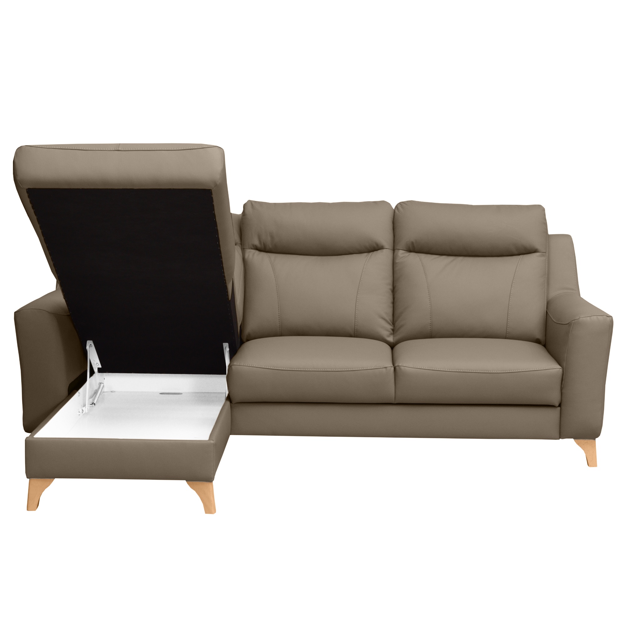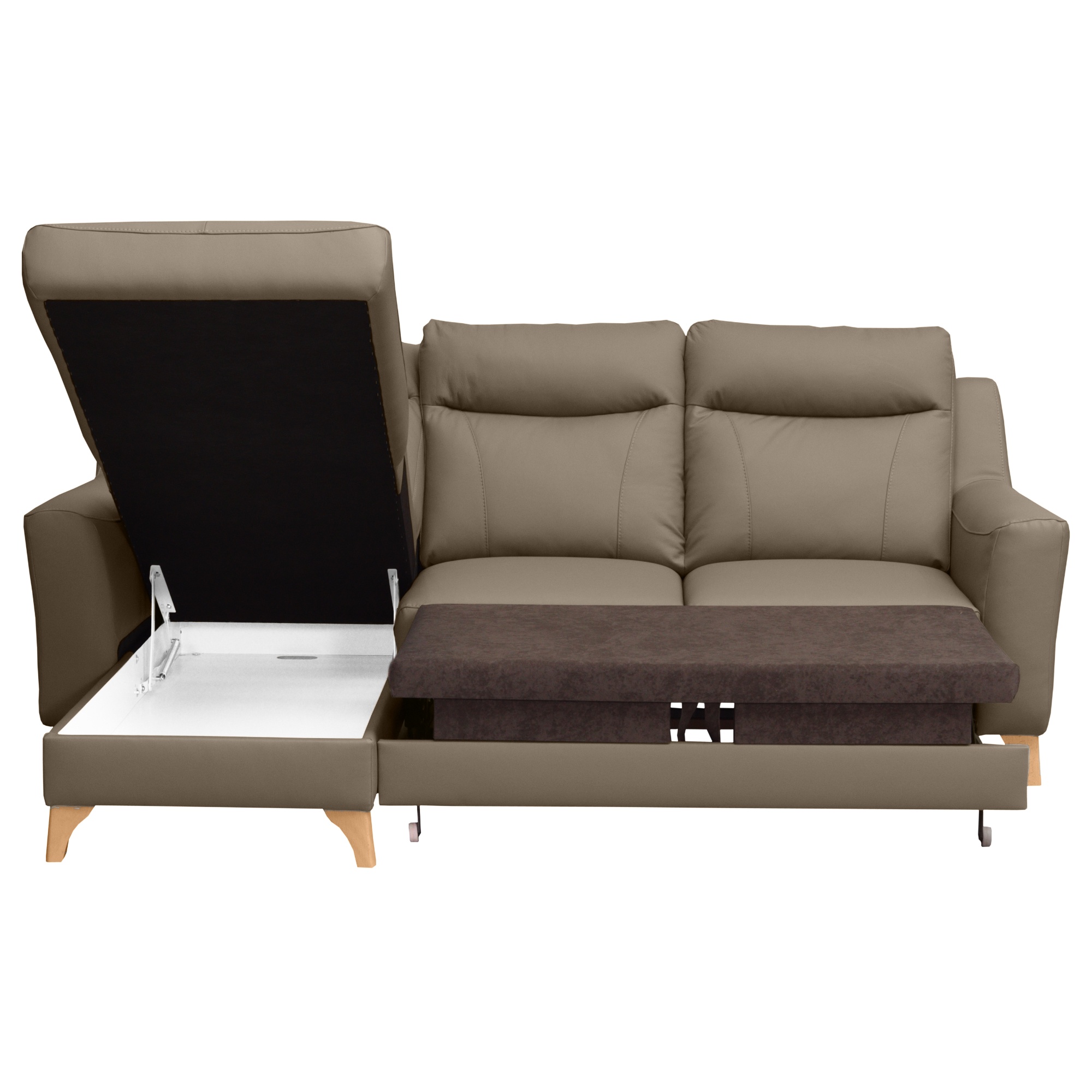 Svojou veľkosťou poskytne príjemné sedenie až 3 pre osoby. Sedadlo je tvorené vlnovými pružinami a veľmi kvalitnou studenou penou. V kombinácii s koženým poťahom sa môžete tešiť na veľmi komfortné posedenie aj po dlhšiu dobu strávenú na sedačke. Ďalej ju môžete behom chvíľky ľahko rozložiť na lôžko na občasné prespanie. Úložný priestor v otomane uschová všetky lôžkoviny, ktoré tak budete mať vždy po ruke. Nôžky z masívneho dreva zvýrazňujú nielen elegantný vzhľad gauča, ale taktiež zaistia jeho stabilitu. Priestor pod sedačkou je vďaka nim ľahko prístupný, a tak udržanie poriadku pod sedačkou nie je žiadna veda.