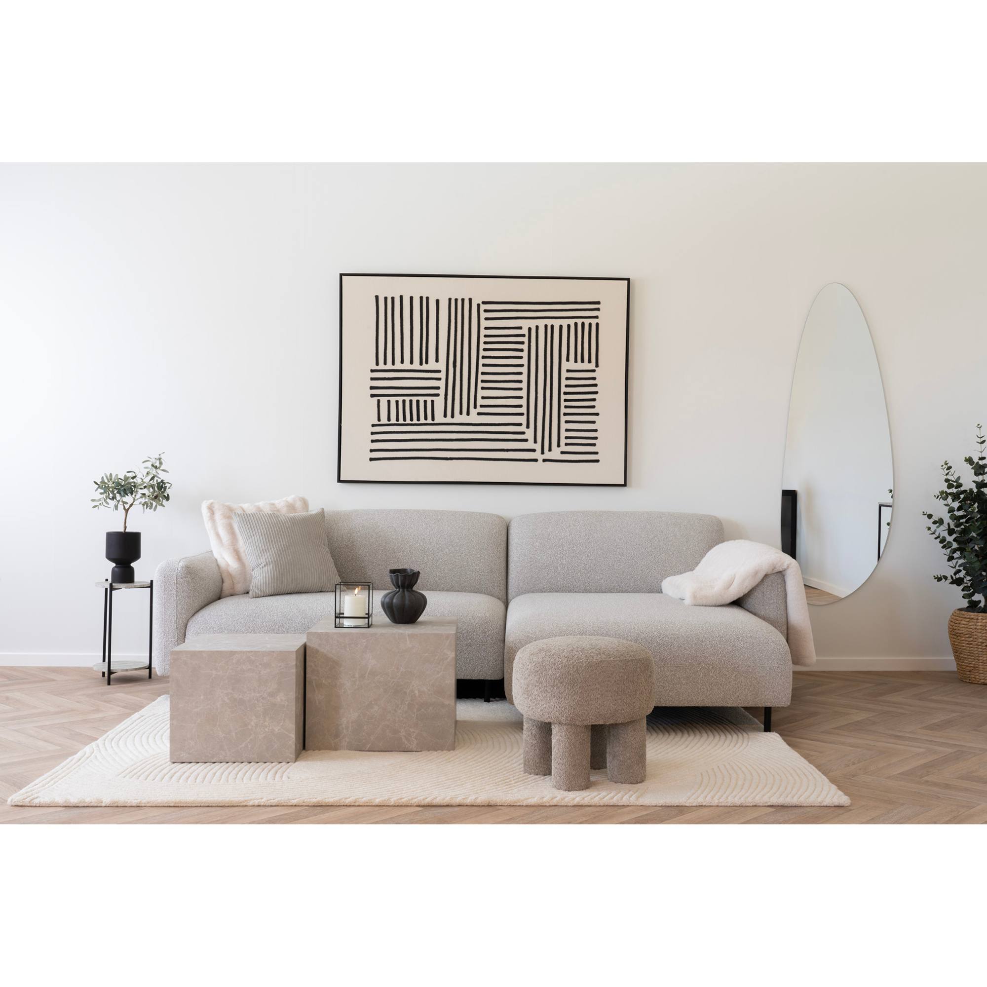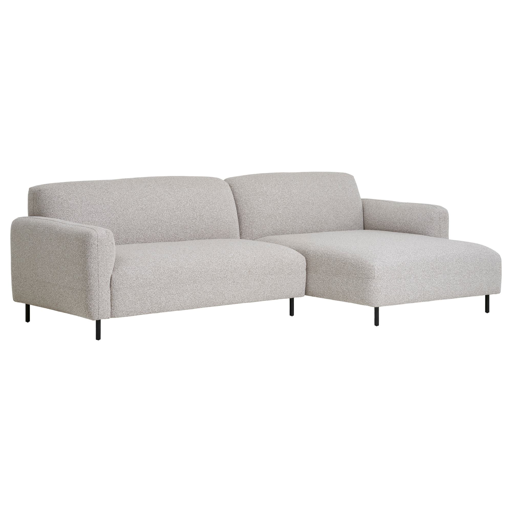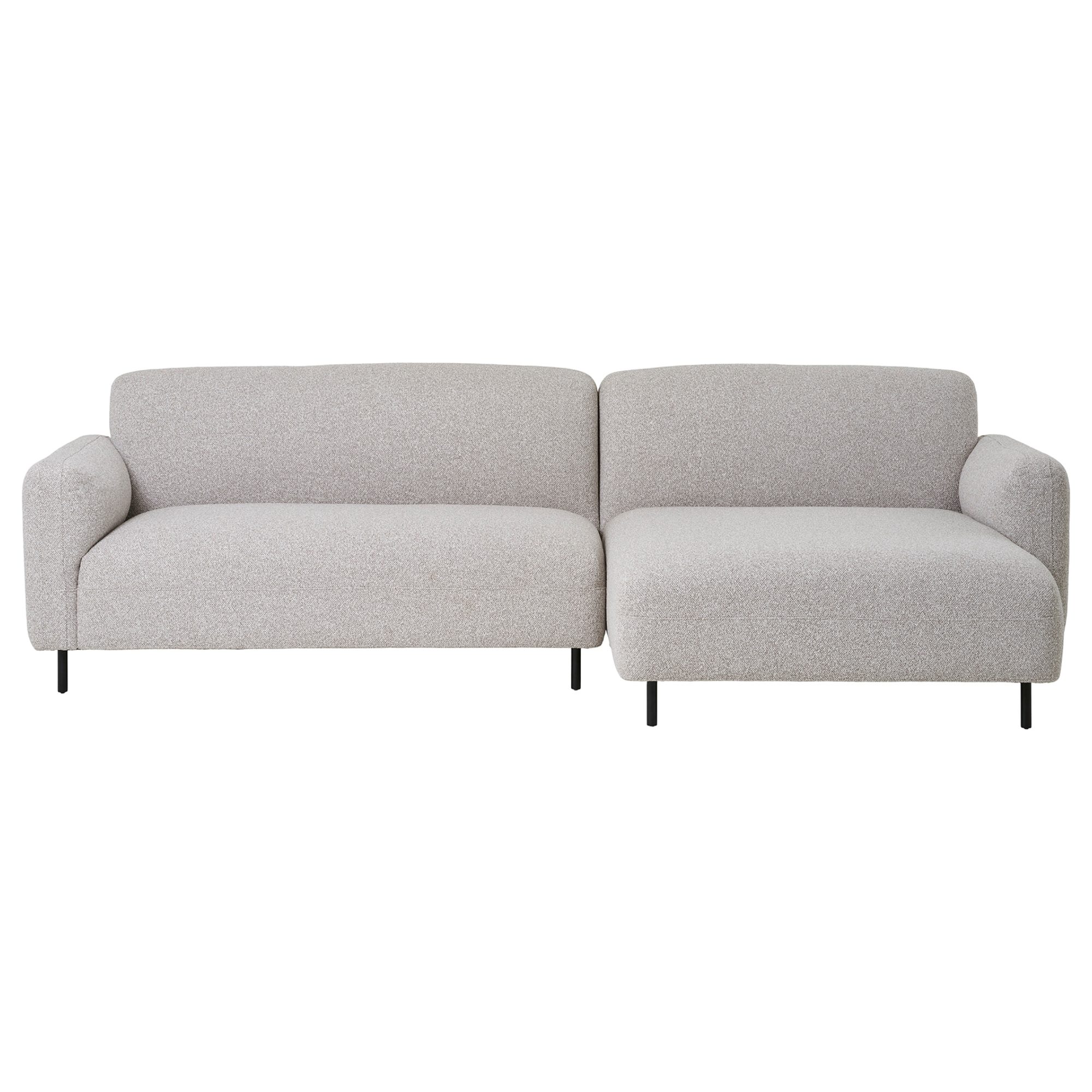 Penové jadro a poťah z hrubej tkaniny typu bouclé zdôrazňujú ladnosť a krásne tvary sedacej súpravy. Pevné kovové nôžky čiernej farby vyzerajú nielen elegantne, ale sú jedny z mnohých praktických detailov tejto sedačky.