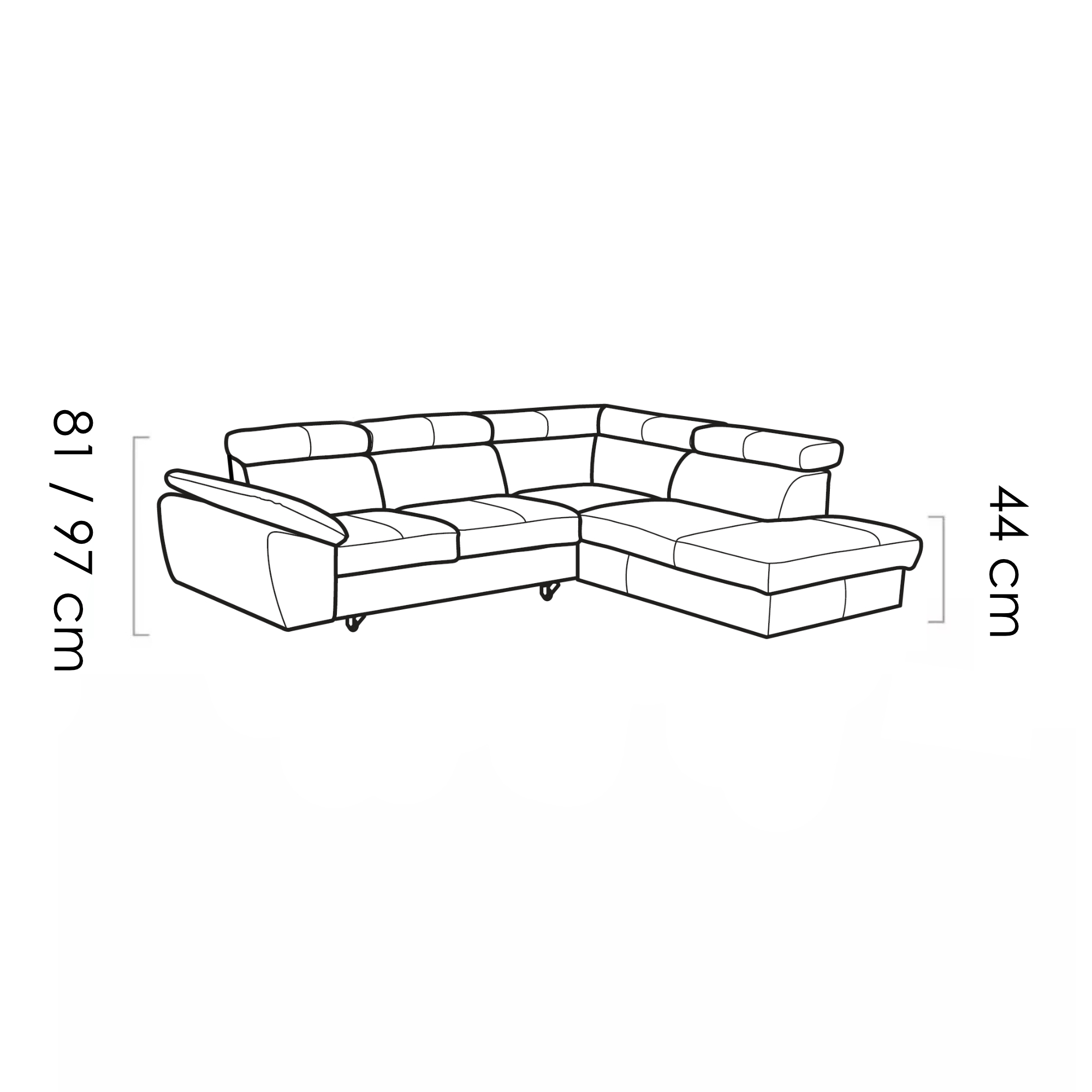 Svojou veľkosťou poskytne komfort rohového sedenia až pre 4 osoby. Sedadlo je tvorené vlnovými pružinami a veľmi kvalitnou studenou penou, čo vám poskytne mäkké sedenie. Oblé tvary a kožený poťah v kombinácii s polohovacími podhlavníkmi zase umocnia príjemný pocit z relaxácie. To všetko dohromady vytvára elegantný kút pre vás, rodinu aj návštevu.