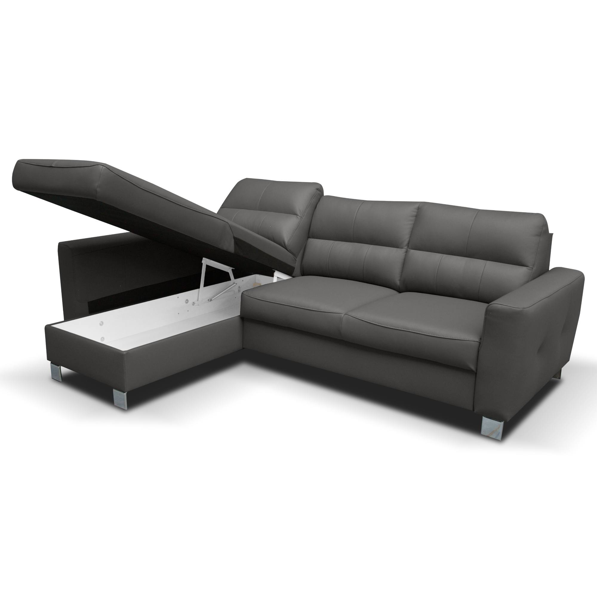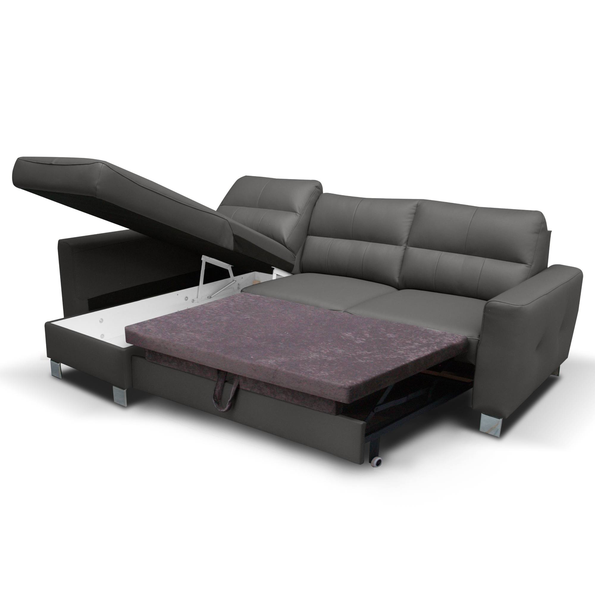 Konštrukcia z masívneho dreva disponuje vlnovým odpružením na sedadle a elastickými popruhmi v oblasti chrbtovej opierky. Maximálny komfort je dosiahnutý použitím veľmi kvalitnej studenej peny. Súprava je potiahnutá na dotyk príjemnou kožou. Postačí pár jednoduchých krokov a sedačku premeníte na lôžko na občasné prespanie. Integrovaný úložný priestor zase poskytne miesto na lôžkoviny. Vďaka pochrómovaným nôžkam pôsobí sedačka ľahko, a navyše sa pod ňou jednoducho bude udržiavať poriadok.