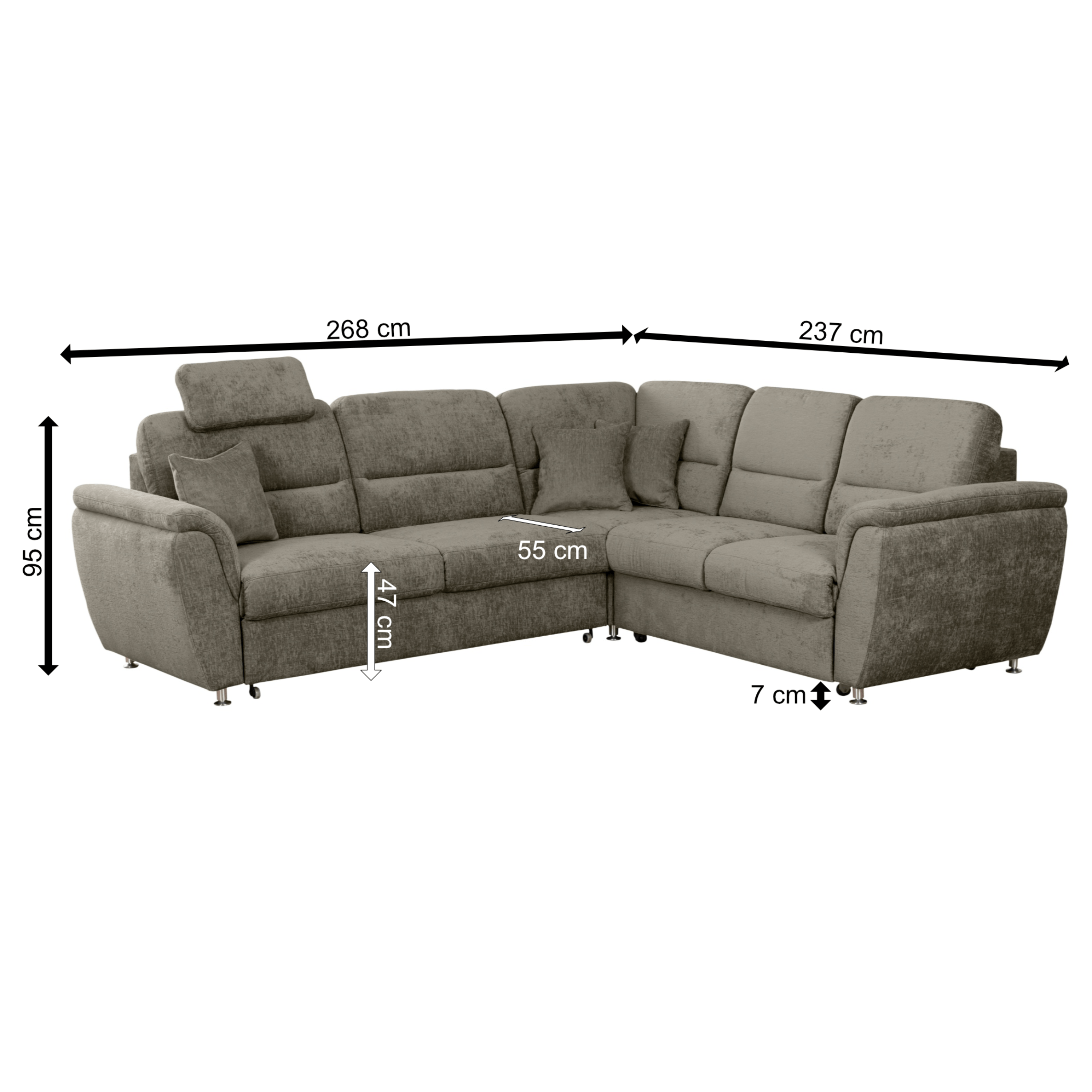 Vďaka svojej veľkosti a vlnovému odpruženiu v kombinácii so studenou penou poskytne veľmi komfortné sedenie pre viac osôb. Sedacia súprava disponuje pohodlnými chrbtovými operadlami, podrúčkami, podhlavníkom a dekoračnými vankúšikmi na dosiahnutie maximálneho pohodlia. Sedačku je možné v prípade potreby rozložiť na lôžko, ktoré sa dá využiť na občasné prespanie. Funkčná konštrukcia obsahuje aj skrytý úložný priestor s ľahkým prístupom, kam uschováte nepoužívané lôžkoviny. Potrebnú stabilitu zaisťujú kovové nohy vo farbe kovu. Celočalúnené vyhotovenie vám umožňuje sedaciu súpravu umiestniť aj voľne do priestoru.