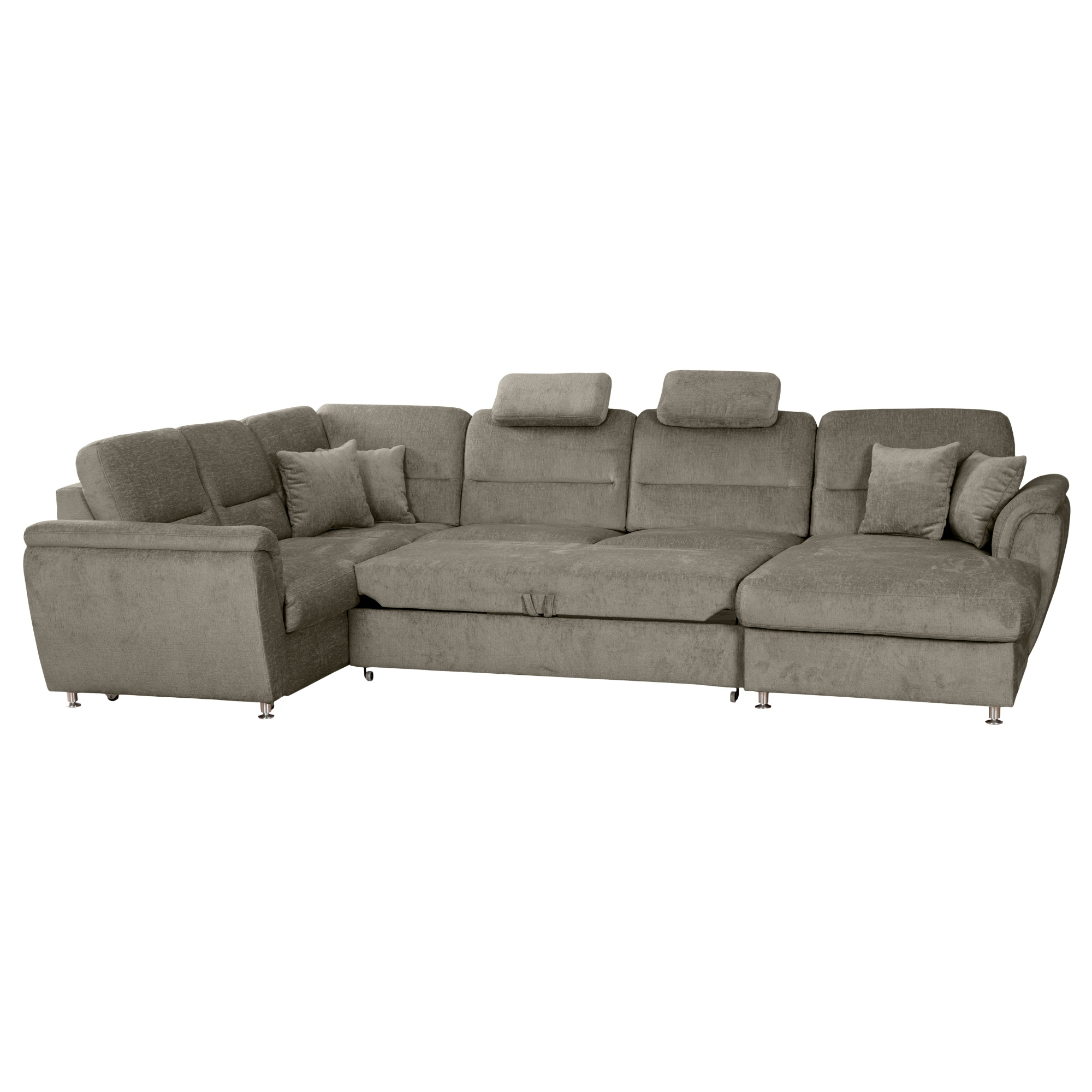 Sedačku je možné v prípade potreby rozložiť na lôžko, ktoré sa dá využiť na občasné prespanie. Funkčná konštrukcia obsahuje aj skryté úložné priestory s ľahkým prístupom, kam uschováte nepoužívané lôžkoviny. Potrebnú stabilitu zaisťujú kovové nohy vo farbe kovu. Celočalúnené vyhotovenie vám umožňuje sedaciu súpravu umiestniť aj voľne do priestoru.