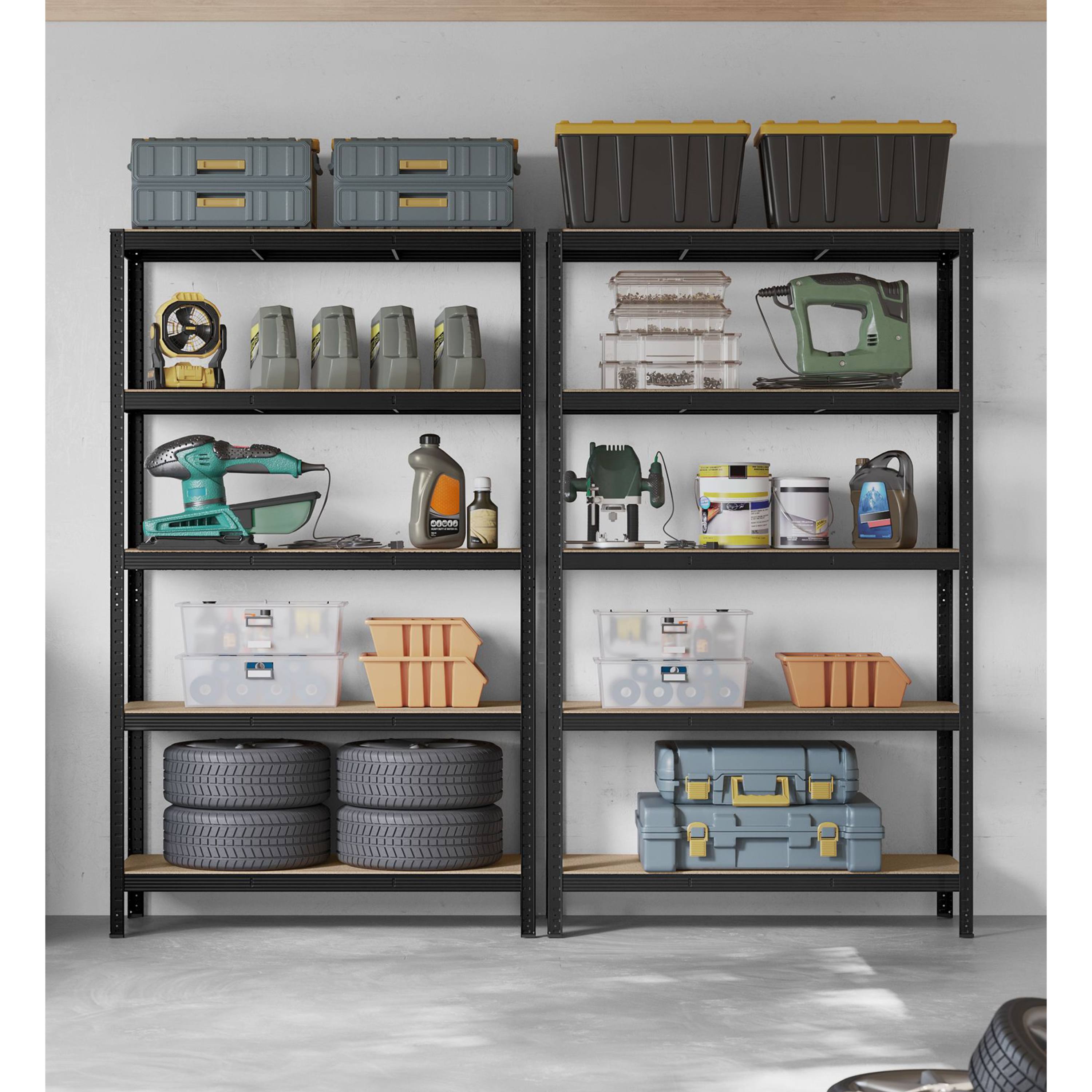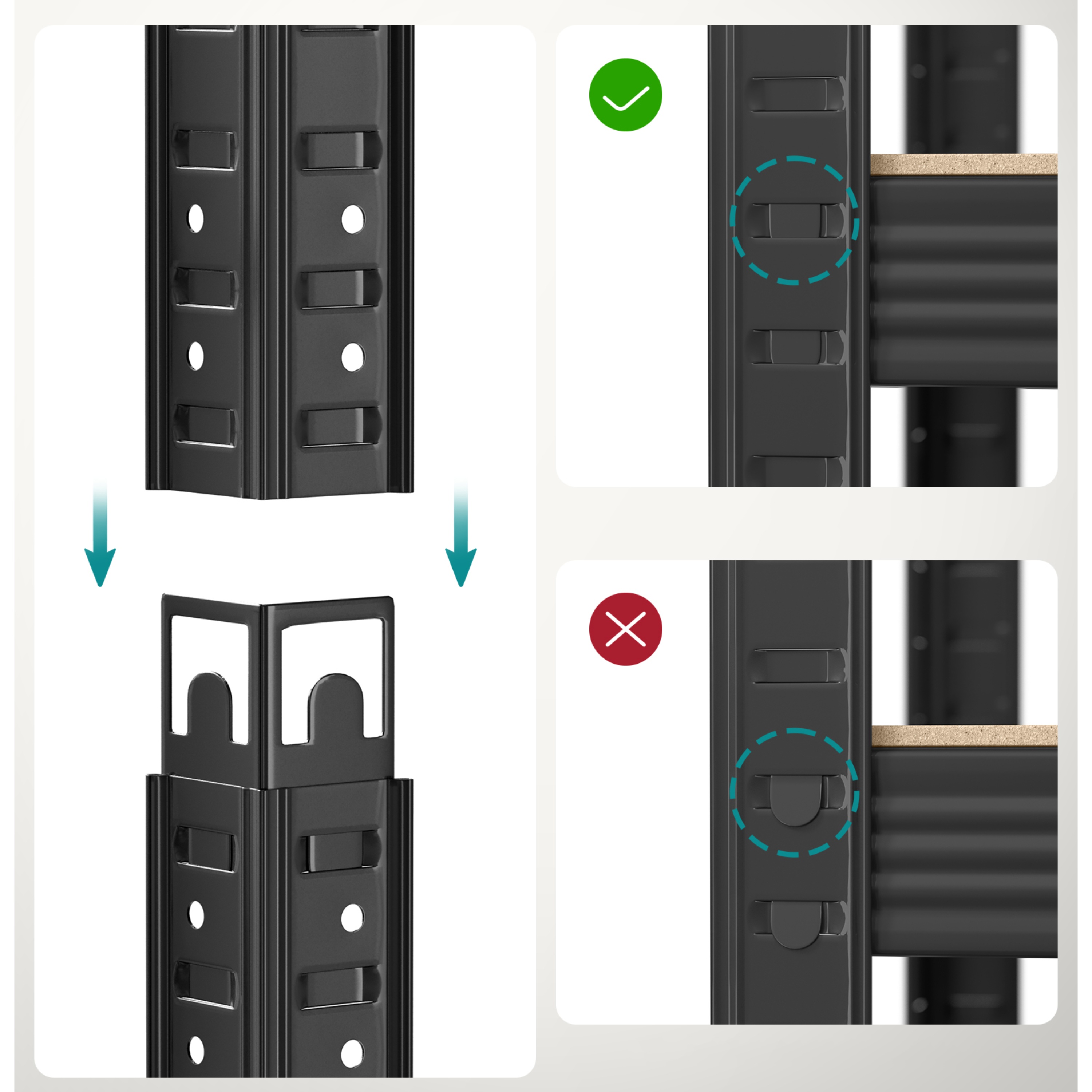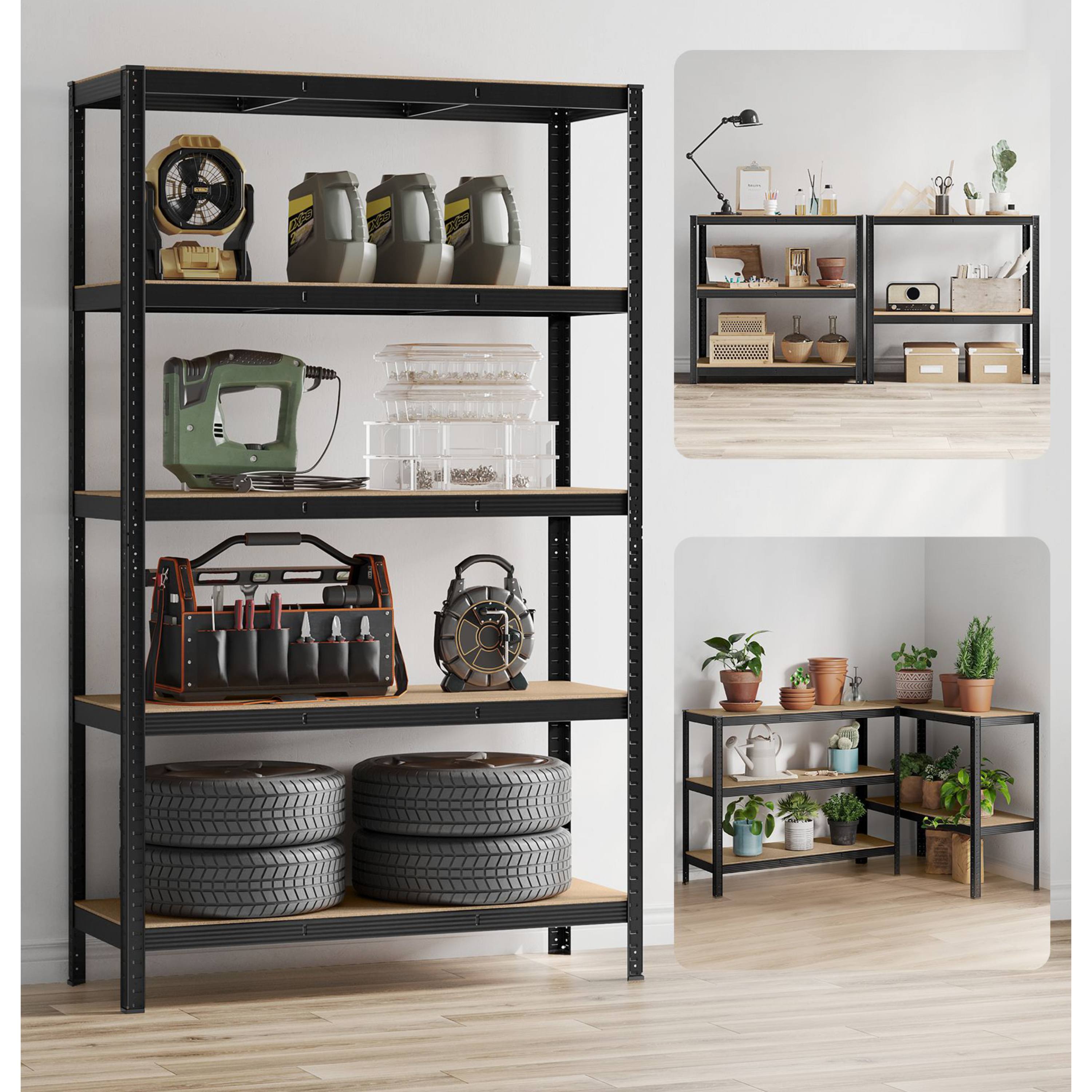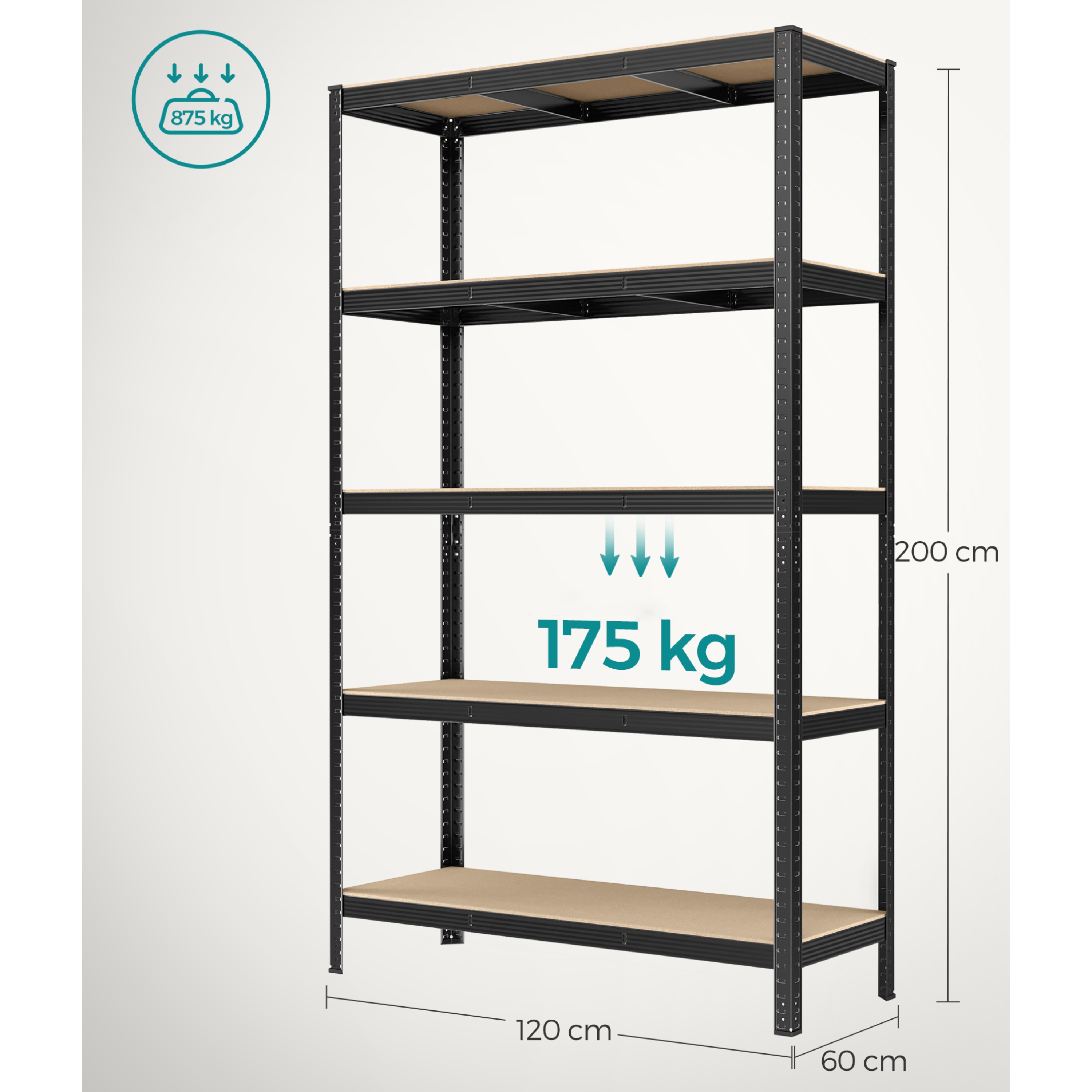 Zosilnený rám je vyrobený z kvalitnej ocele a jednotlivé police sú vyhotovené z drevovláknitej dosky. Priečky pod každou policou im dodávajú potrebnú oporu. Každá polica má nosnosť až 175 kg. Nemusíte sa teda obávať uloženia predmetov s vyššou váhou. Regál disponuje tiež ochranou proti prevráteniu a nehrozí tak nebezpečenstvo úrazu. Police sú voliteľne nastaviteľné a regál môžete rozložiť na dva menšie samostatné kusy.