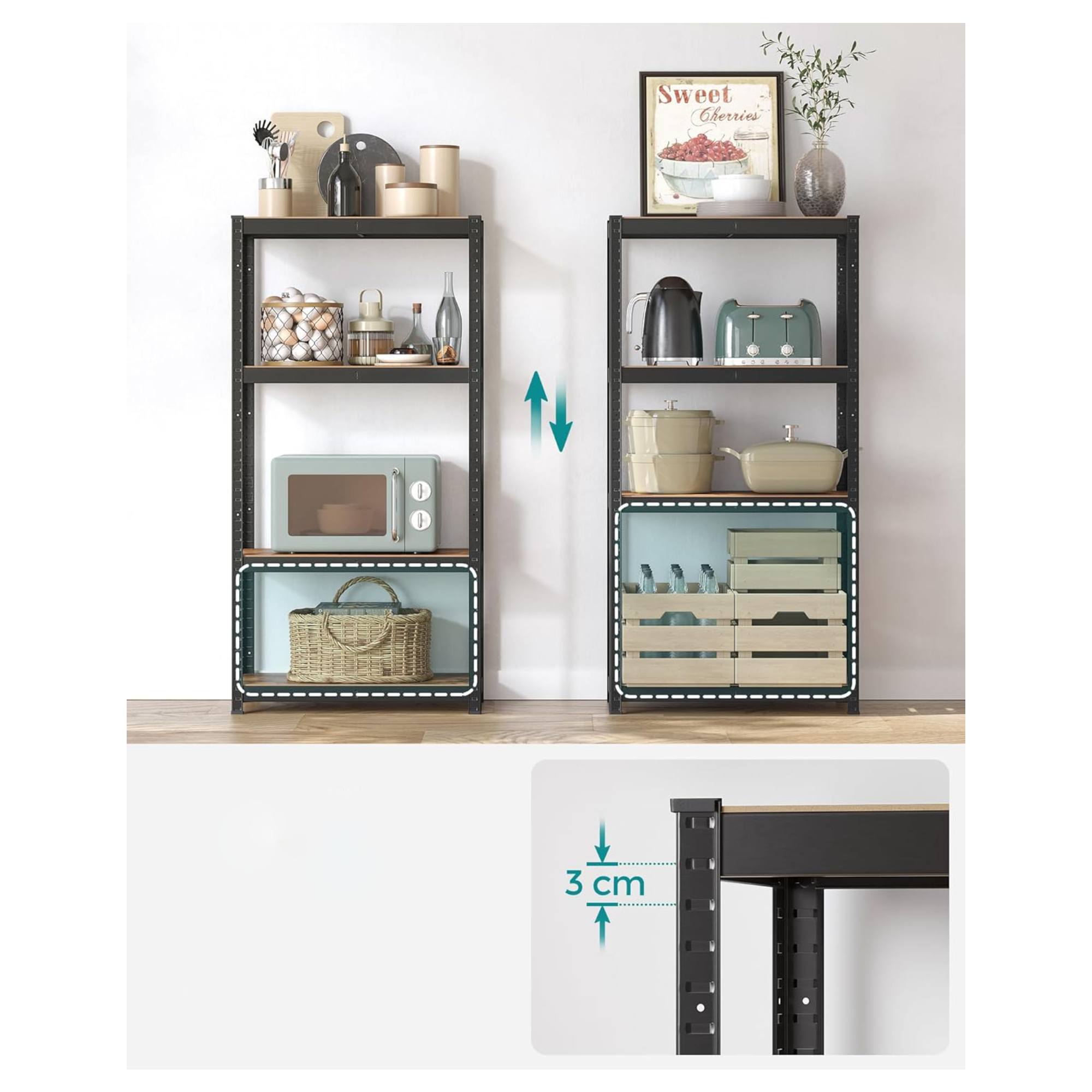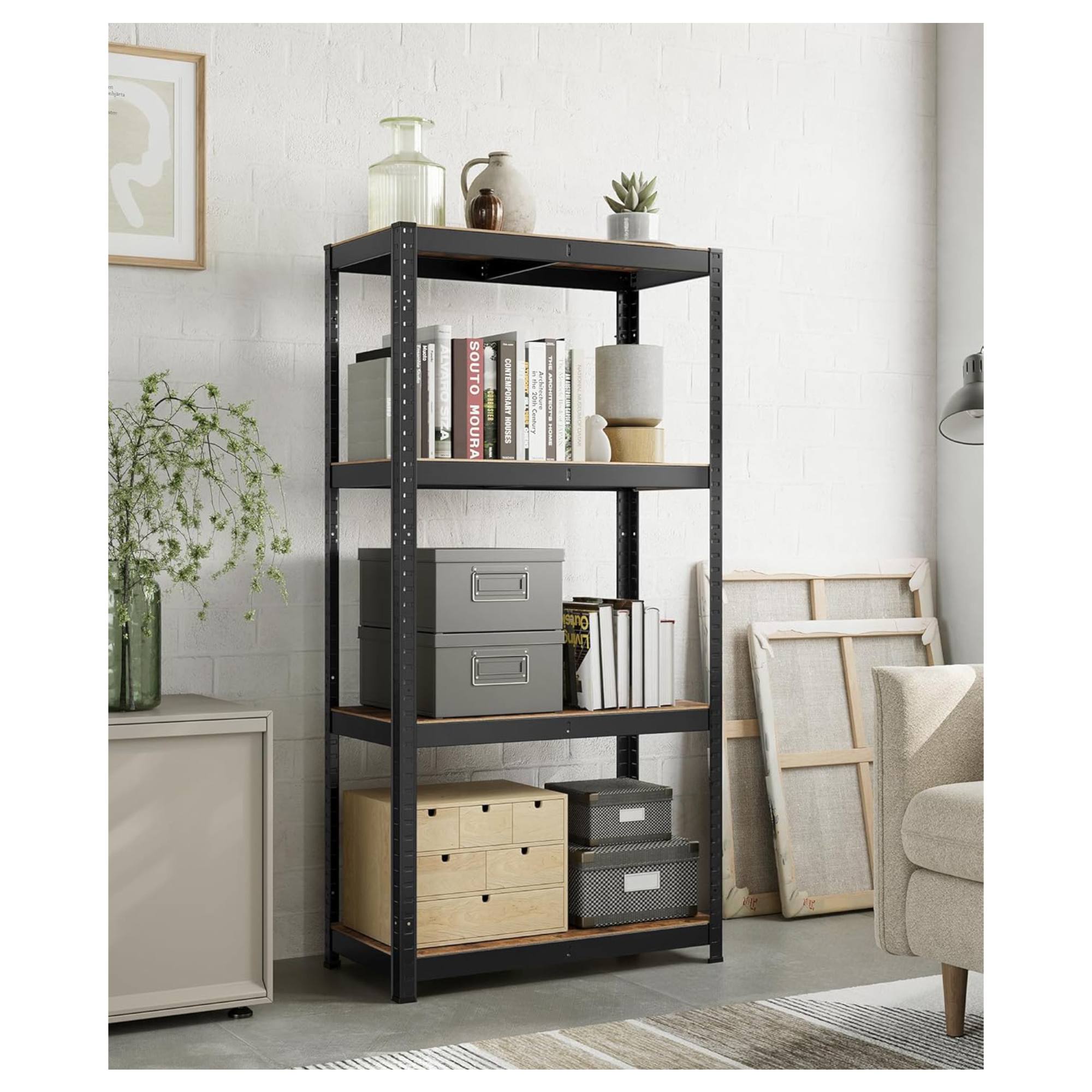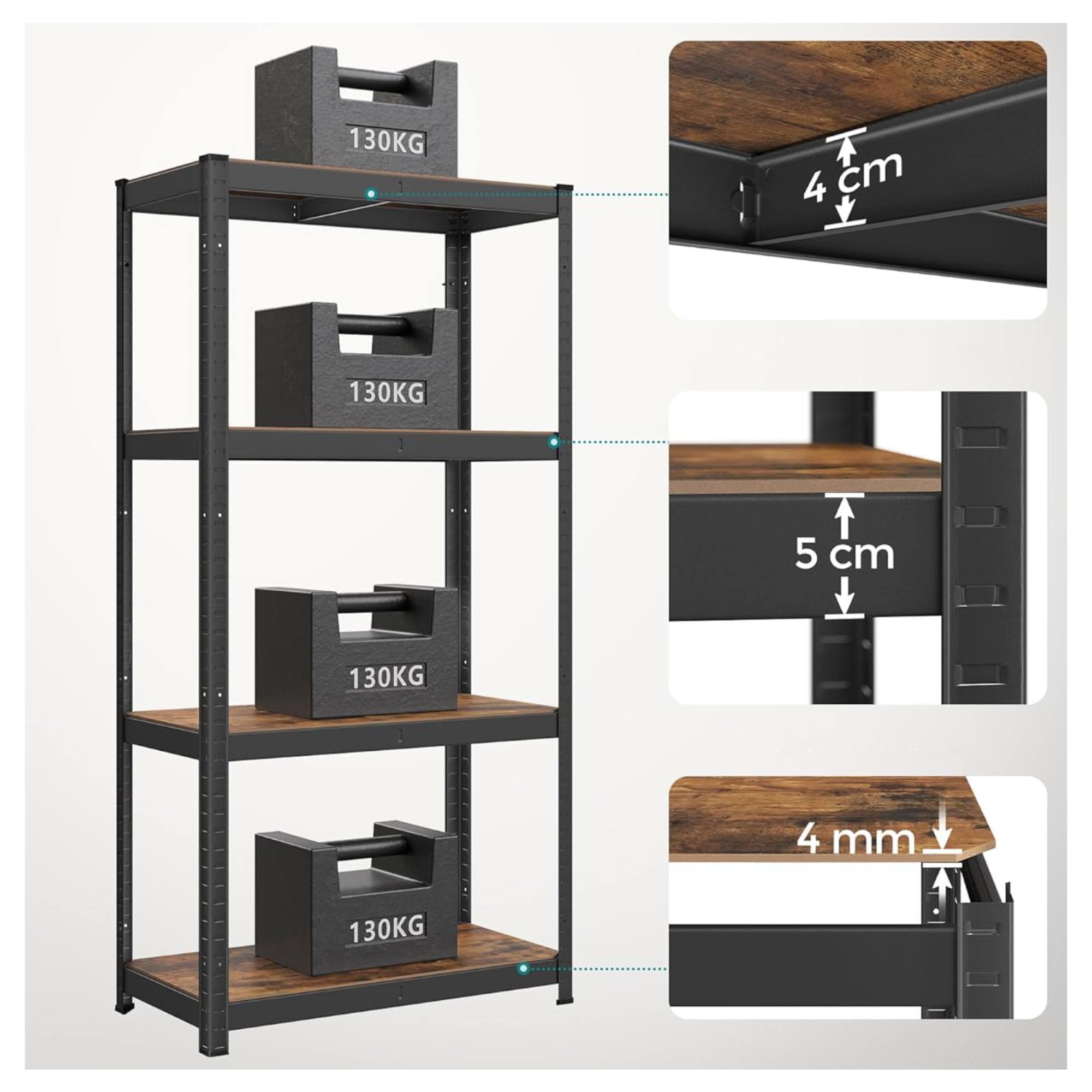 Má pevnú oceľovú konštrukciu, ktorú dopĺňajú 4 police z drevovláknitej MDF dosky. Každá polica má nosnosť 130 kg a je zosilnená priečnou tyčou, ktorá zabezpečí bezpečné uloženie aj ťažších predmetov. Všetky police sú nastaviteľné po 3 cm, poskytujú teda jednoduché prispôsobenie vašim potrebám. Praktické vyhotovenie umožňuje aj rozdelenie na 2 samostatné časti.
