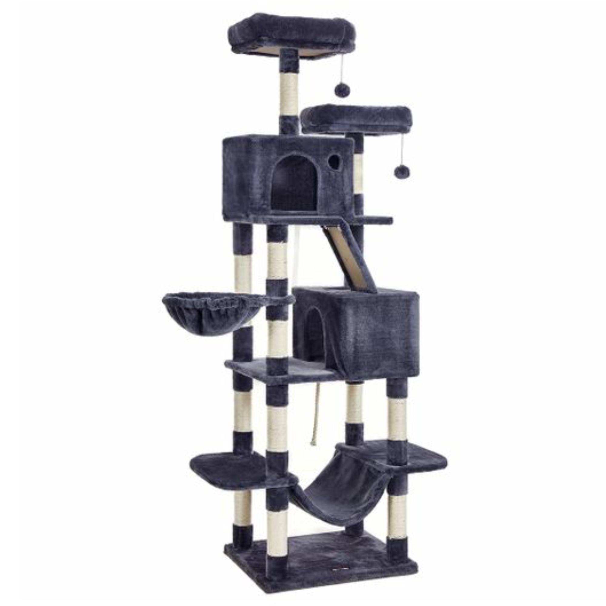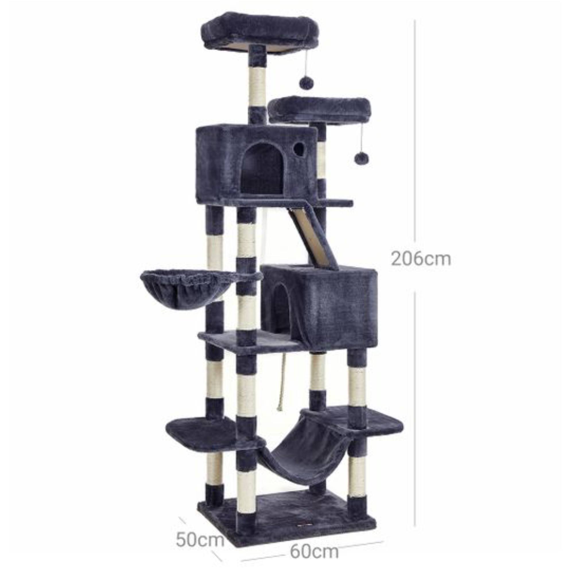 XXL mačací strom ACADEMIA poskytne pre vaše mačky plno zábavy a zároveň plno priestoru na relaxáciu. Obsahuje dve veľké jaskyne, dve nadýchané vyhliadkové plošiny, hojdacia sieť s ležadlom a loptičky na povrázku pre extra zábavu. Disponuje tiež sisalovými stĺpikmi, aby vaša mačička mala vždy nabrúsené pazúriky. Konštrukcia je vyrobená z kvalitnej drevotrieskovej dosky, ktorá je čalúnená hebkou plyšovou látkou.