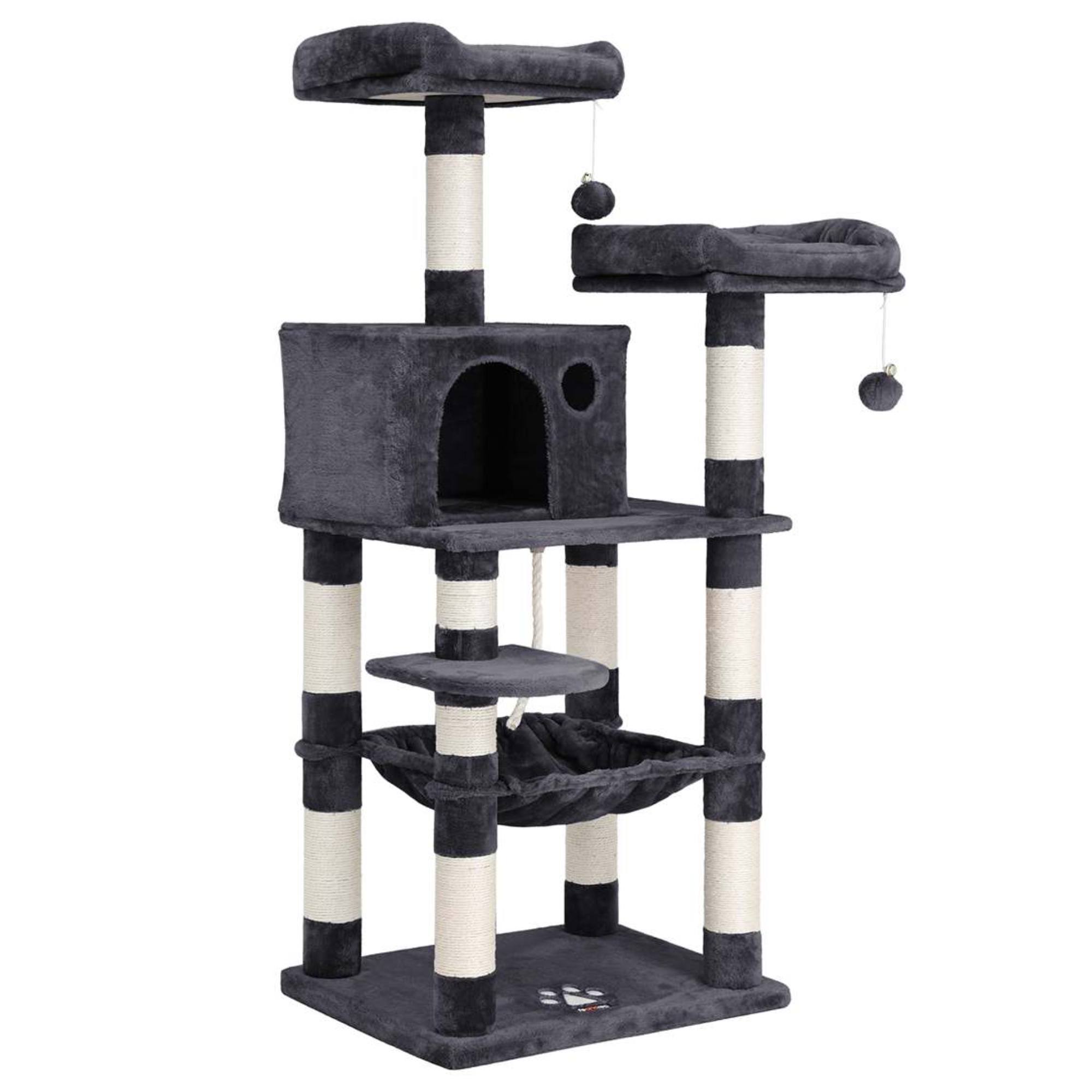 Z mačacieho stromu KATTY bude mať vaša mačka dokonalý výhľad na všetko, čo sa deje vo vašom byte. Nájde tu až štyri pelechy, z toho jeden domček, takže o zábavu bude mať vždy postarané. Konštrukcia je vyrobená z kvalitného MDF materiálu, ktorý je čalúnený hebkou plyšovou látkou. Omotaný odolný sisal vaša mačička využije na brúsenie pazúrikov.