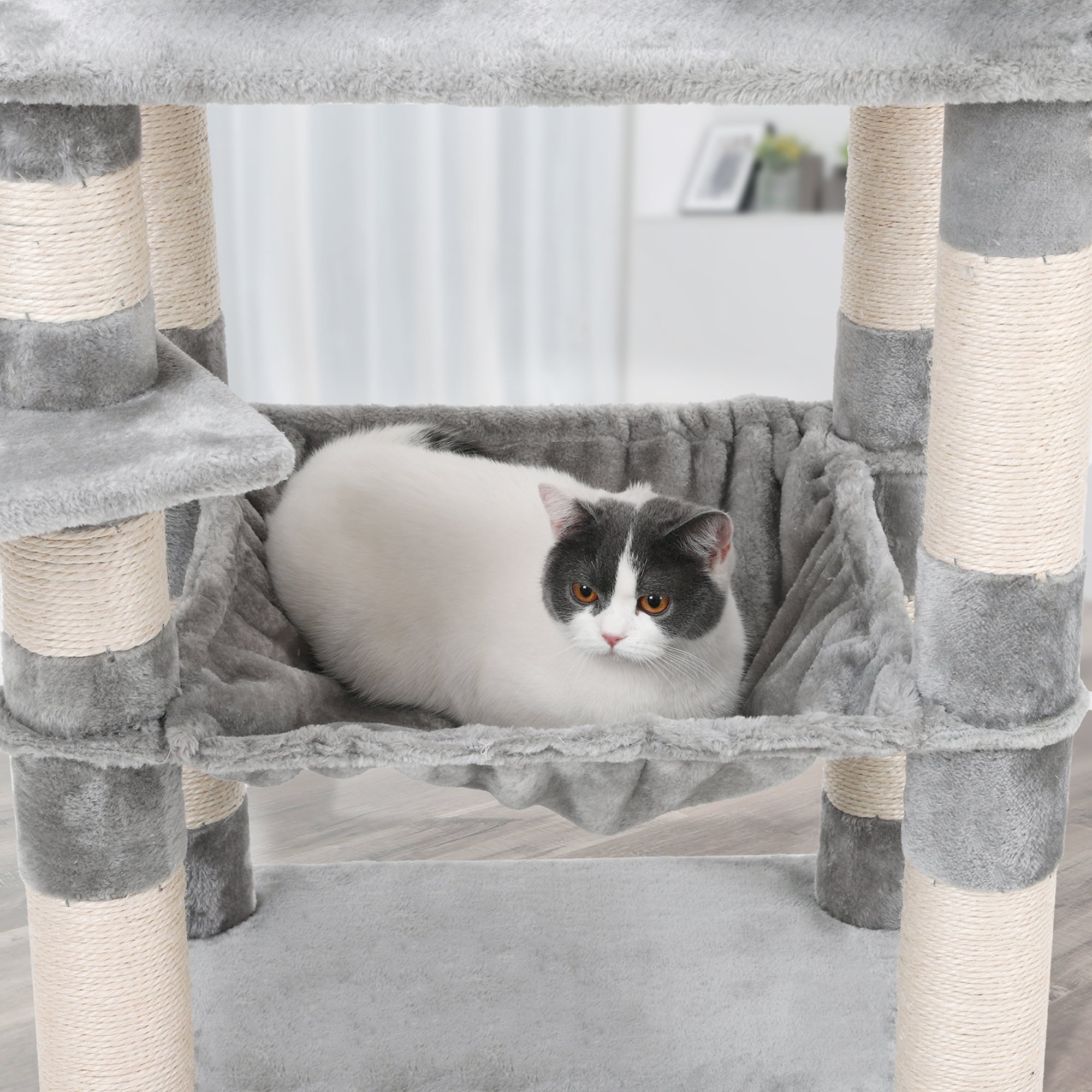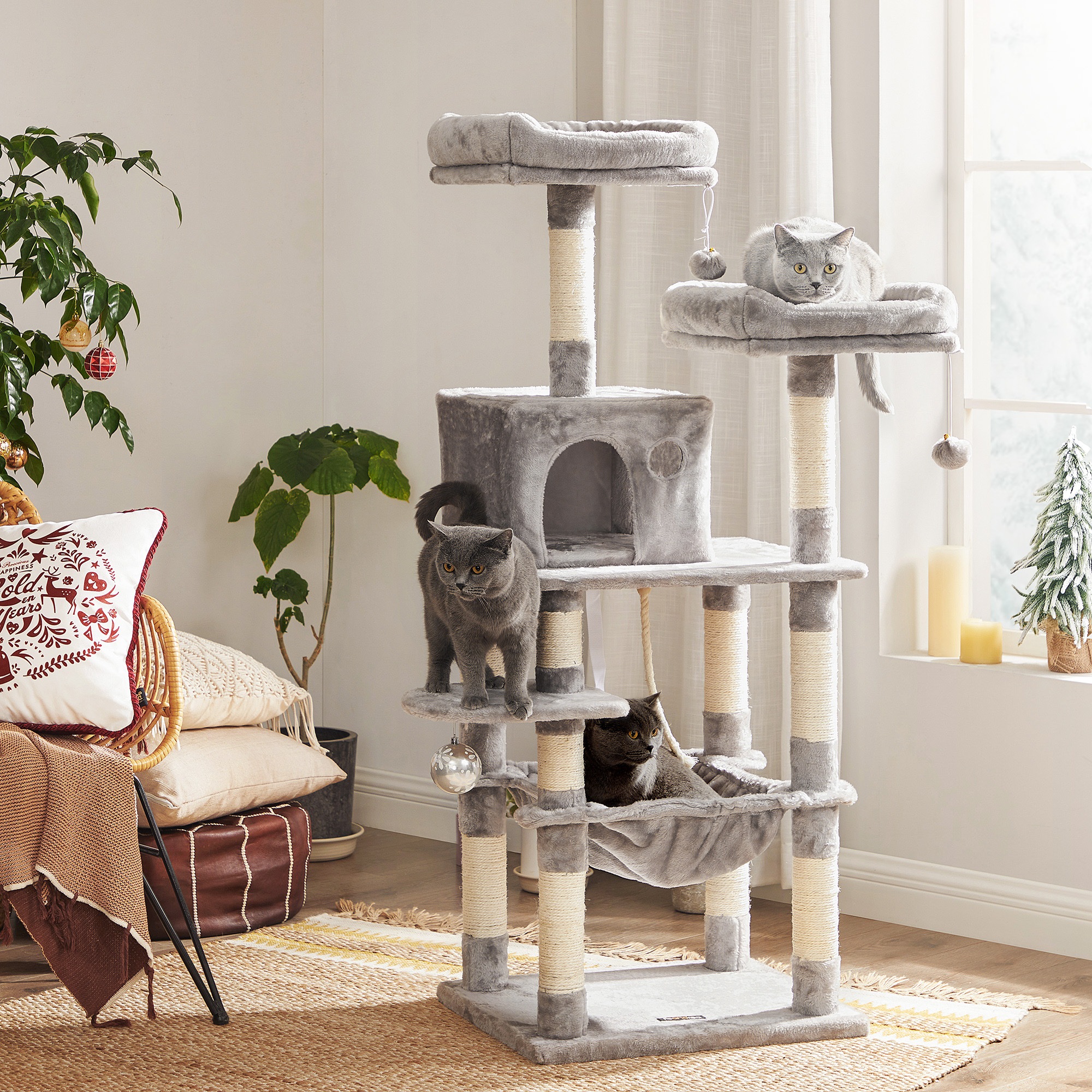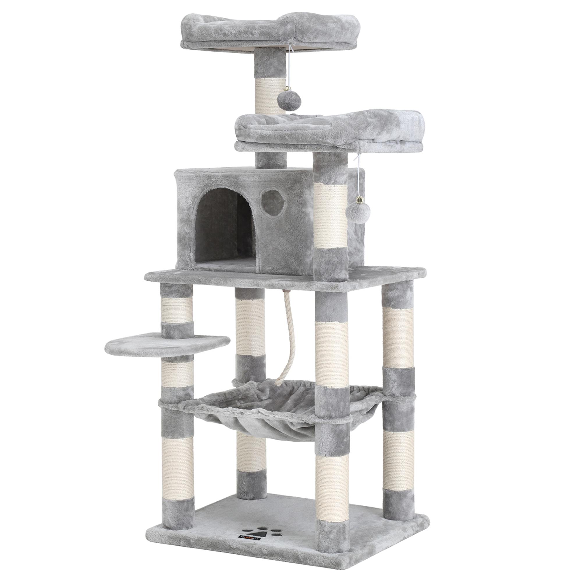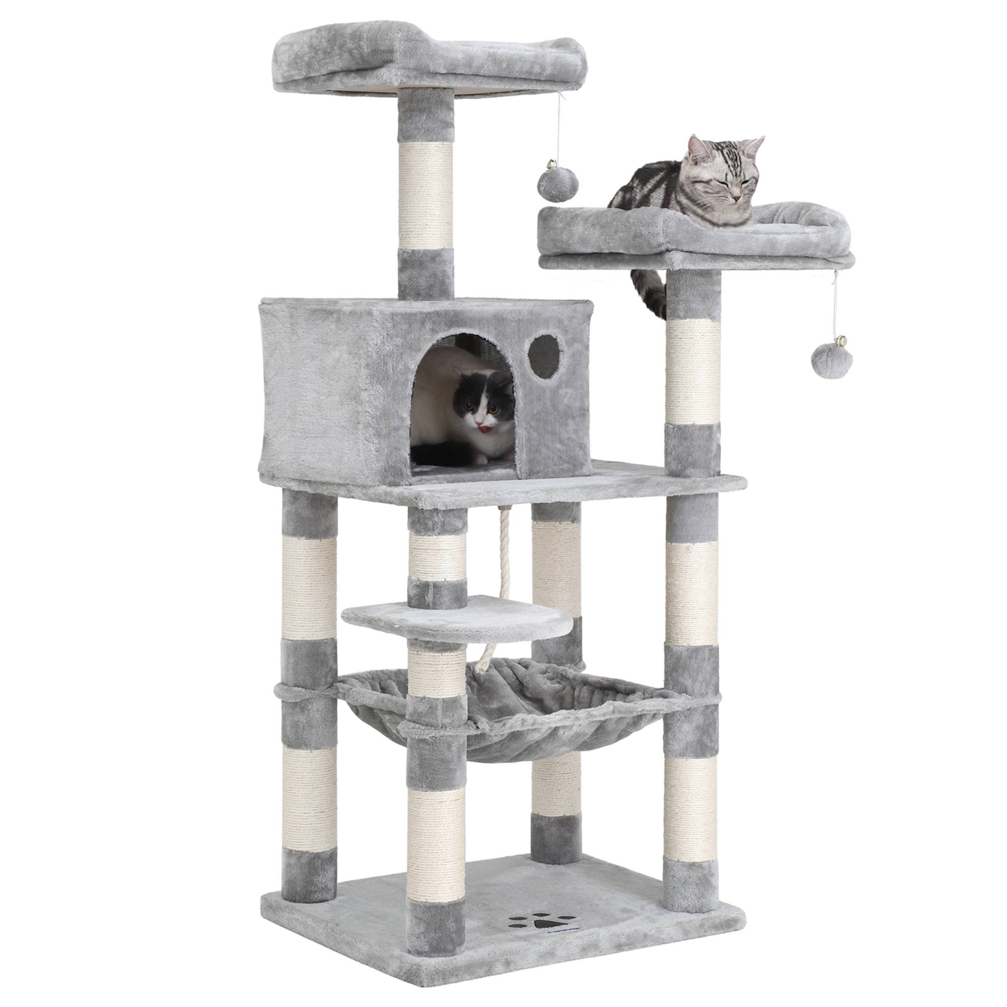 Z mačacieho stromu KATTY bude mať vaša mačka dokonalý výhľad na všetko, čo sa deje vo vašom byte. Nájde tu až štyri pelechy, z toho jeden domček, takže o zábavu bude mať vždy postarané. Konštrukcia je vyrobená z kvalitného MDF materiálu, ktorý je čalúnený hebkou plyšovou látkou. Omotaný odolný sisal vaša mačička využije na brúsenie pazúrikov.