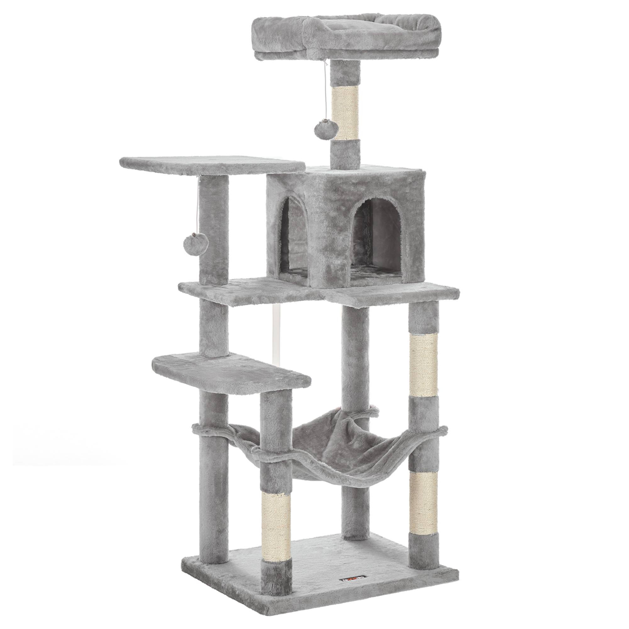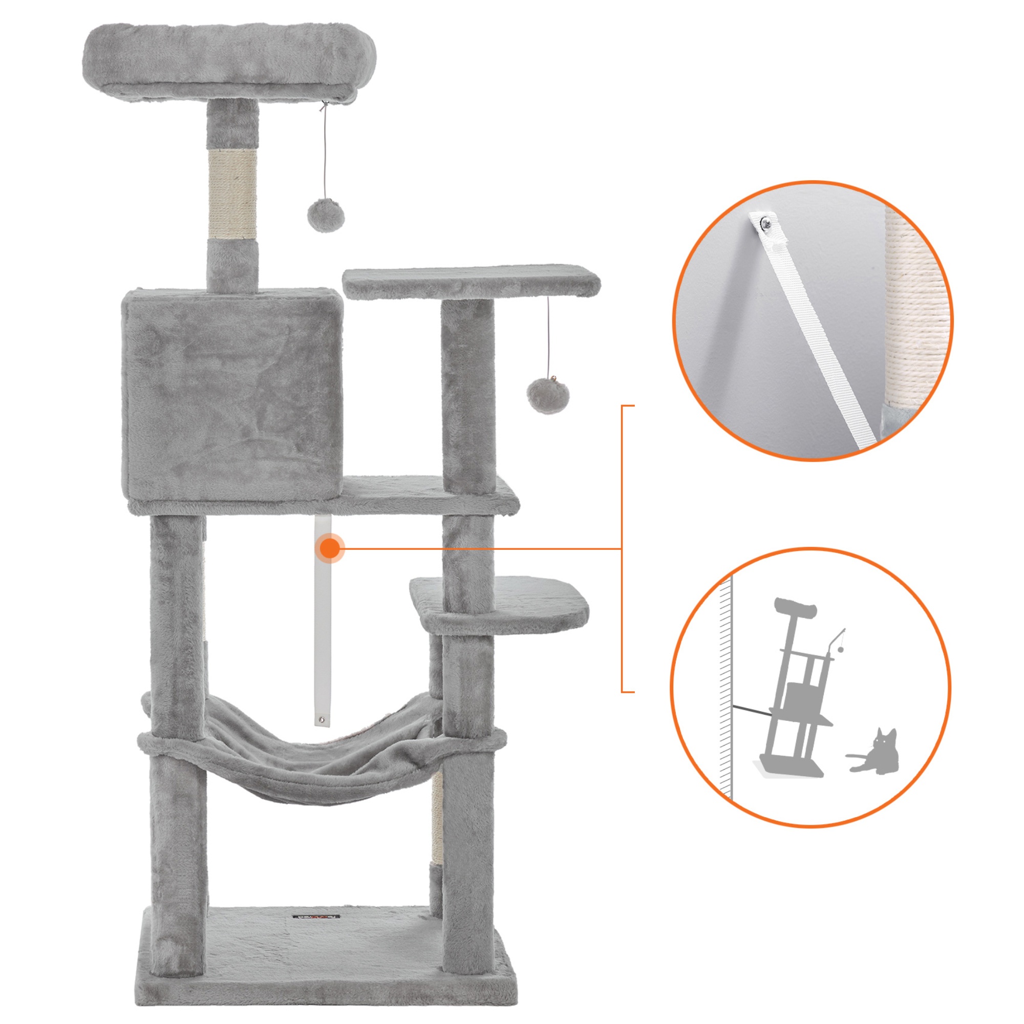 Tento útulný mačací strom URIUS II sa stane miestom pre jednu alebo viac potulujúcich sa mačiek. Obsahuje vyhliadkovú plošinu, pohodlnú jaskyňu, nadýchané ležadlo na relaxáciu a loptičky na povrázku na zábavu. Sisalové stĺpiky sa postarajú, aby vaša mačička mala vždy nabrúsené pazúriky. Konštrukcia je vyrobená z kvalitnej drevotrieskovej dosky, ktorá je čalúnená hebkou plyšovou látkou.