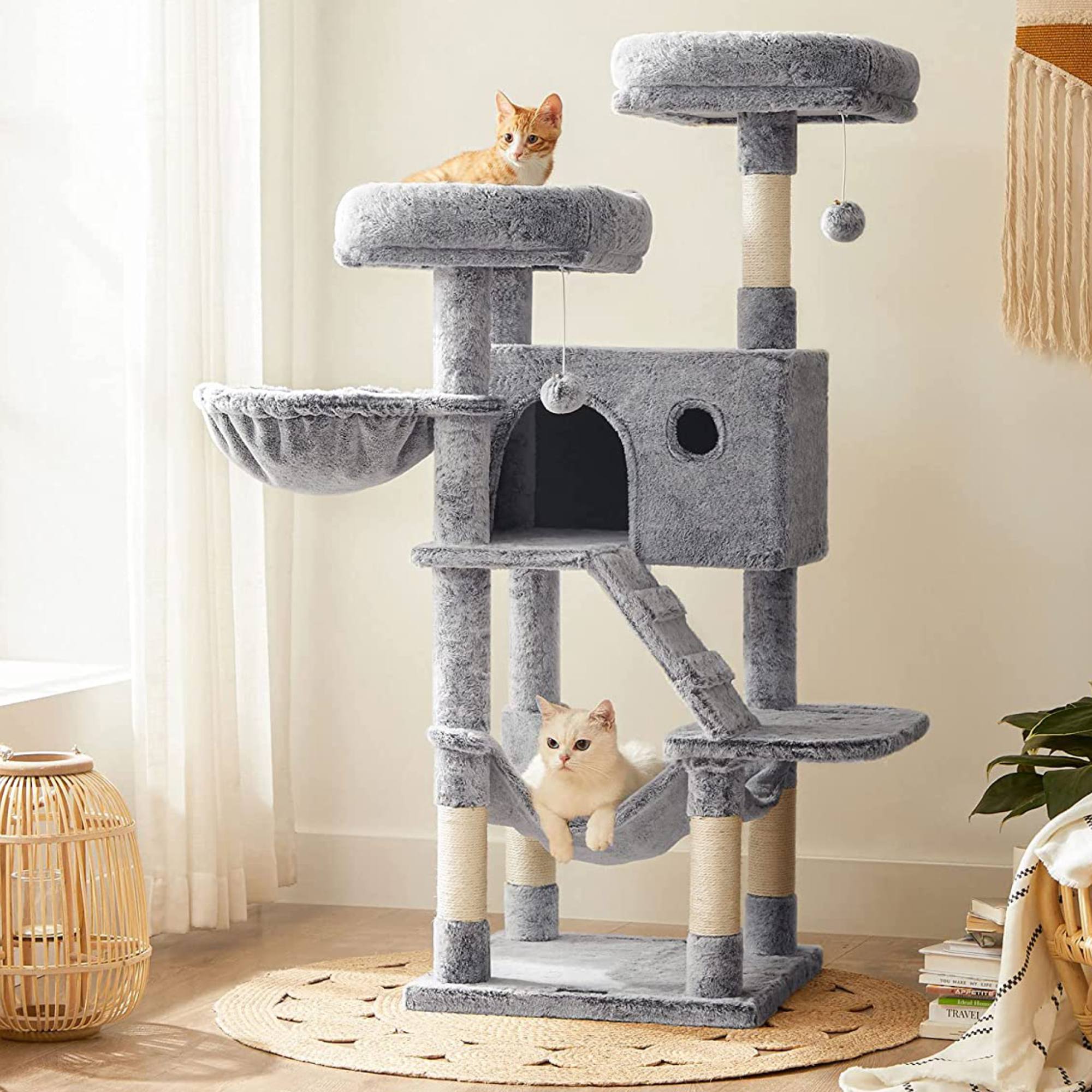 Tento útulný mačací strom URIUS III sa stane miestom pre jednu alebo viac potulujúcich sa mačiek. Obsahuje dve vyhliadkové plošiny, pohodlnú jaskyňu, hojdaciu sieť s ležadlom a loptičky na povrázku pre zábavu. Sisalové stĺpiky sa postarajú, aby vaša mačička mala vždy nabrúsené pazúriky. Konštrukcia je vyrobená z kvalitnej drevotrieskovej dosky, ktorá je čalúnená hebkou plyšovou látkou.