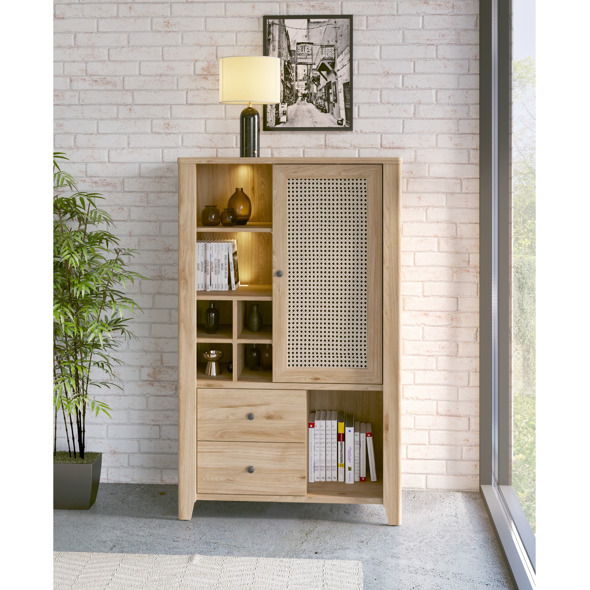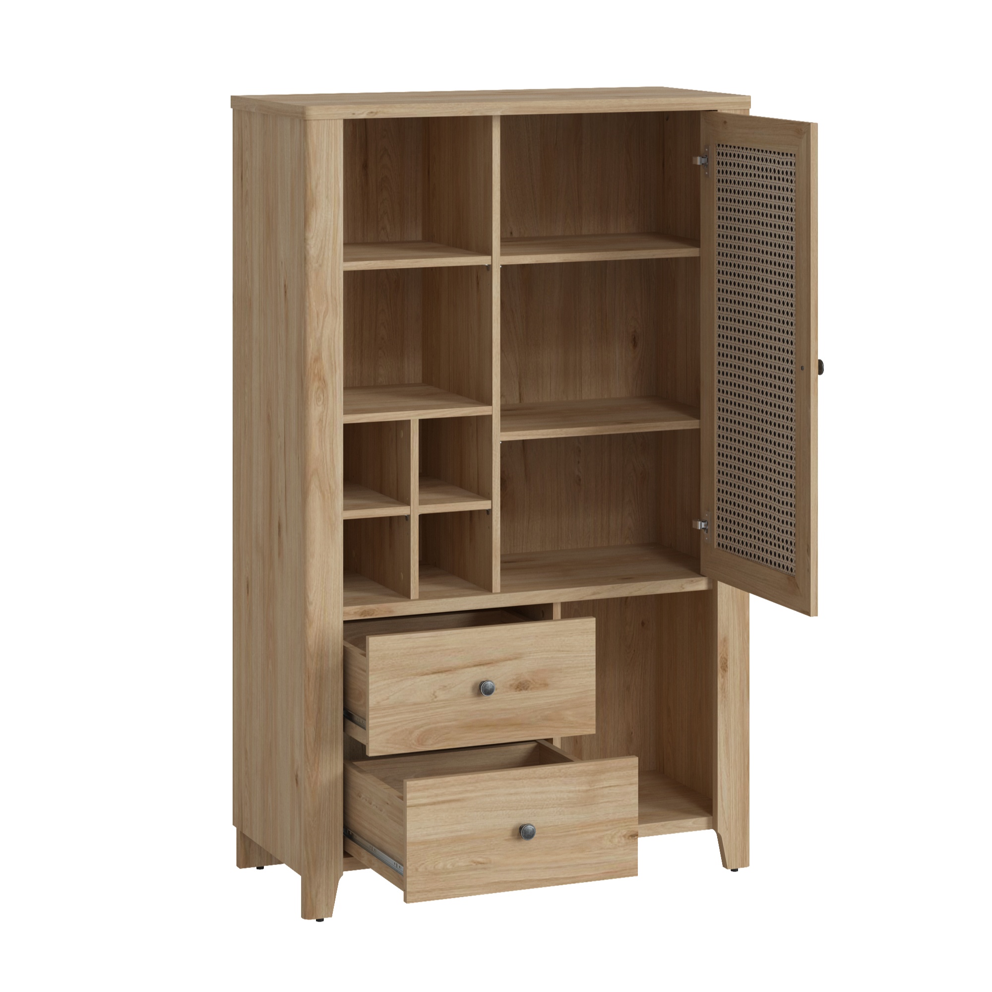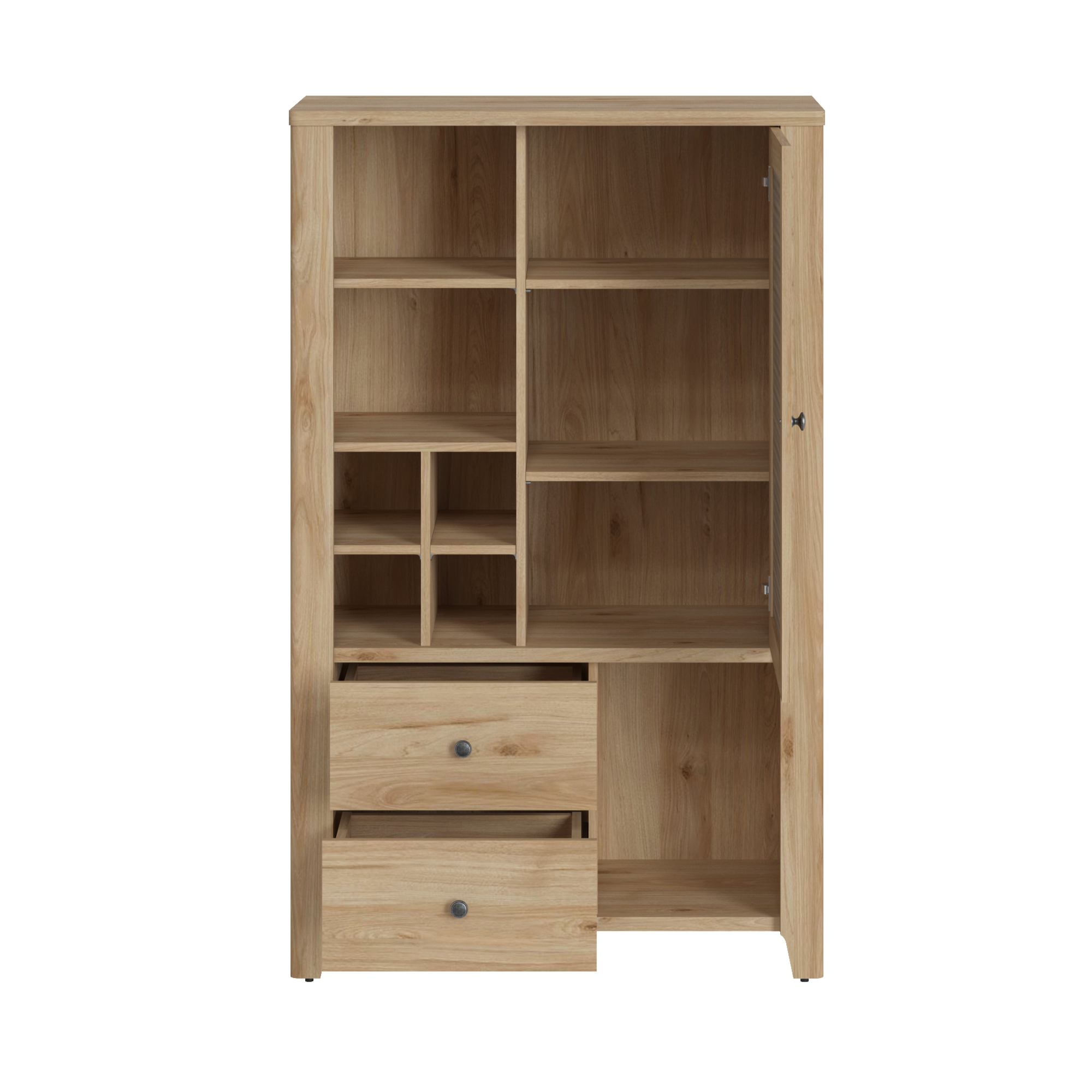 Vyrobená je v kombinácii laminovaného dreveného materiálu a drevovláknitých dosiek MDF, ktoré sa vyznačujú ľahkou udržiavateľnosťou aj dlhou životnosťou. Ladená je do dekora duba jackson hickory, ktorý interiér obohatí o nádych prírody. Skriňa kombinuje otvorený úložný priestor s uzavretým. Otvorený priestor v ľavej hornej a pravej spodnej časti ponúka sedem samostatných sekcií v rôznych veľkostiach. Pravú hornú časť kryjú dvierka so vzorovaným povrchom, za ktorými sa nachádzajú dve police, ľavá spodná časť disponuje dvoma zásuvkami. Manipuláciu navyše uľahčujú kovové rúčky a tiché dovieranie softclose.
