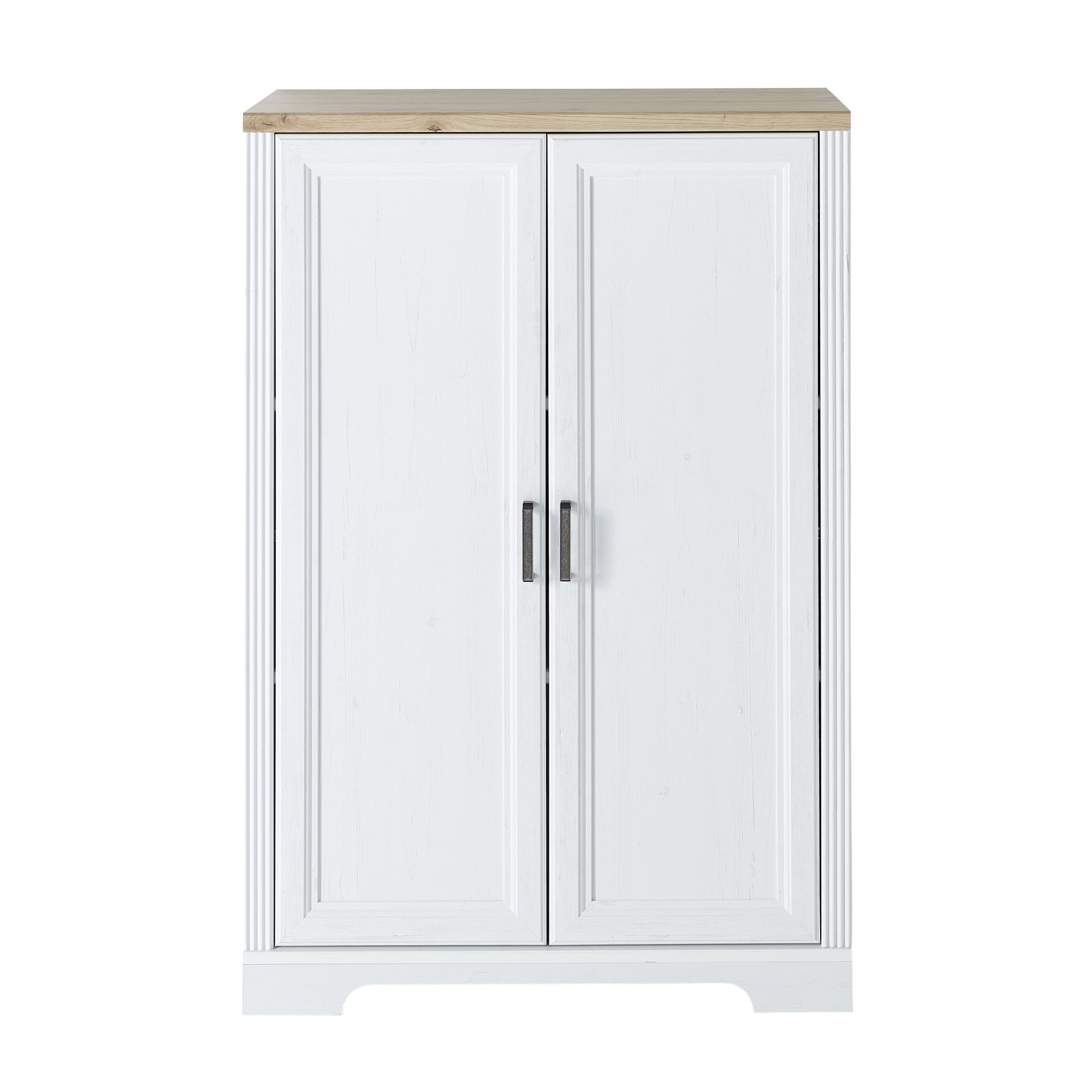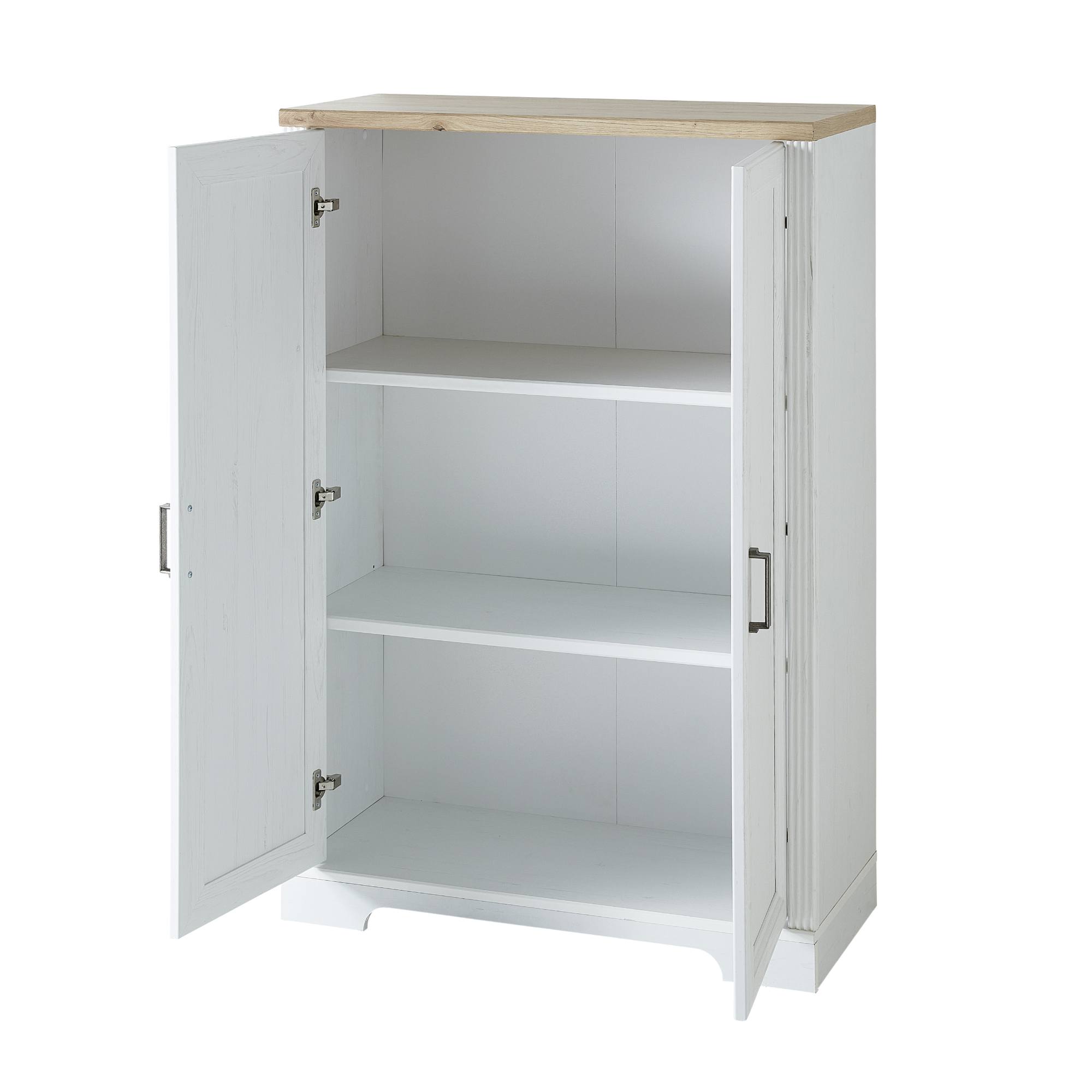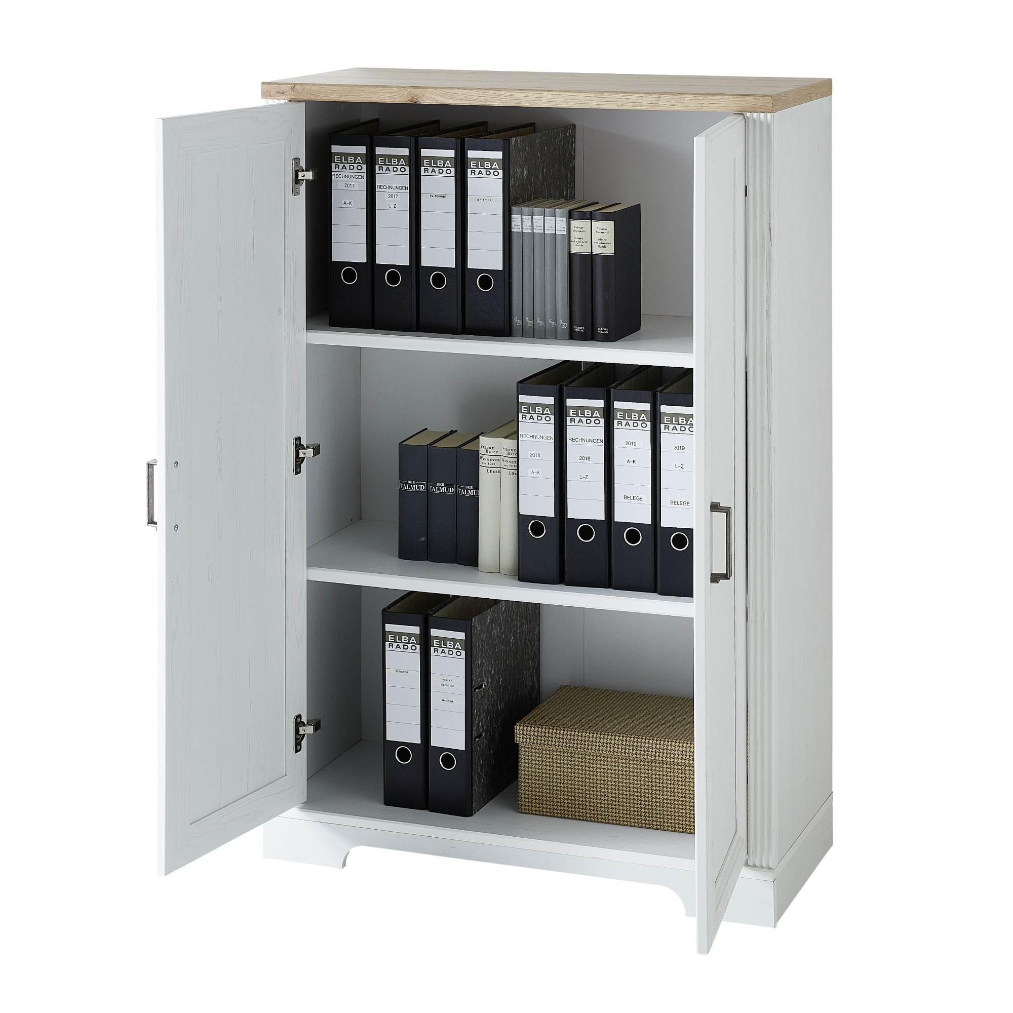 Dvoje dvierka s mäkkým dovieraním soft-close kryjú dostatočný úložný priestor delený dvoma policami. Ideálne miesto v ňom nájdu šanóny, knihy a iné kancelárske nevyhnutnosti. Skriňa disponuje praktickými kovovými rúčkami. Vyrobená je z drevovláknitých dosiek MDF s dekoratívnym frézovaním.