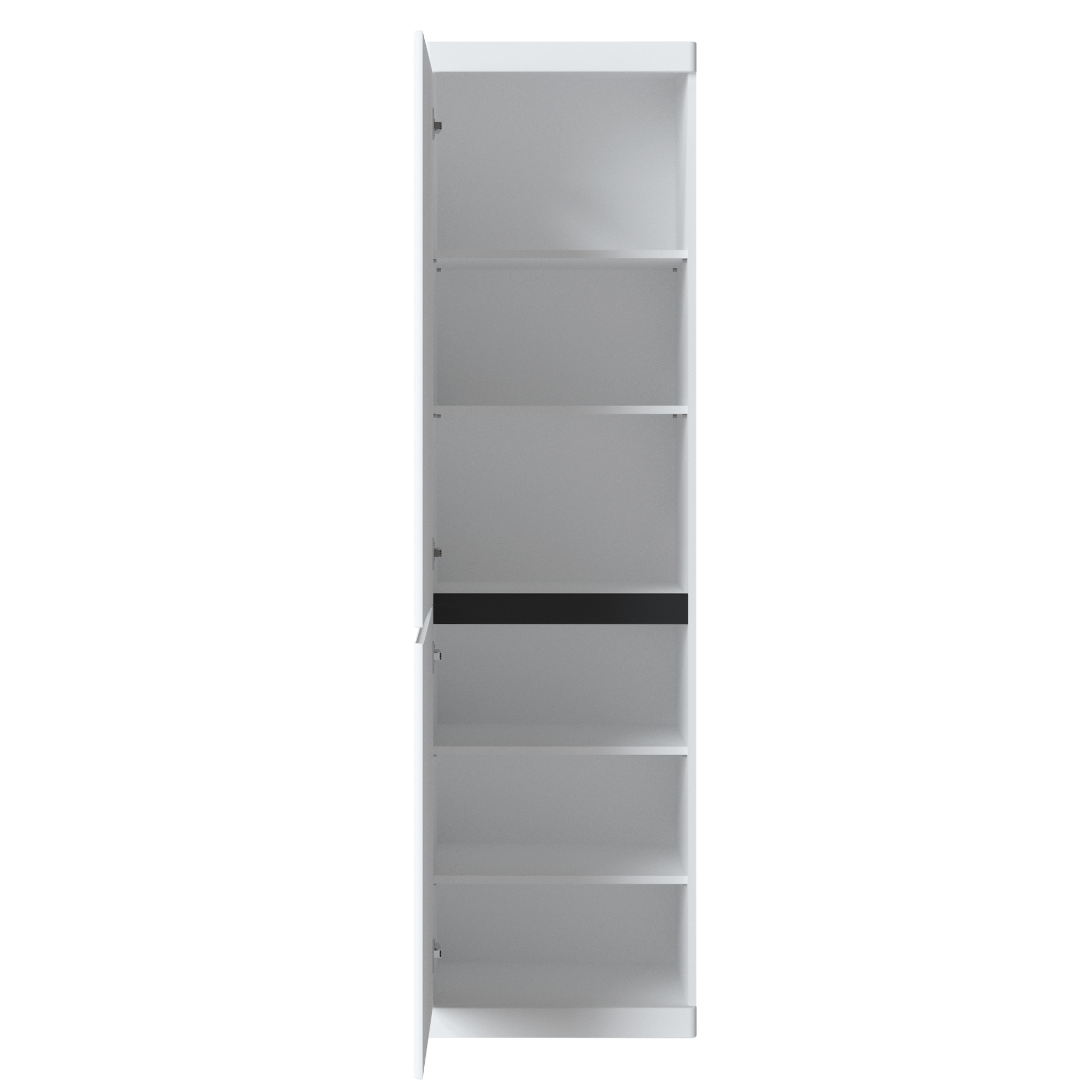 Policová skriňa MAGESTIC v elegantnej alpskej bielej farbe s diskrétnym grafitovosivým detailom skvele doplní moderné aj minimalistické interiéry.