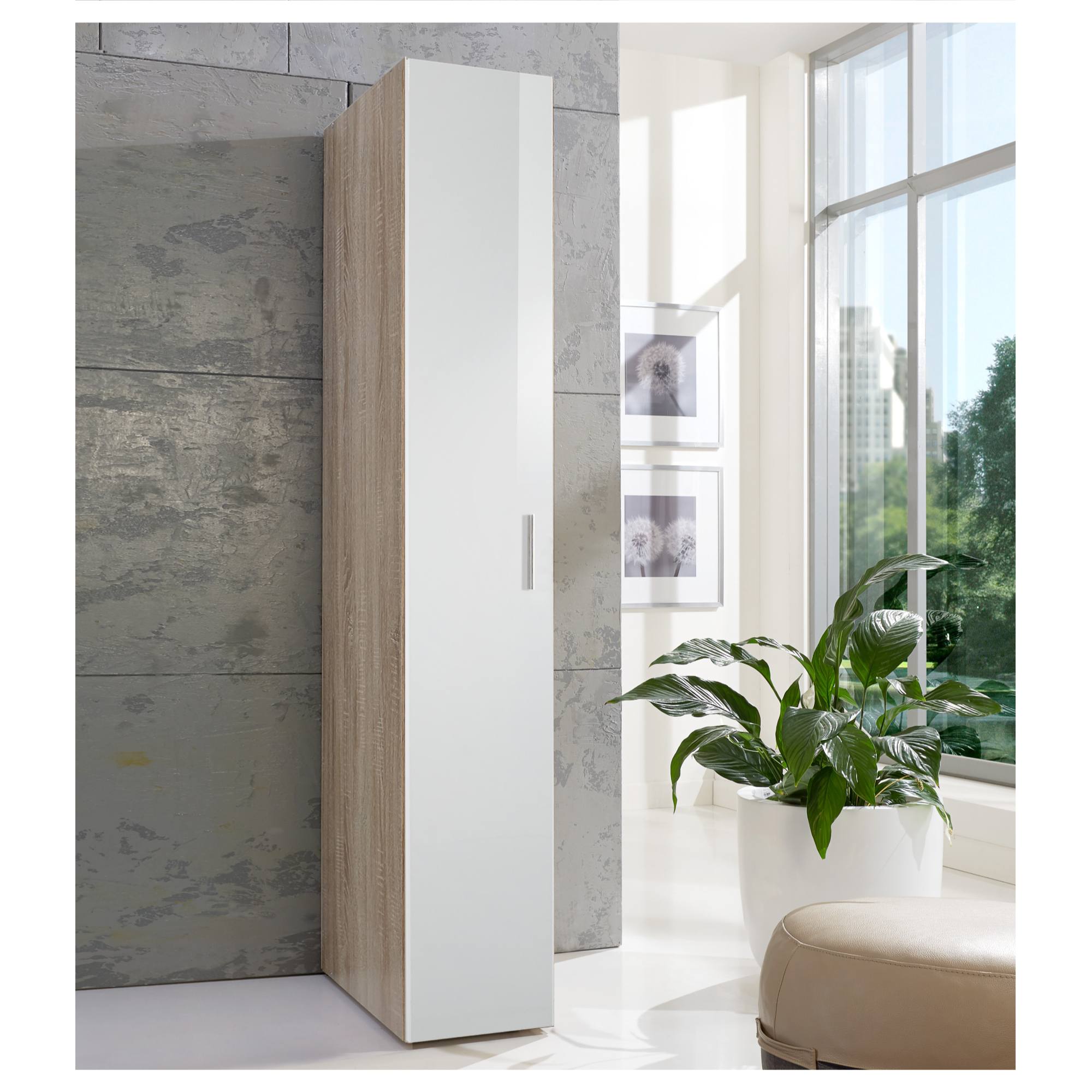 Skriňa je vybavená otočnými dverami za ktorými sa nachádza prakticky členené vnútorné vybavenie vo forme šatníkovej tyče a vloženej police. Dvere sú vybavené praktickou rúčkou vo farbe kovu na ľahšiu každodennú manipuláciu. Korpus skrine je vyrobený z laminovaného dreveného materiálu s povrchom nenáročným na údržbu. Skriňa umožňuje univerzálnu montáž dverí, takže sa môžu otvárať z ľavej alebo pravej strany podľa vašich preferencií.