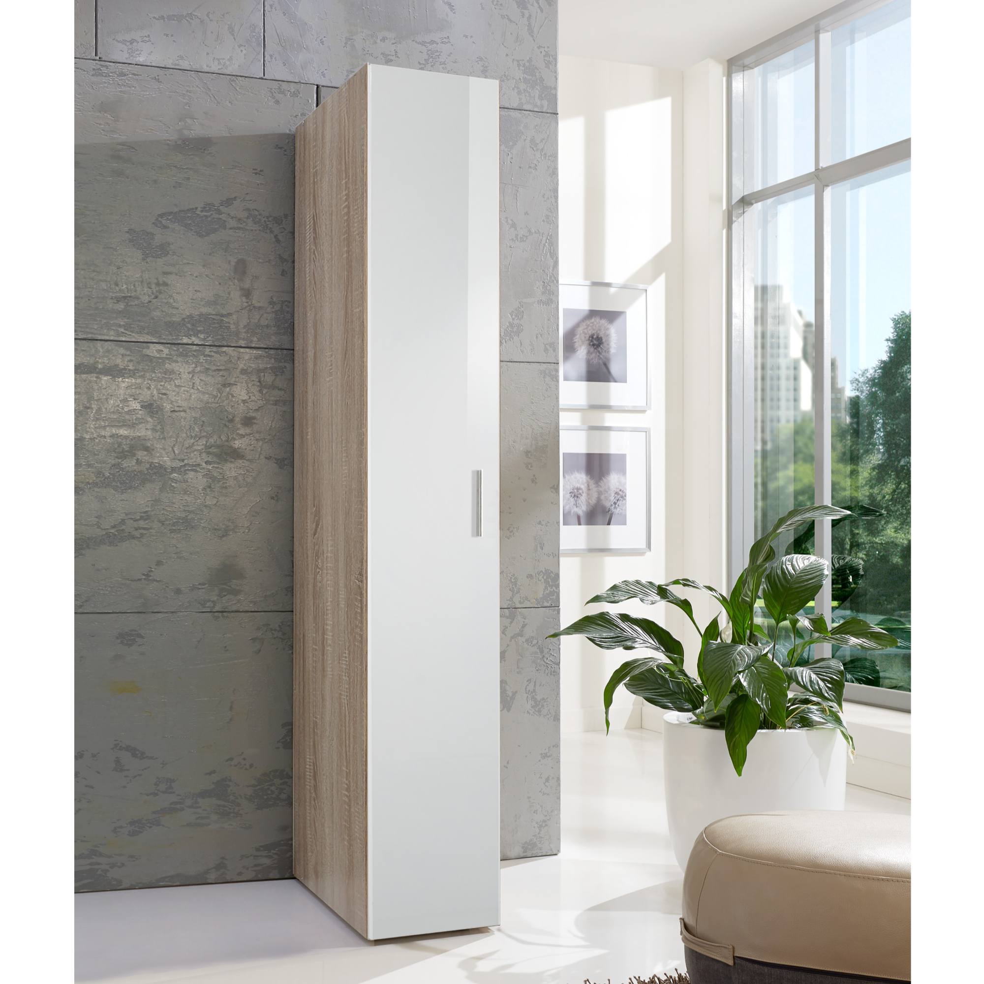 Skriňa je vybavená otočnými dverami za ktorými sa nachádza prakticky členené vnútorné vybavenie vo forme šatníkovej tyče a vloženej police. Dvere sú vybavené praktickou rúčkou vo farbe kovu na ľahšiu každodennú manipuláciu. Korpus skrine je vyrobený z laminovaného dreveného materiálu s povrchom nenáročným na údržbu. Skriňa umožňuje univerzálnu montáž dverí, takže sa môžu otvárať z ľavej alebo pravej strany podľa vašich preferencií.