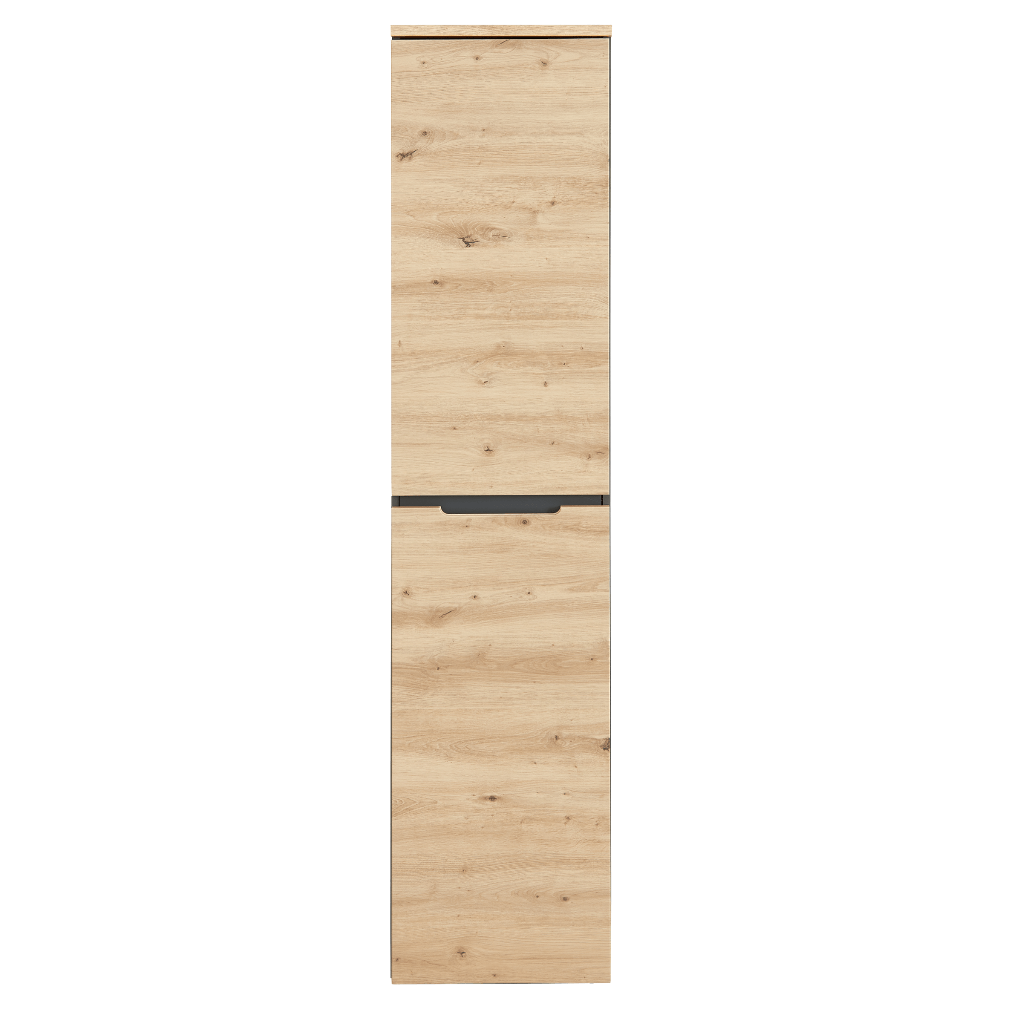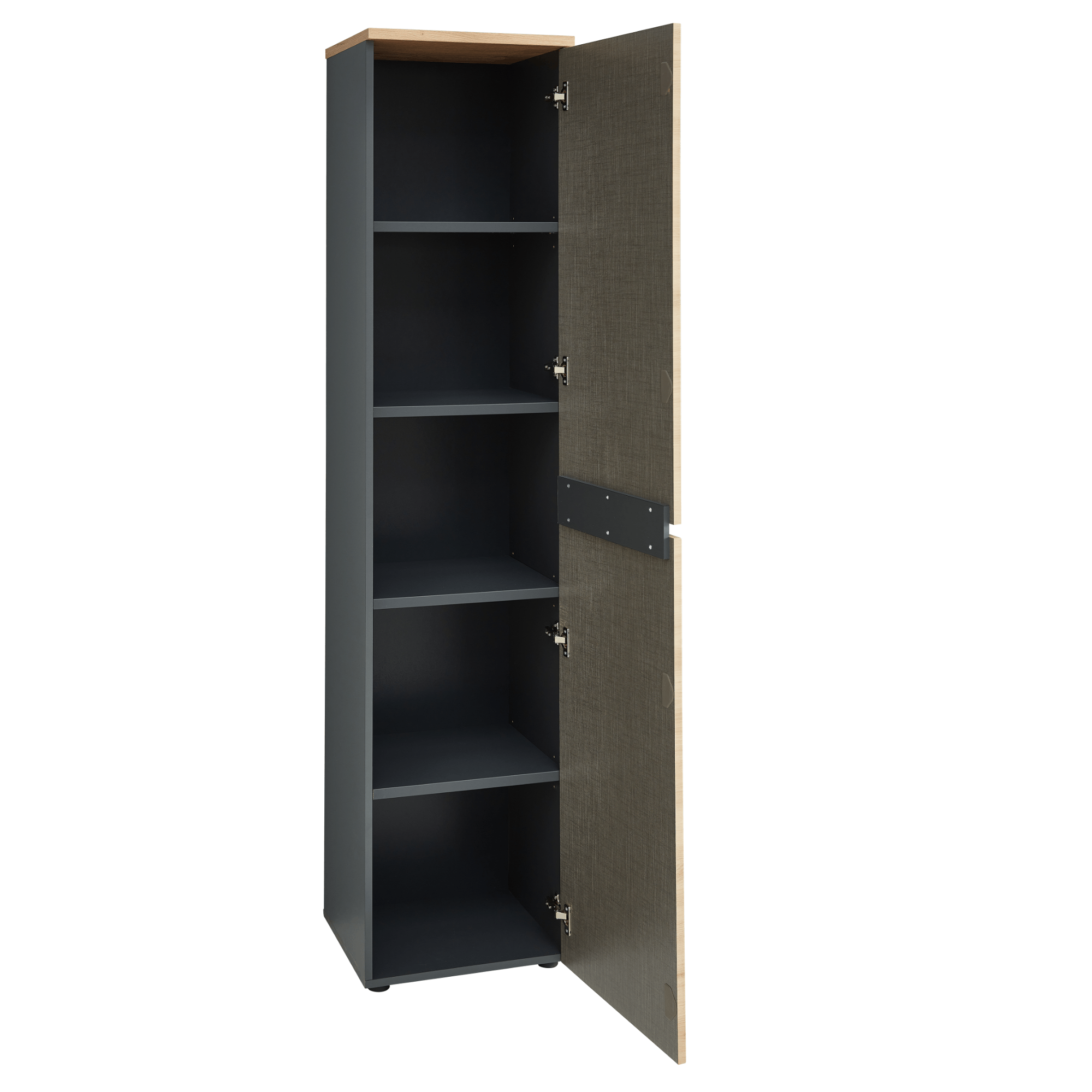 Vyrobená je z laminovaného dreveného materiálu, ktorý vyniká ľahkou udržiavateľnosťou a dlhou životnosťou. Predné plochy sú ladené do dekora duba artisan, zatiaľ čo korpus je v kontrastnom grafitovom odtieni. Dostatočný, dvierkovo krytý úložný priestor zaisťujú štyri police. Manipuláciu s nábytkom uľahčí tiché dovieranie soft-close a frézované rúčky.