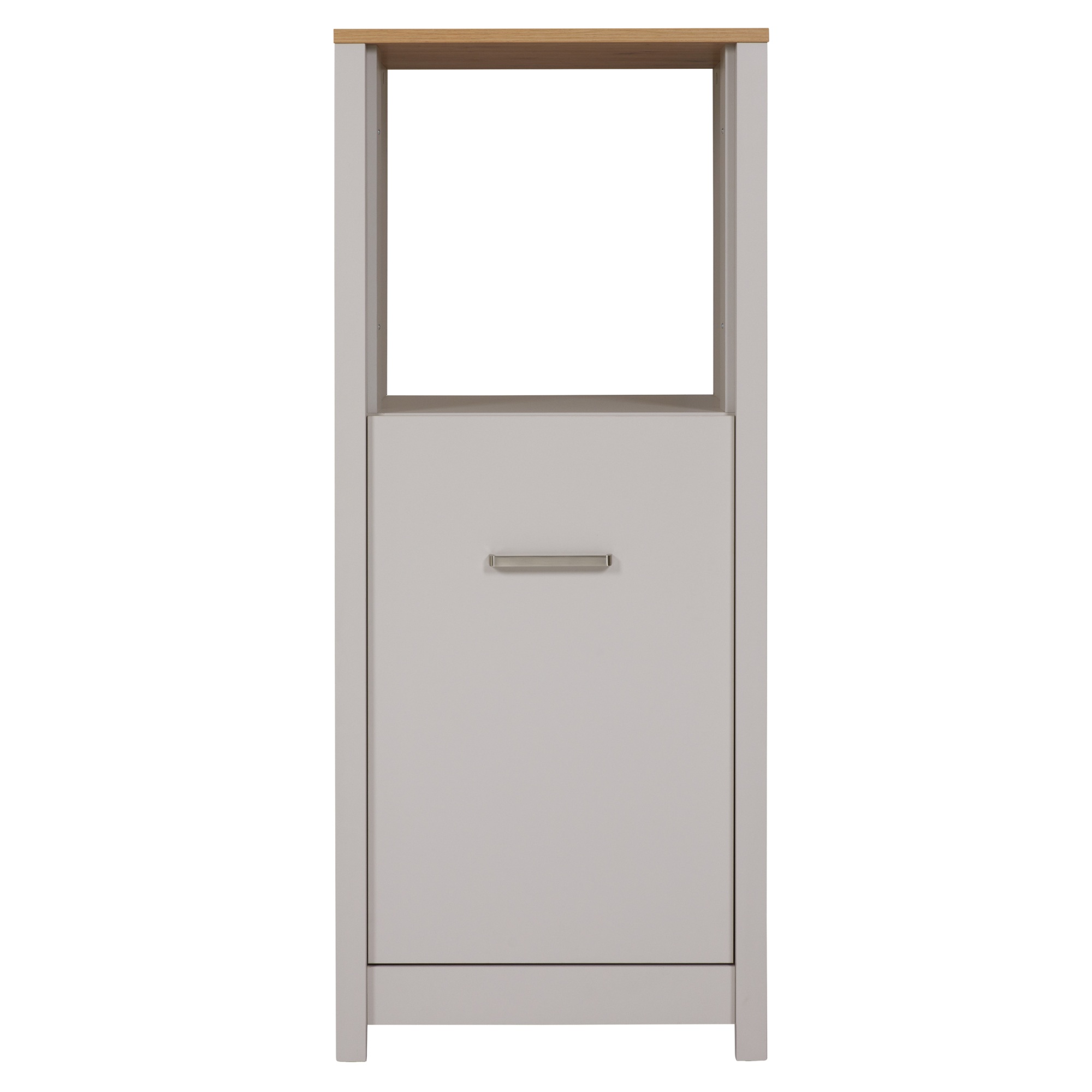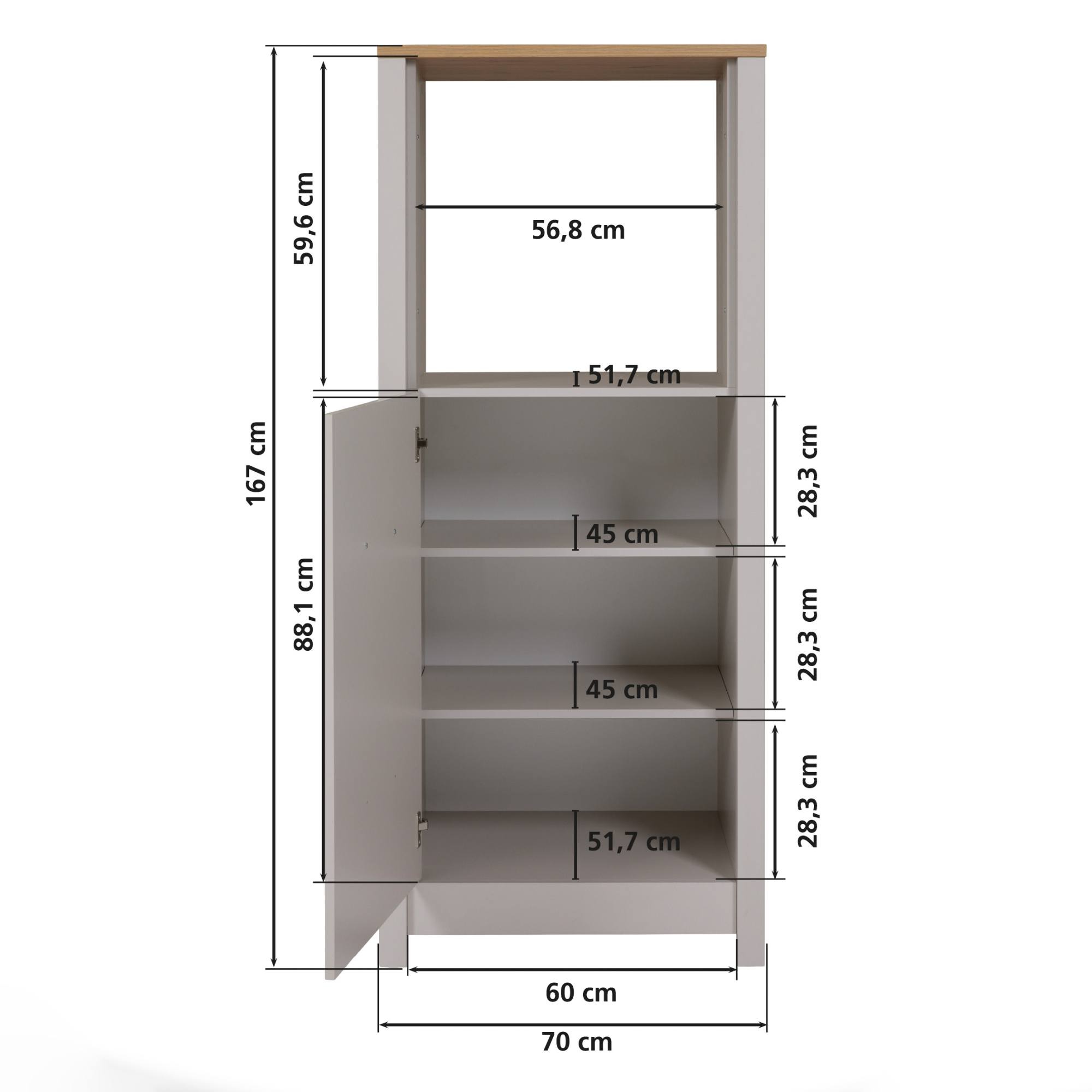 Horná časť skrine je určená na umiestnenie rúry so šírkou 60 cm. Spodná časť je pripravená na umiestnenie chladničky s výškou 88 cm. Ak však máte chladničku samostatne, túto časť je možné využiť ako úložný priestor vďaka 2 policiam, ktoré sú súčasťou balenia. Dvierka sú vybavené robustnou úchytkou a systémom tichého dovierania pre jednoduchú manipuláciu. Je možné ich namontovať vľavo aj vpravo.