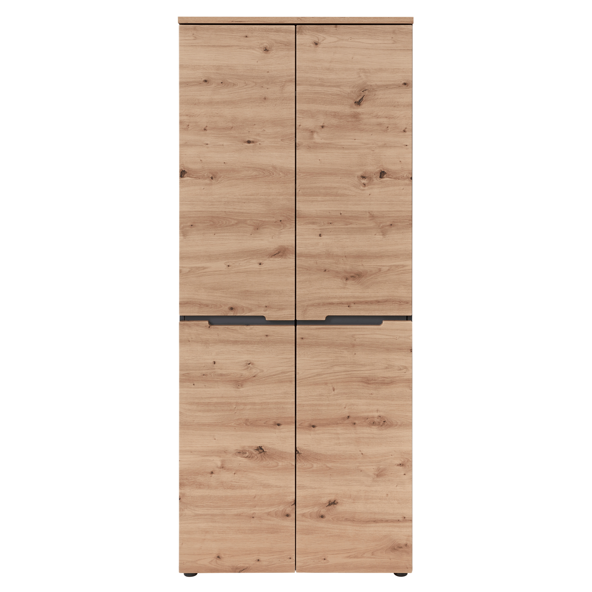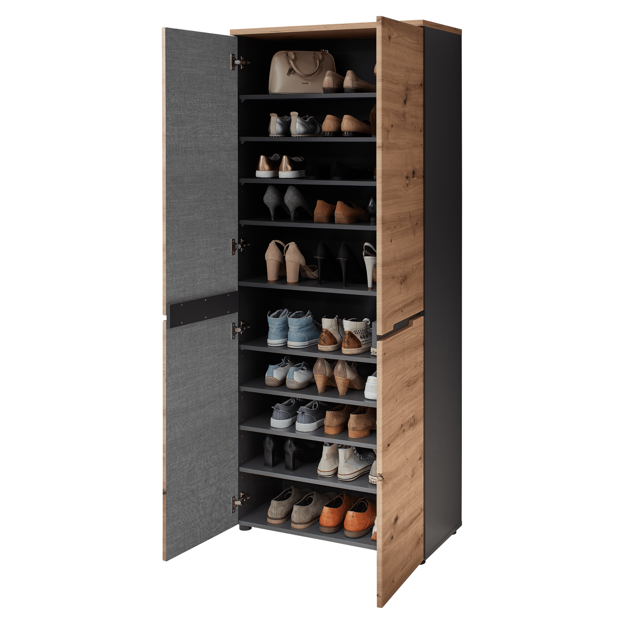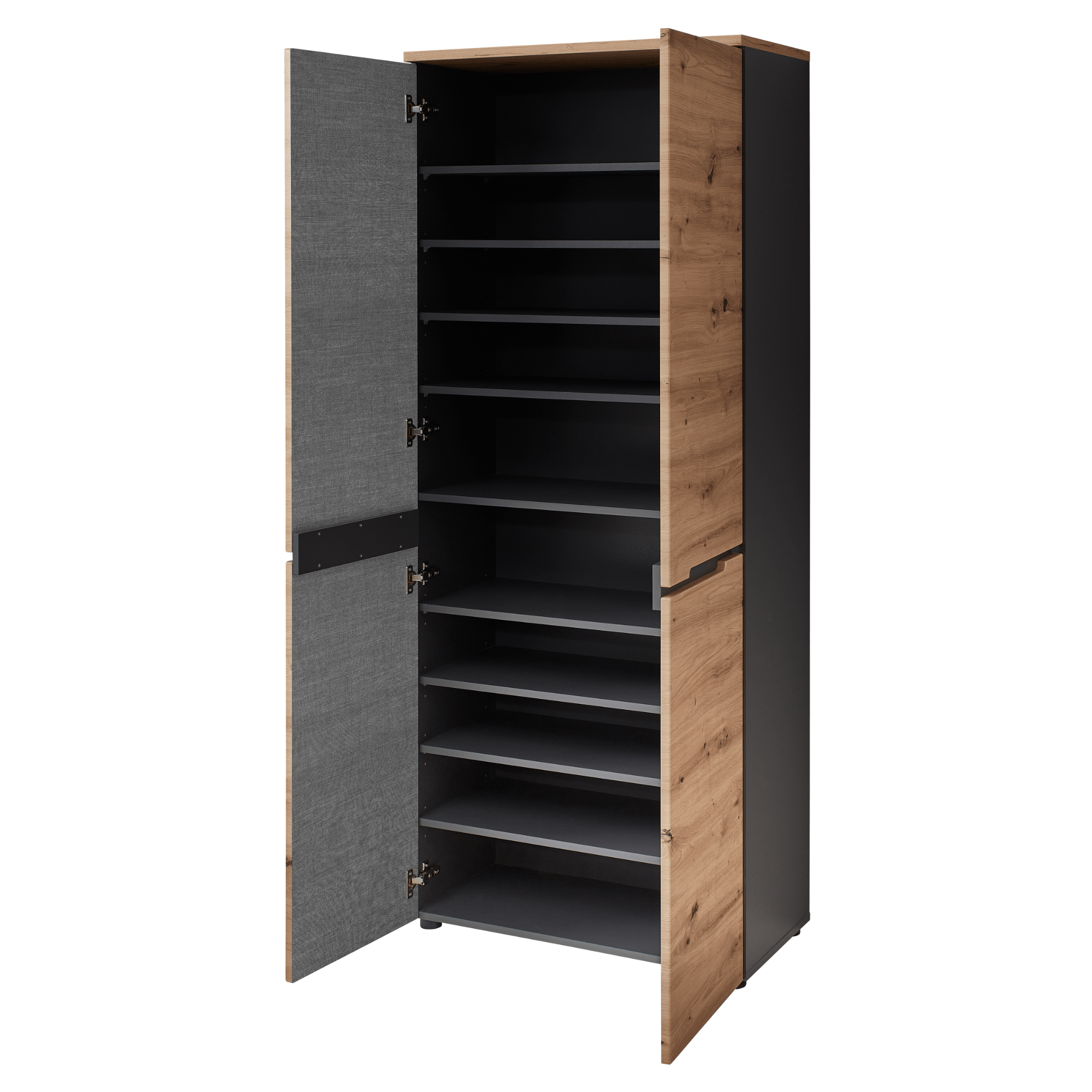 Skriňa na topánky MEMPHIS III na prvý pohľad zaujme moderným vzhľadom s prírodným nádychom, kedy výrazná kresba dekora duba artisan v kombinácii s grafitovou farbou vytvára hrejivý pocit domova.