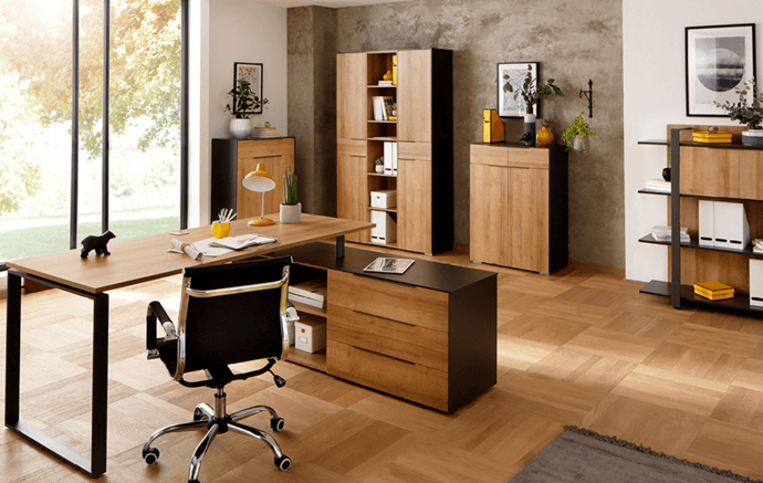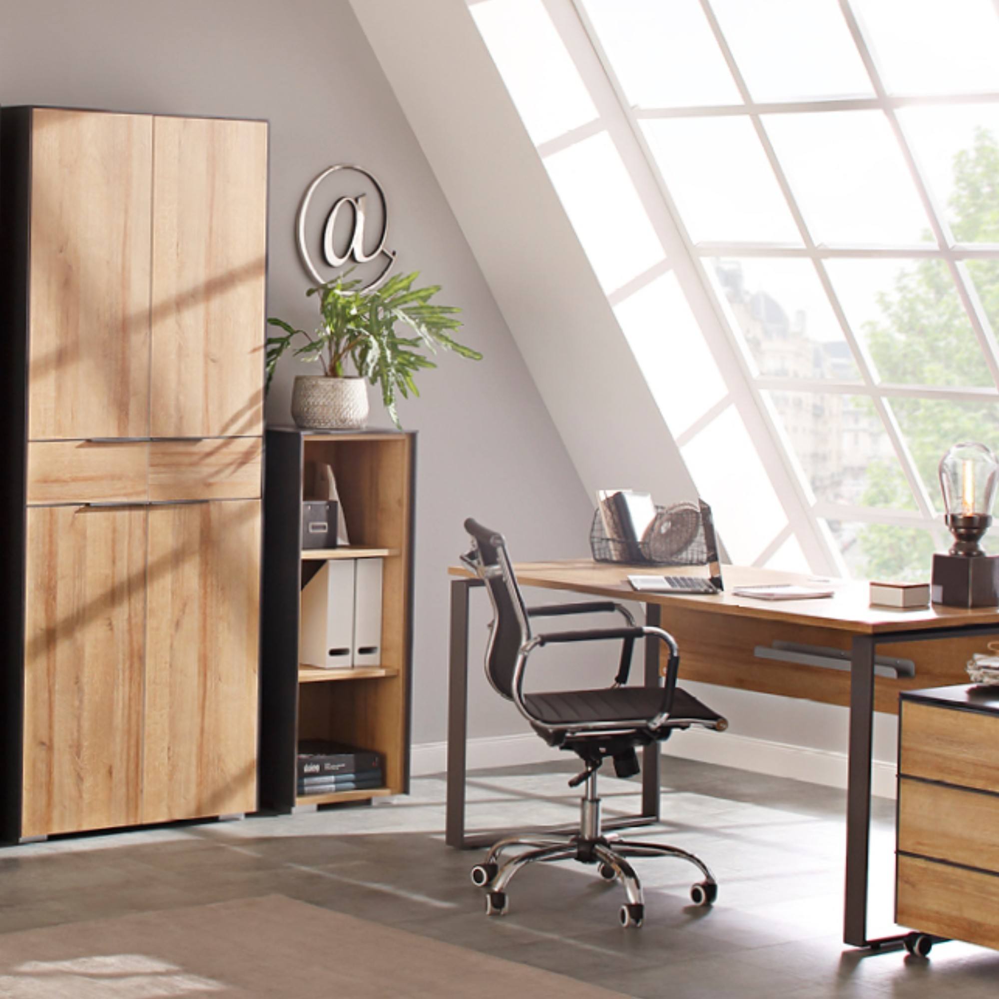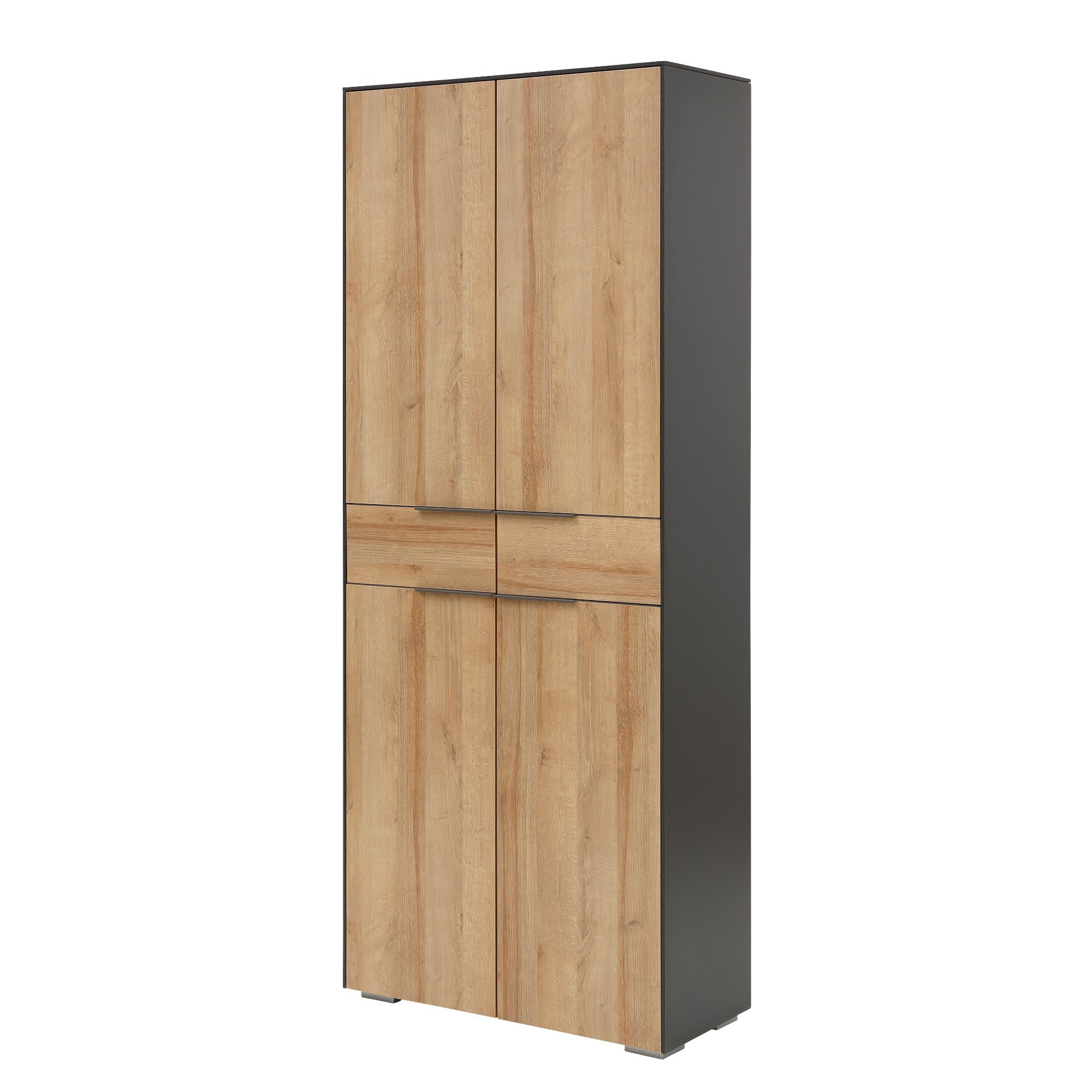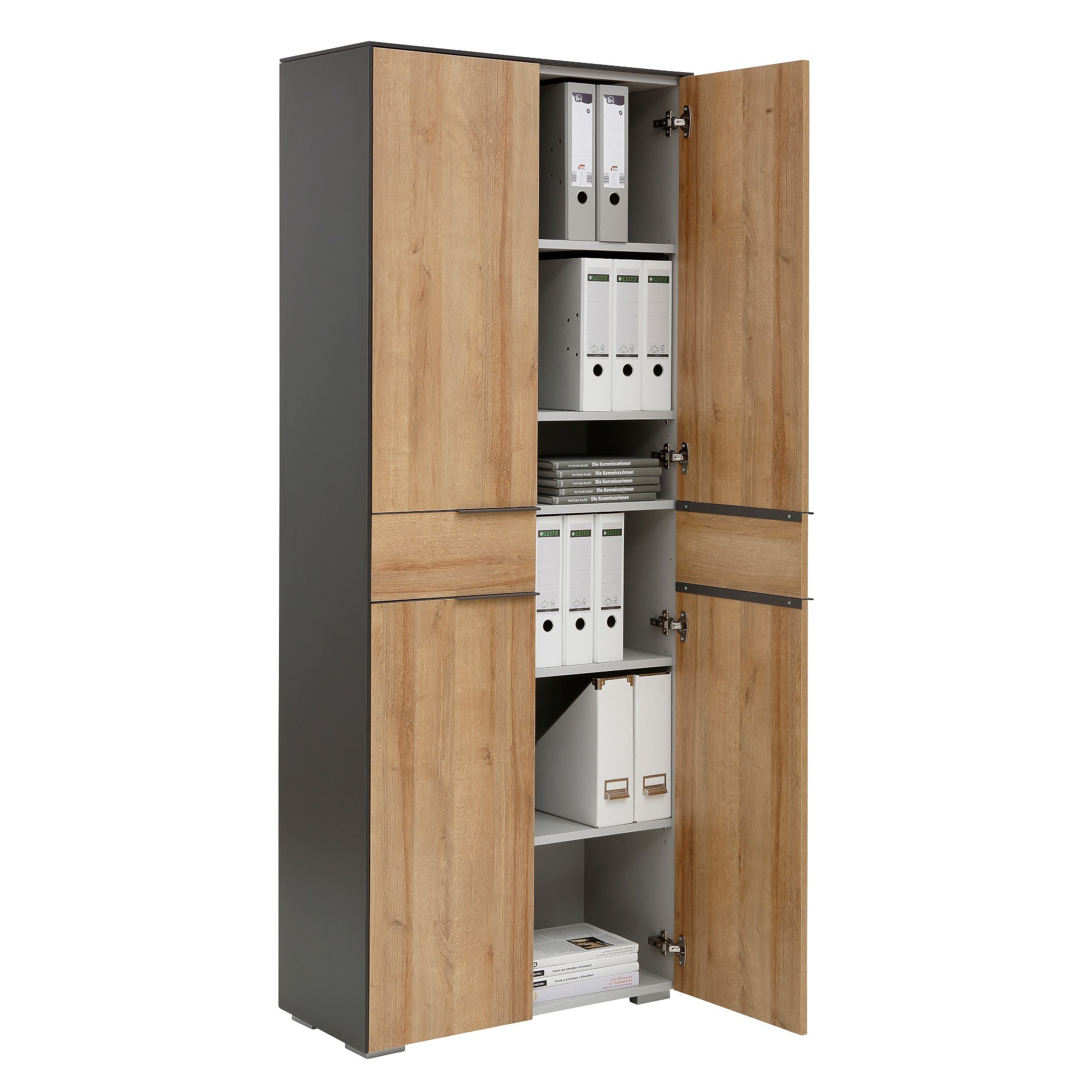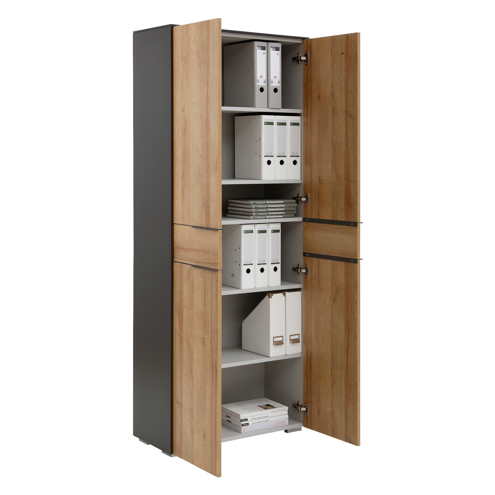 Program RYDER dodá vašej kancelárii expresívny aj diskrétny nádych zároveň. Nábytok je vyrobený z odolného a na údržbu nenáročného lamina v modernom farebnom kontraste prírodného dekoru dub riviéra a antracitovej farby. Životnosť nábytku a jeho odolnosť proti mechanickému poškodeniu zvyšujú tiež ABS hrany. Praktické detaily skrine RYDER, ako kovové rúčky, 2 otočné dvierka s tlmeným dovieraním, 4 výškovo nastaviteľné police, 1 pevná polica, stabilita vďaka kovovým nohám, splní vaše nároky na funkčný kancelársky nábytok. Jednoduchá a rýchla montáž.
