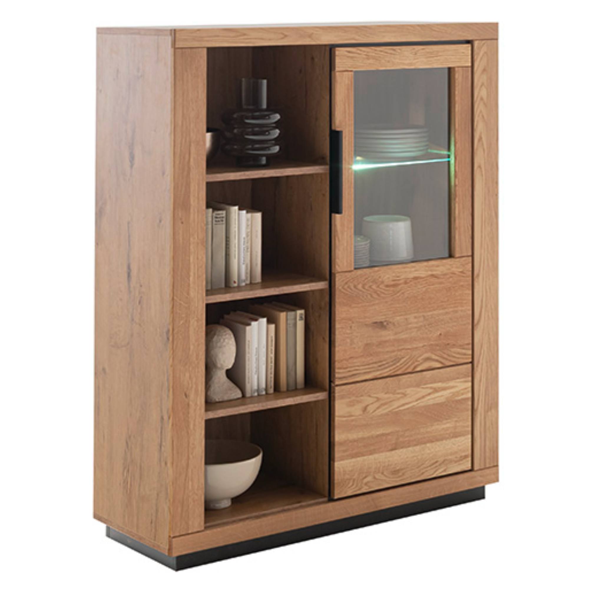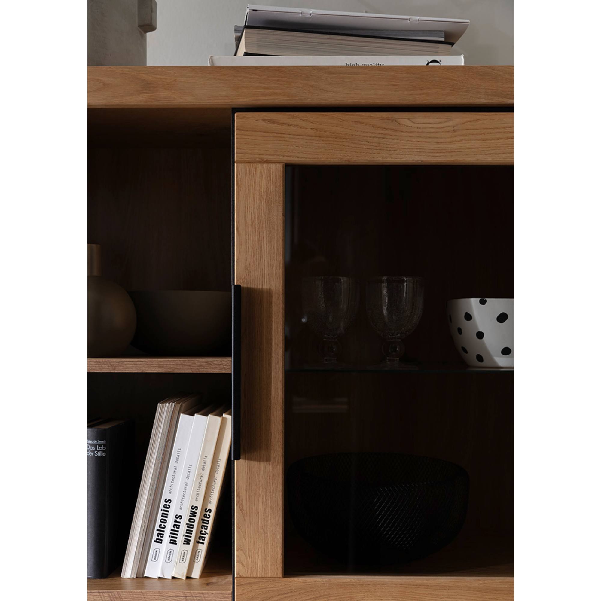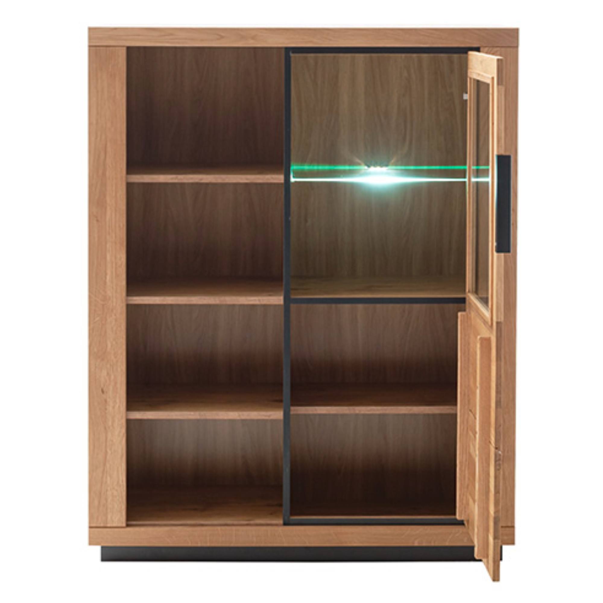 Skrinka je vybavená 6 vloženými policami. 3 z nich sú umiestnené za čiastočne presklenými dvierkami. Policu za sklom je možné doplniť osvetlením, ktoré umožní vystaveným predmetom naplno vyniknúť.