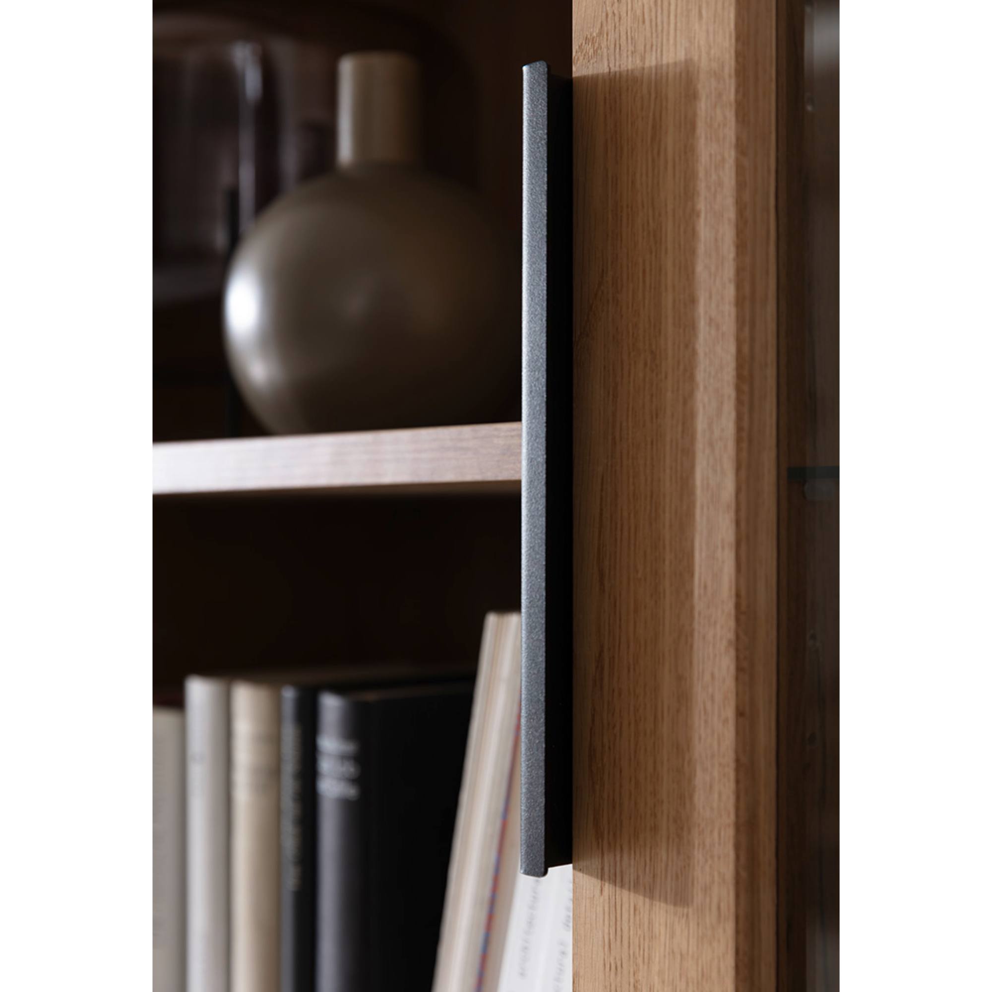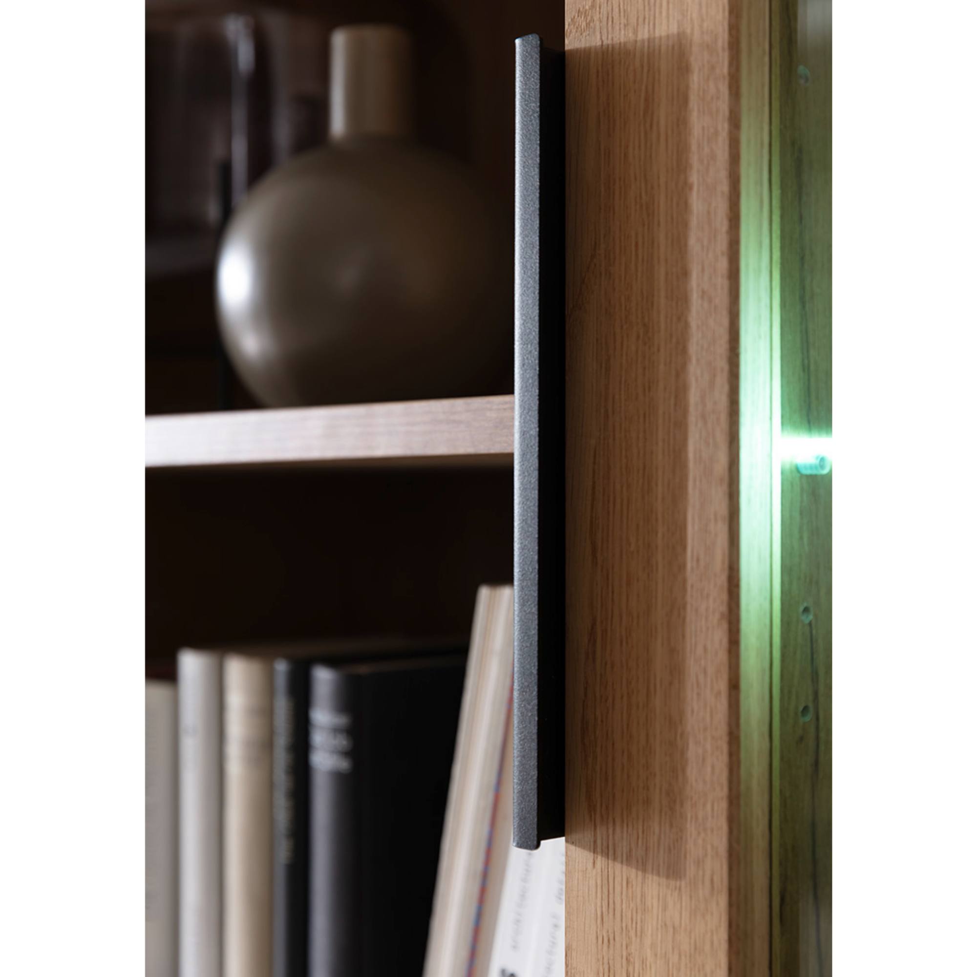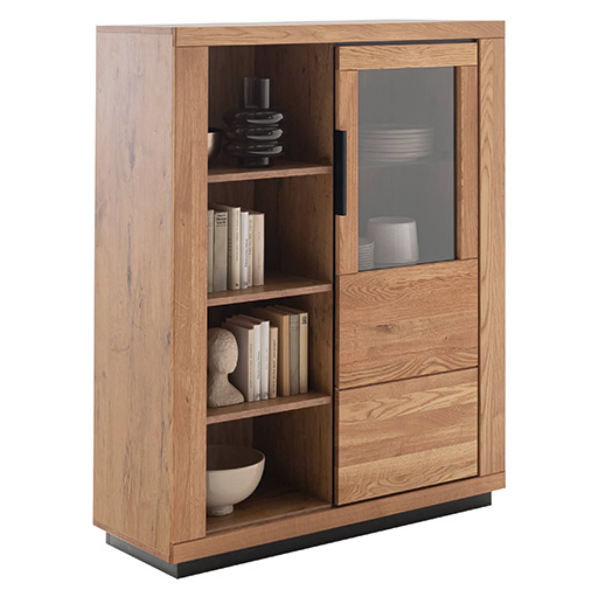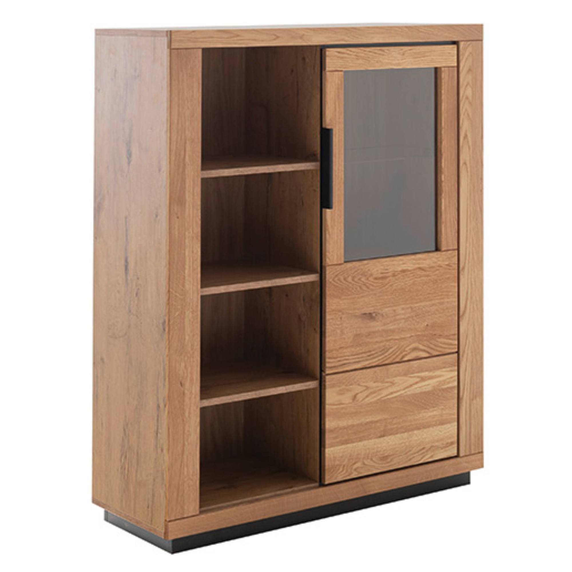 Skrinka je vybavená 6 vloženými policami. 3 z nich sú umiestnené za čiastočne presklenými dvierkami. Policu za sklom je možné doplniť osvetlením, ktoré umožní vystaveným predmetom naplno vyniknúť.