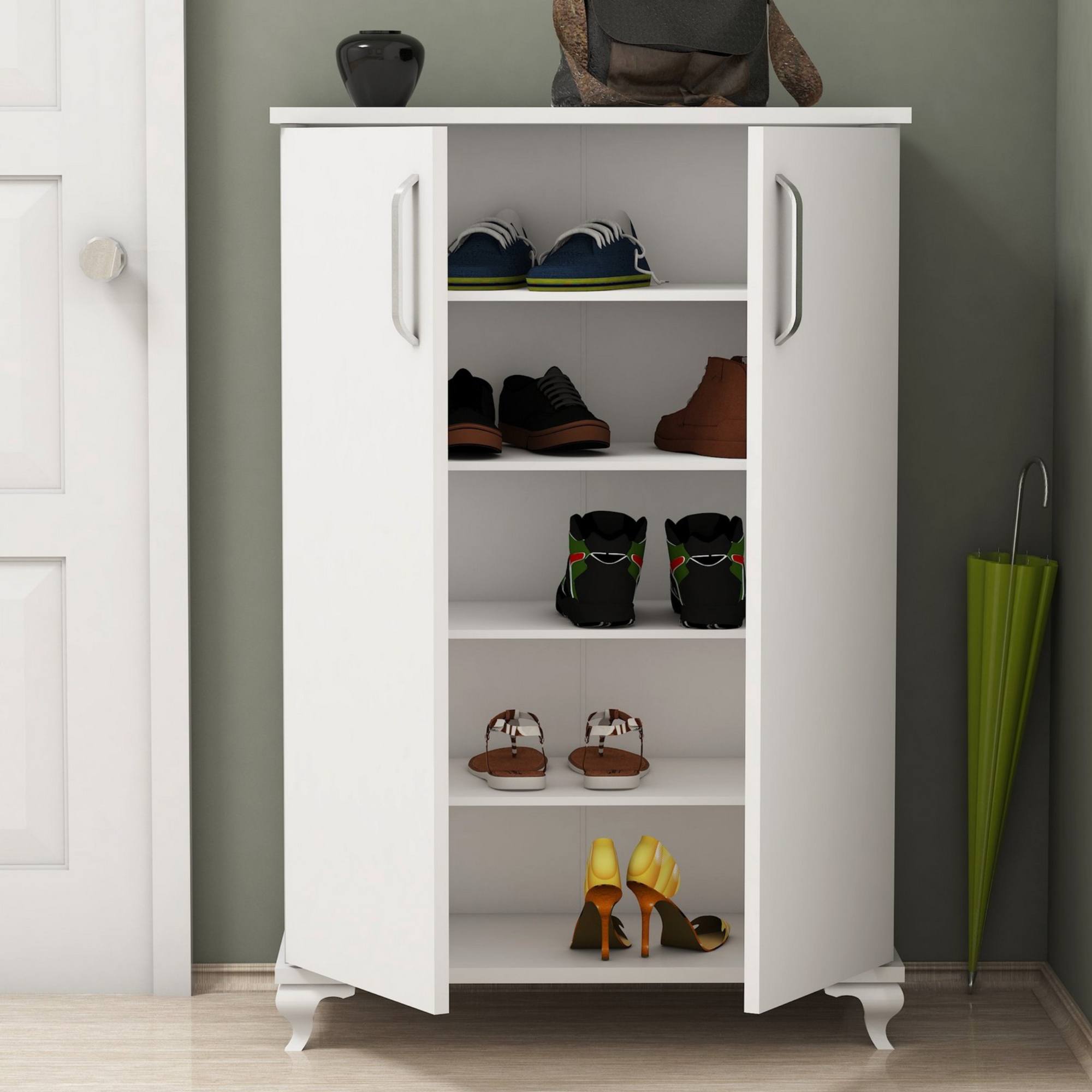 Za jej dvierkami sa ukrývajú 4 vložené police, ktoré ponúkajú dostatok úložného priestoru na prehľadné uloženie vašich topánok. Aby sa s dvierkami ľahšie manipulovalo, sú vybavené praktickými rúčkami.
