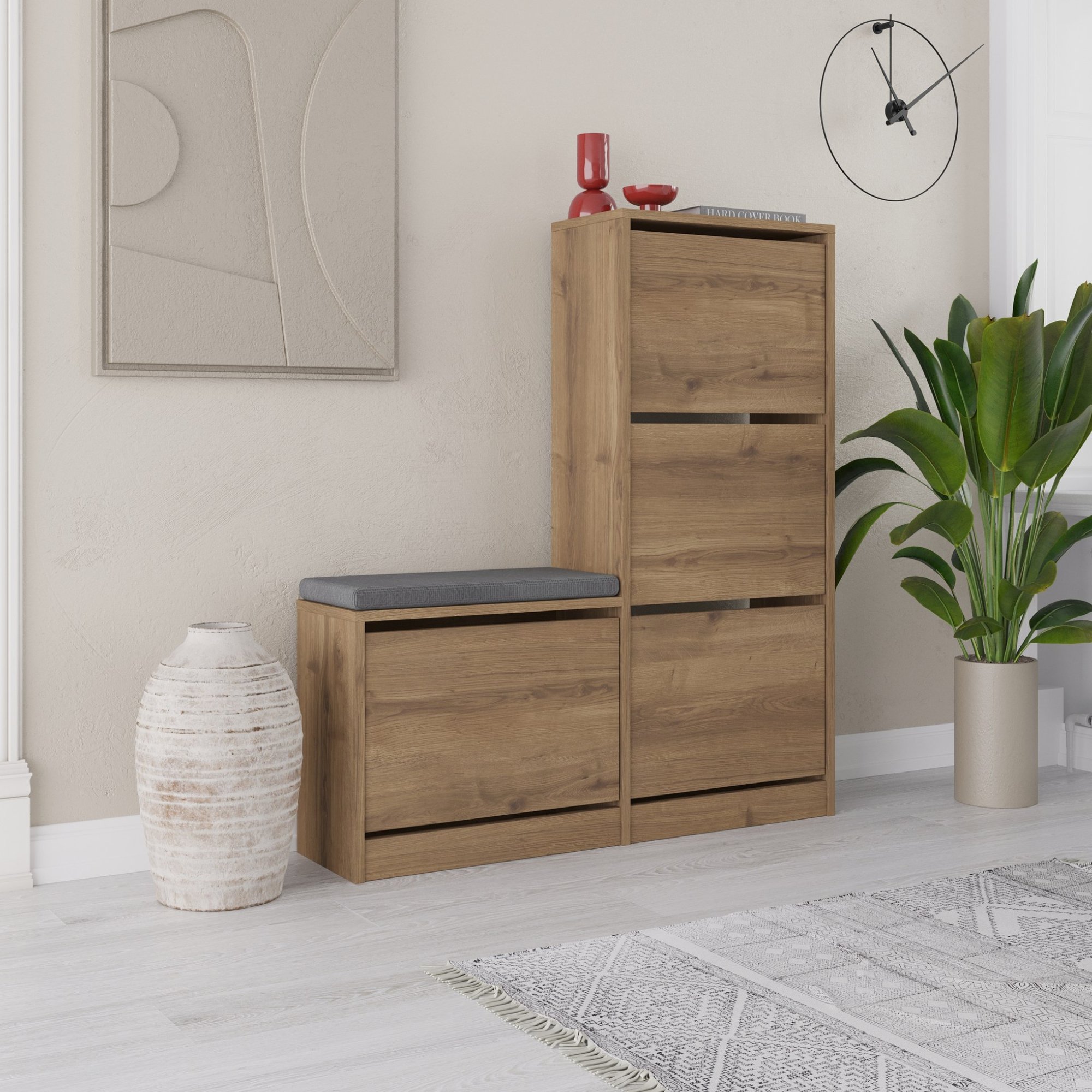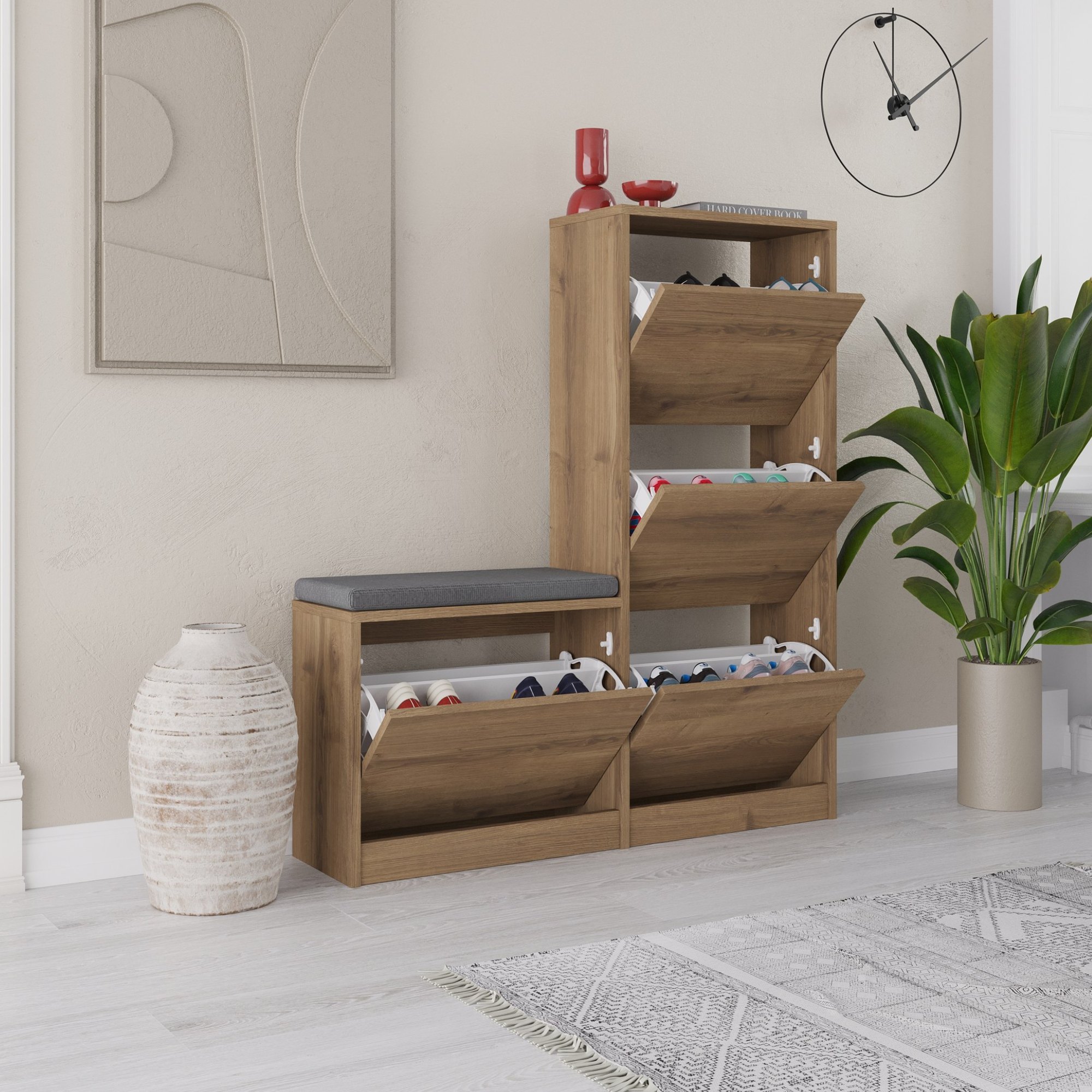 Skrinka na topánky ponúkne dostatok priestoru na organizované a prehľadné uloženie všetkých vašich topánok. Úložný priestor je ukrytý za 4 výklopnými dvierkami.