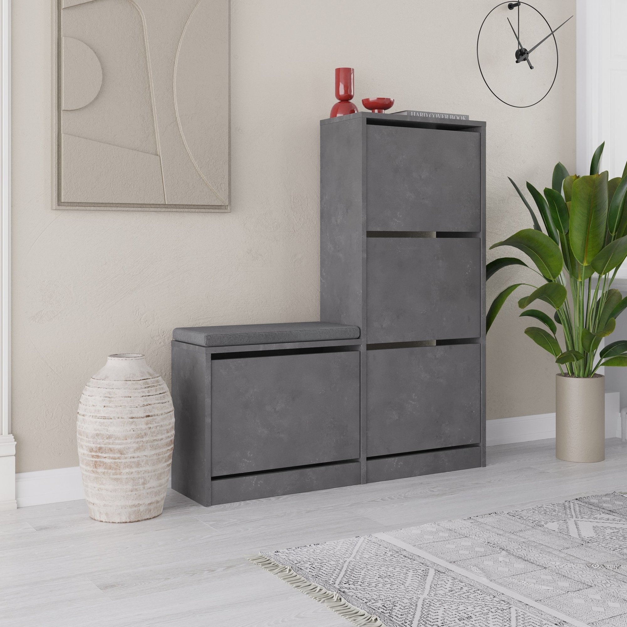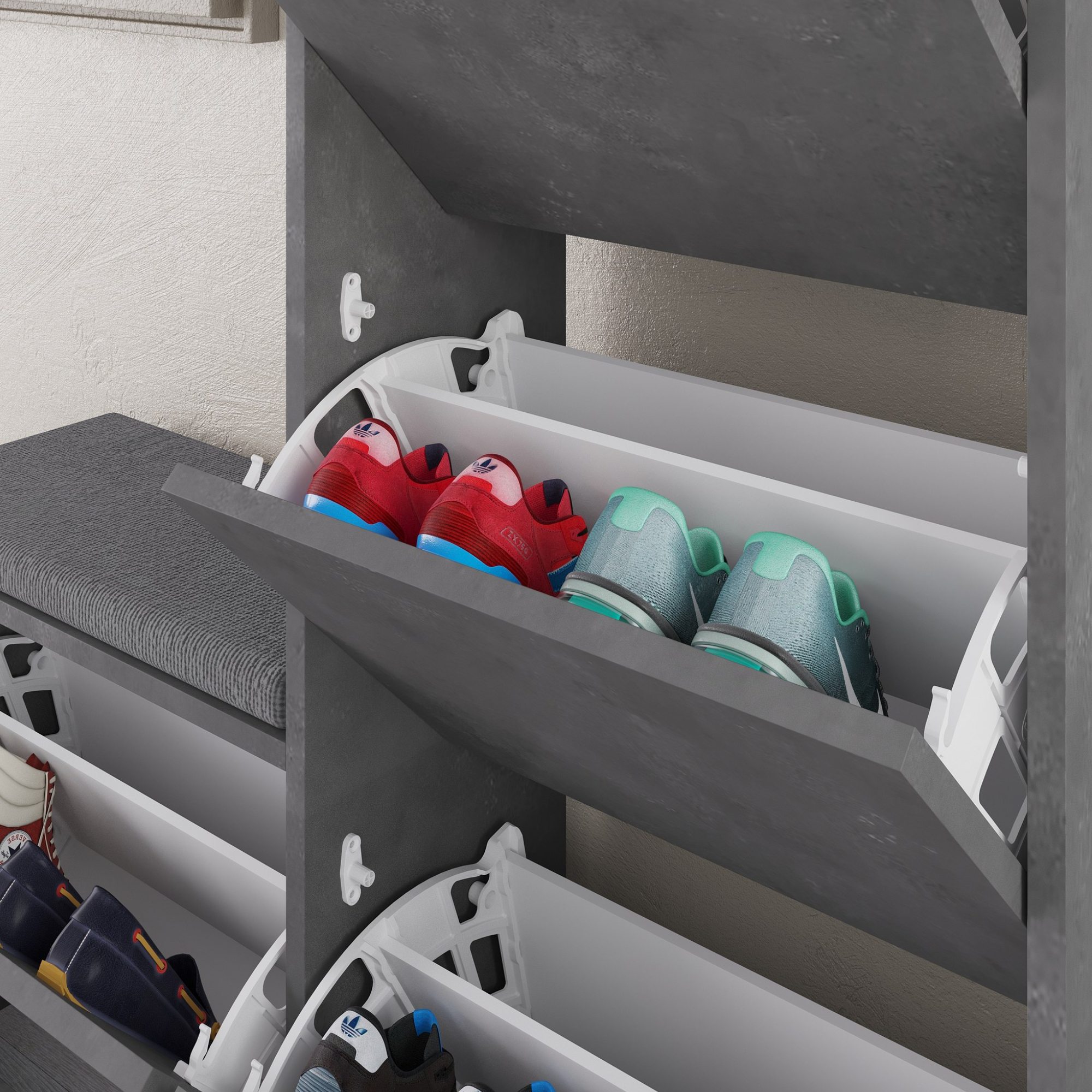 Skrinka na topánky ponúkne dostatok priestoru na organizované a prehľadné uloženie všetkých vašich topánok. Úložný priestor je ukrytý za 4 výklopnými dvierkami.