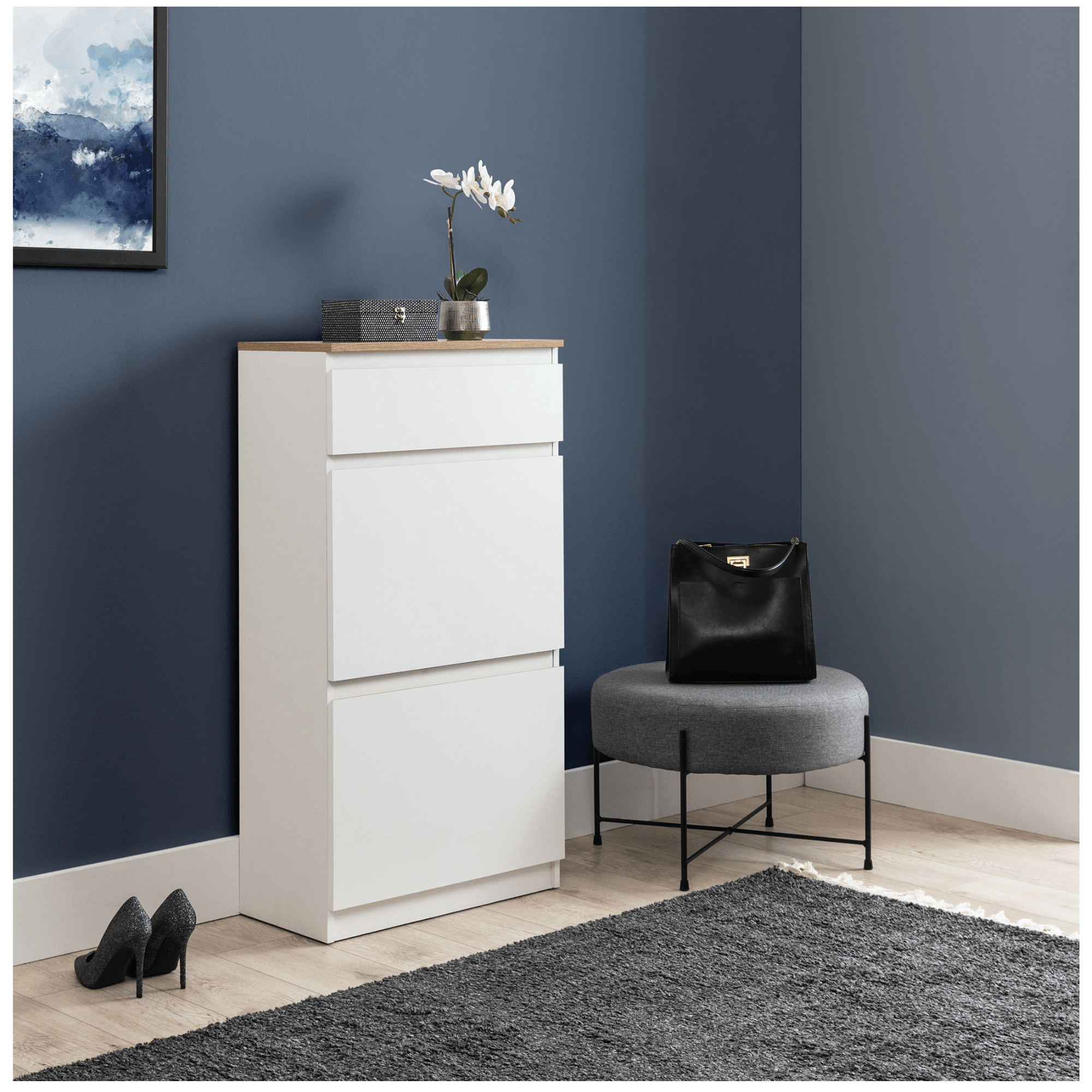 Skrinka na topánky ERNIE RM11 zdôrazní štýl predsiene a pomôže udržať poriadok a logické členenie obuvi a ďalších potrieb.
