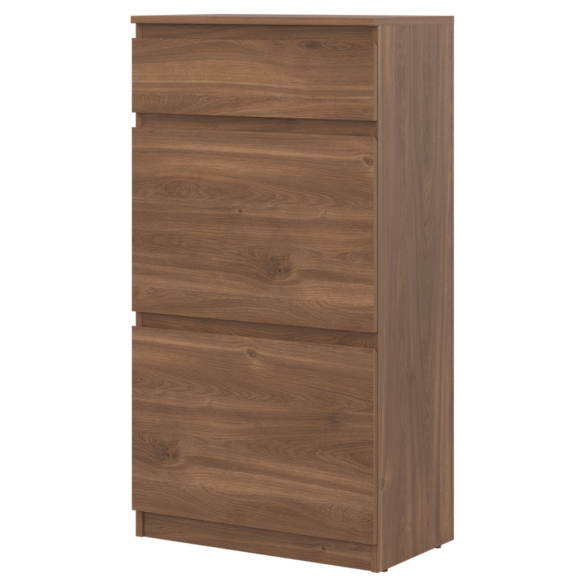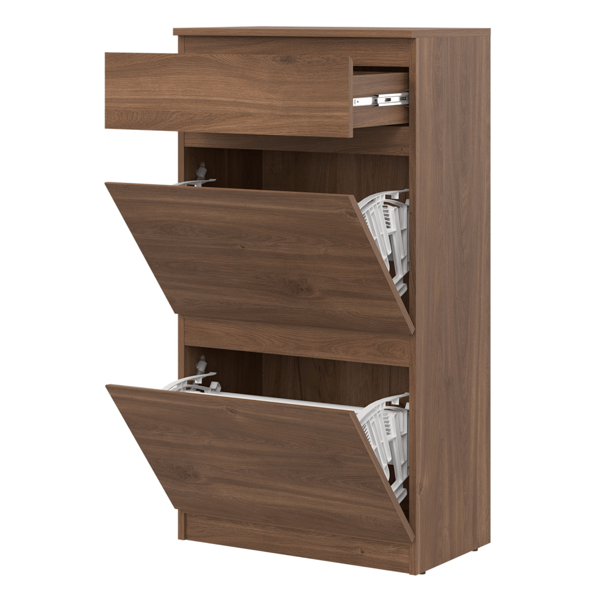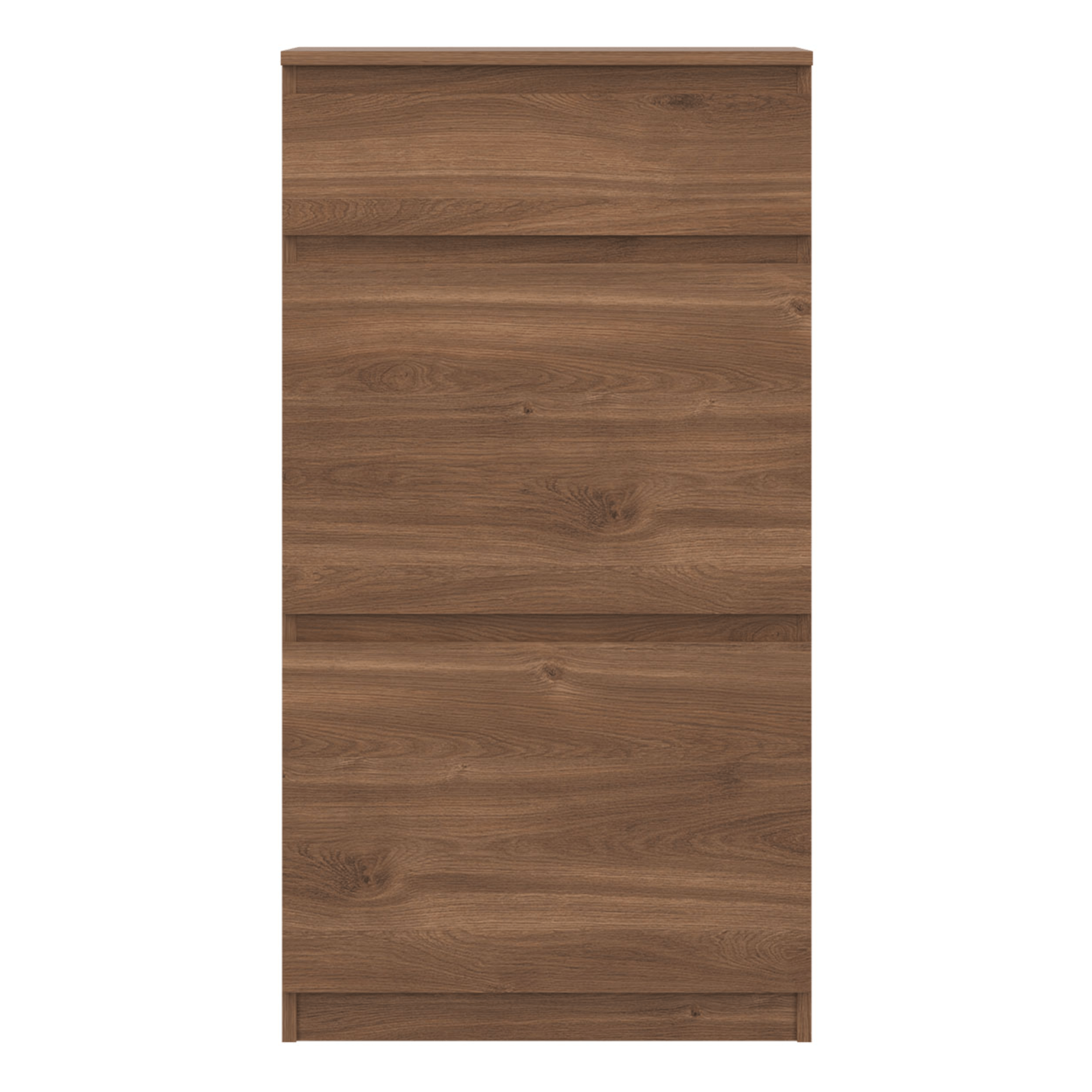 Vyrobená je z laminovaného dreveného materiálu, ktorý sa vyznačuje ľahkou udržiavateľnosťou aj dlhou životnosťou. Dostatočný úložný priestor na obuv zaisťujú dve sekcie s výklopnými dvierkami, na ďalšie drobnosti príde vhod horná zásuvka. Decentné frézovanie predných plôch skrinky supluje rúčkami, vďaka tomu pôsobí čistejším a modernejším dojmom.
