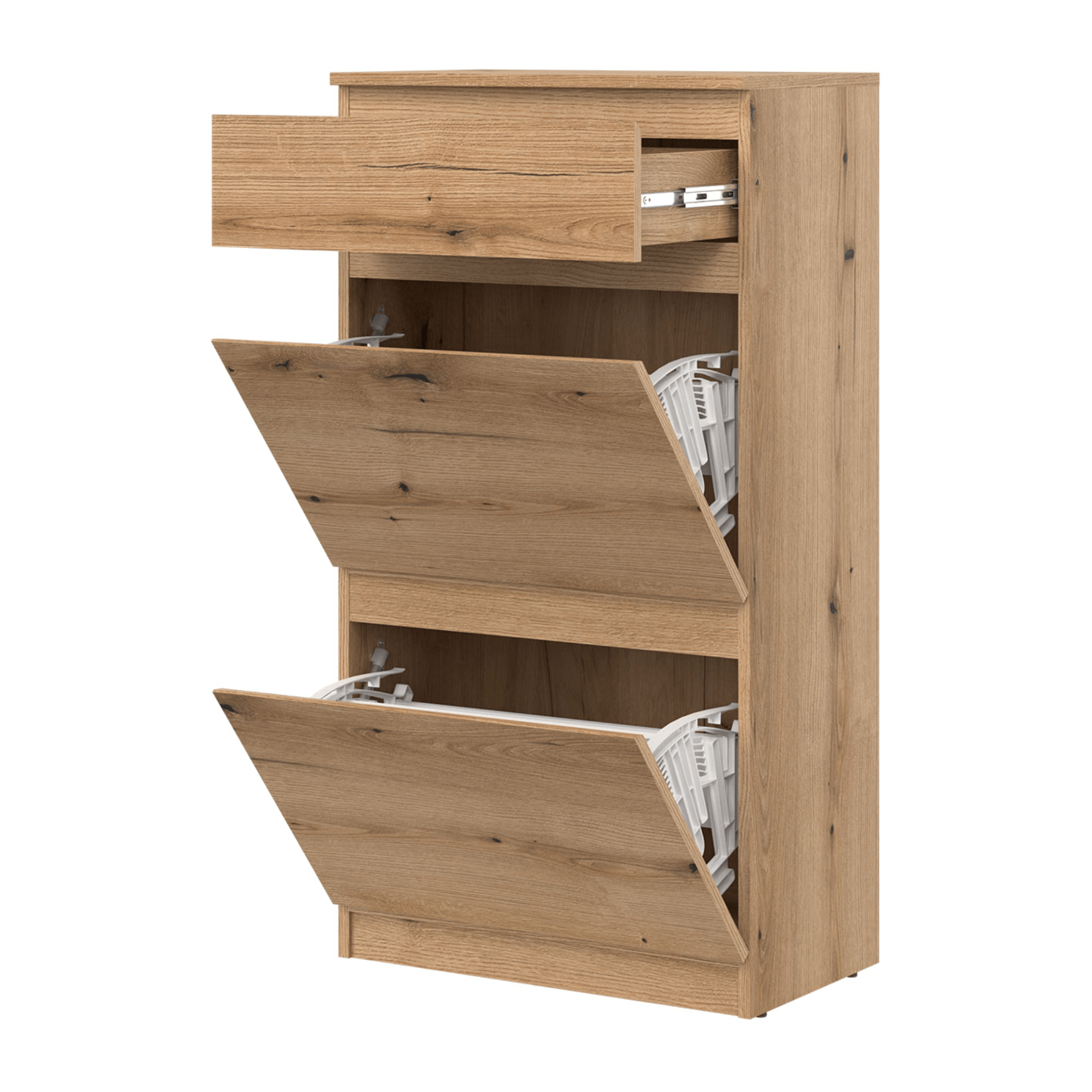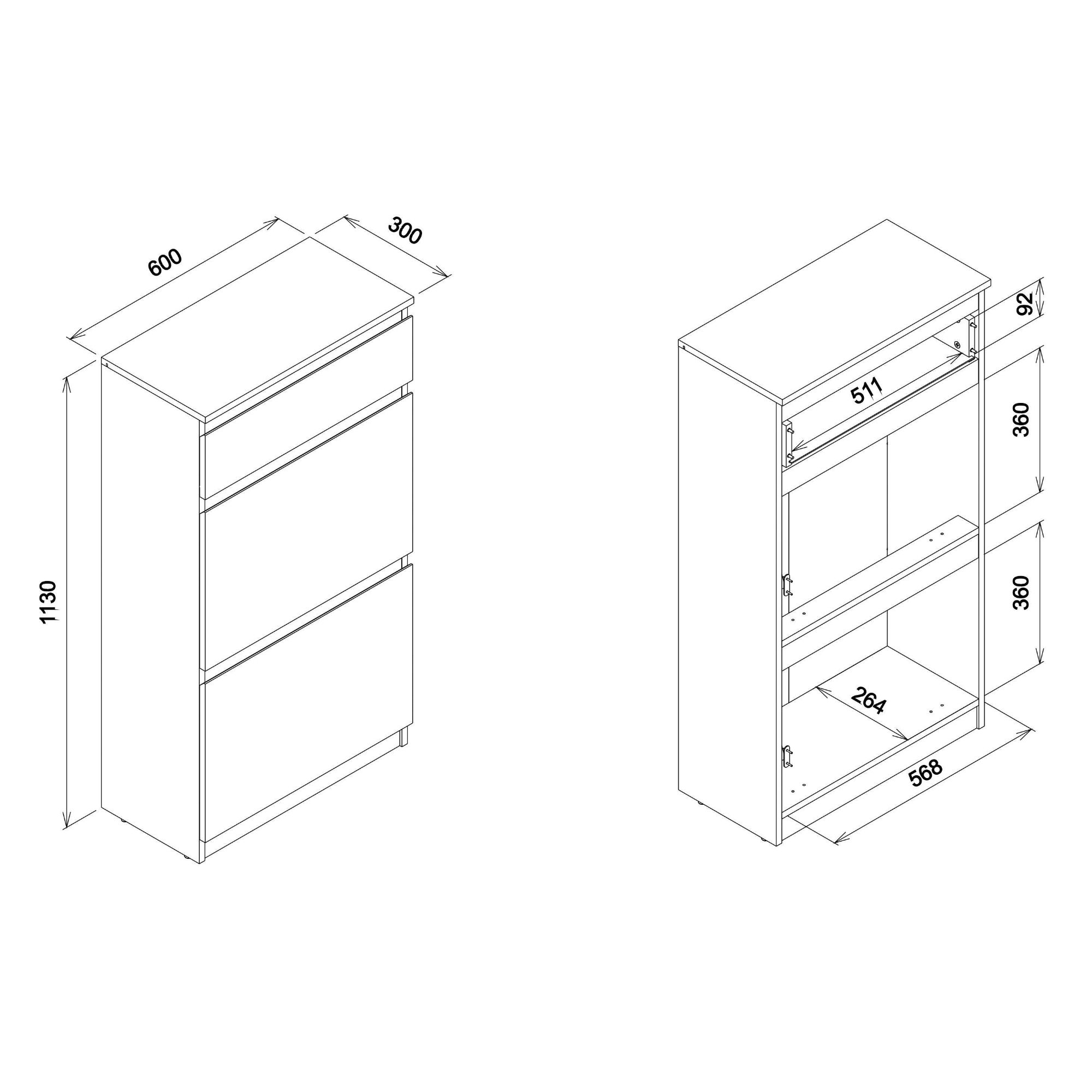 Vyrobená je z laminovaného dreveného materiálu, ktorý sa vyznačuje ľahkou udržiavateľnosťou aj dlhou životnosťou. Dostatočný úložný priestor na obuv zaisťujú dve sekcie s výklopnými dvierkami, na ďalšie drobnosti príde vhod horná zásuvka. Decentné frézovanie predných plôch skrinky supluje rúčkami, vďaka tomu pôsobí čistejším a modernejším dojmom.