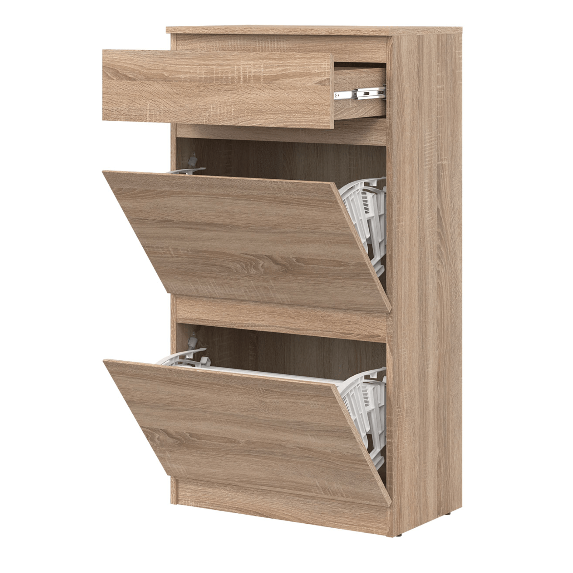 Vyrobená je z laminovaného dreveného materiálu, ktorý sa vyznačuje ľahkou udržiavateľnosťou aj dlhou životnosťou. Dostatočný úložný priestor na obuv zaisťujú dve sekcie s výklopnými dvierkami, na ďalšie drobnosti príde vhod horná zásuvka. Decentné frézovanie predných plôch skrinky supluje rúčkami, vďaka tomu pôsobí čistejším a modernejším dojmom.