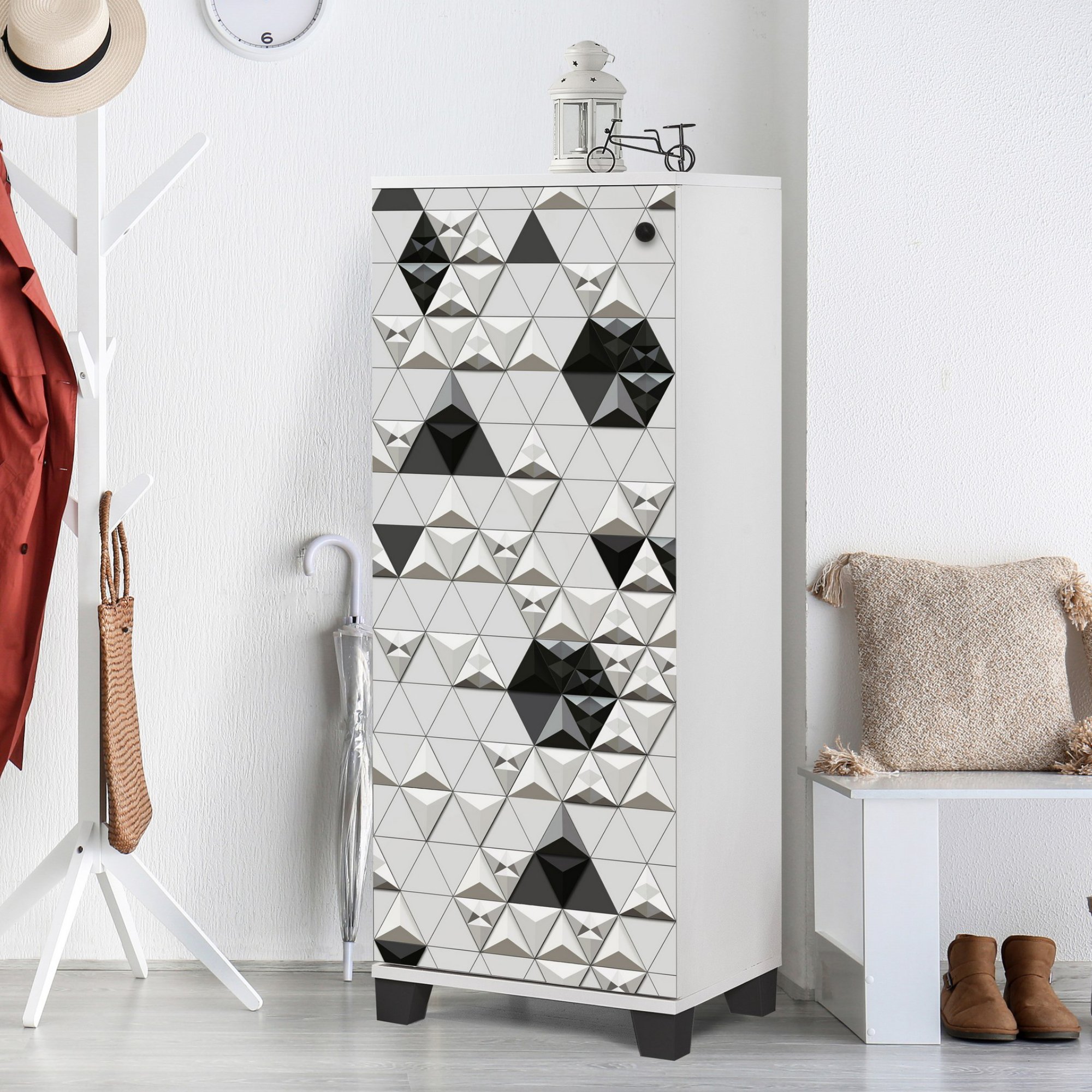 Usporiadajte priestor pri vchodových dverách s praktickou a estetickou skrinkou na topánky FILINTA. Tento praktický pomocník vám pomôže zbaviť sa chaosu a udržať si prehľad o všetkej obuvi. Klasická čiernobiela kombinácia v štýlovom, netradičnom dizajne je ideálnou voľbou do moderných predsiení a šatní, ktoré zaujímavo ozvláštni.