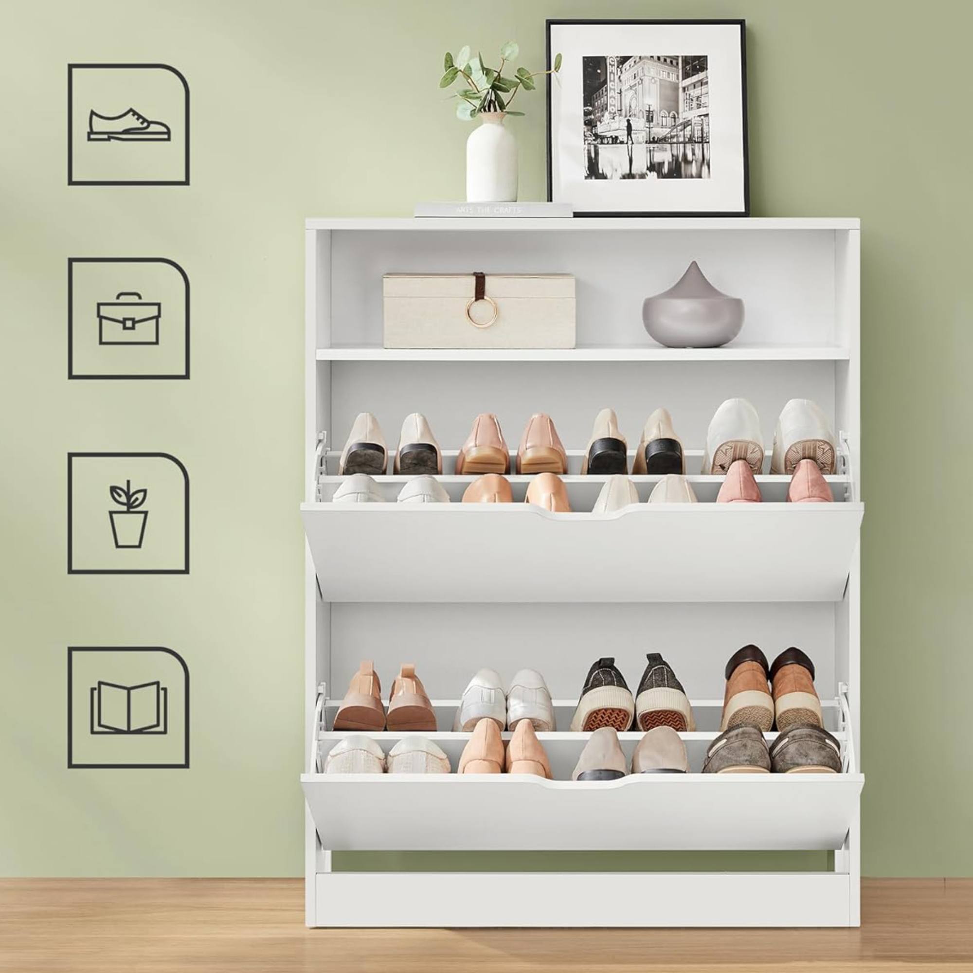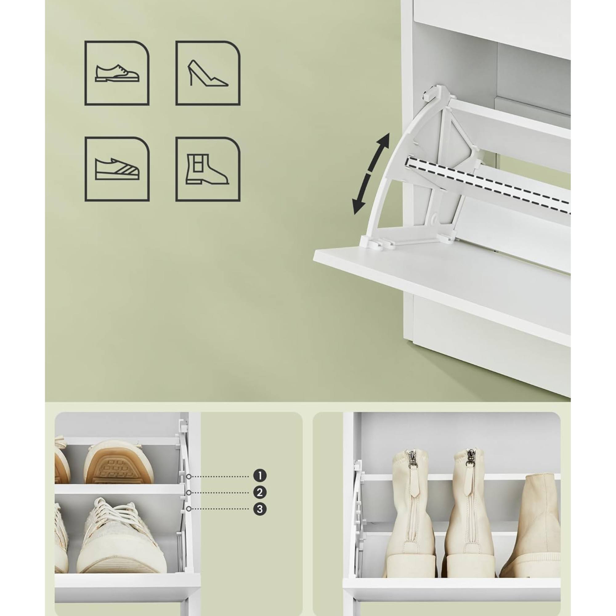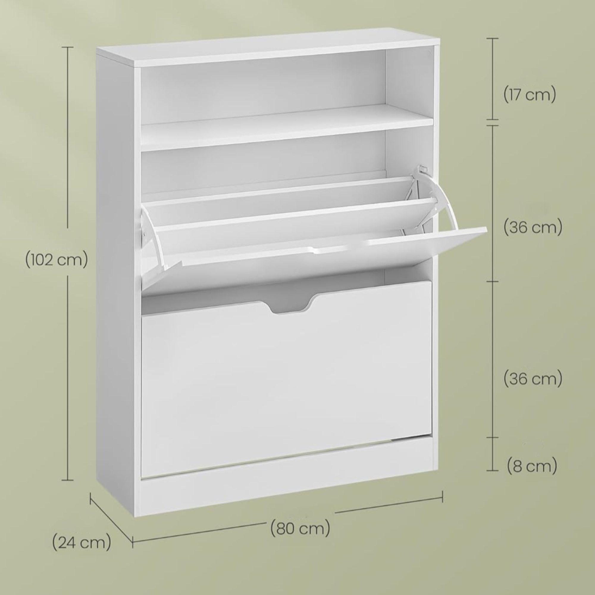 Skrinka ponúka dostatok úložného priestoru pre vaše obľúbené topánky. Priestor za výklopnými dvierkami je členený nastaviteľnými vnútornymi prepážkami, ktoré je možné v prípade potreby vybrať. Nechýba ani polica, na ktorú si môžete odložiť kľúče aj ďalšie drobnosti.