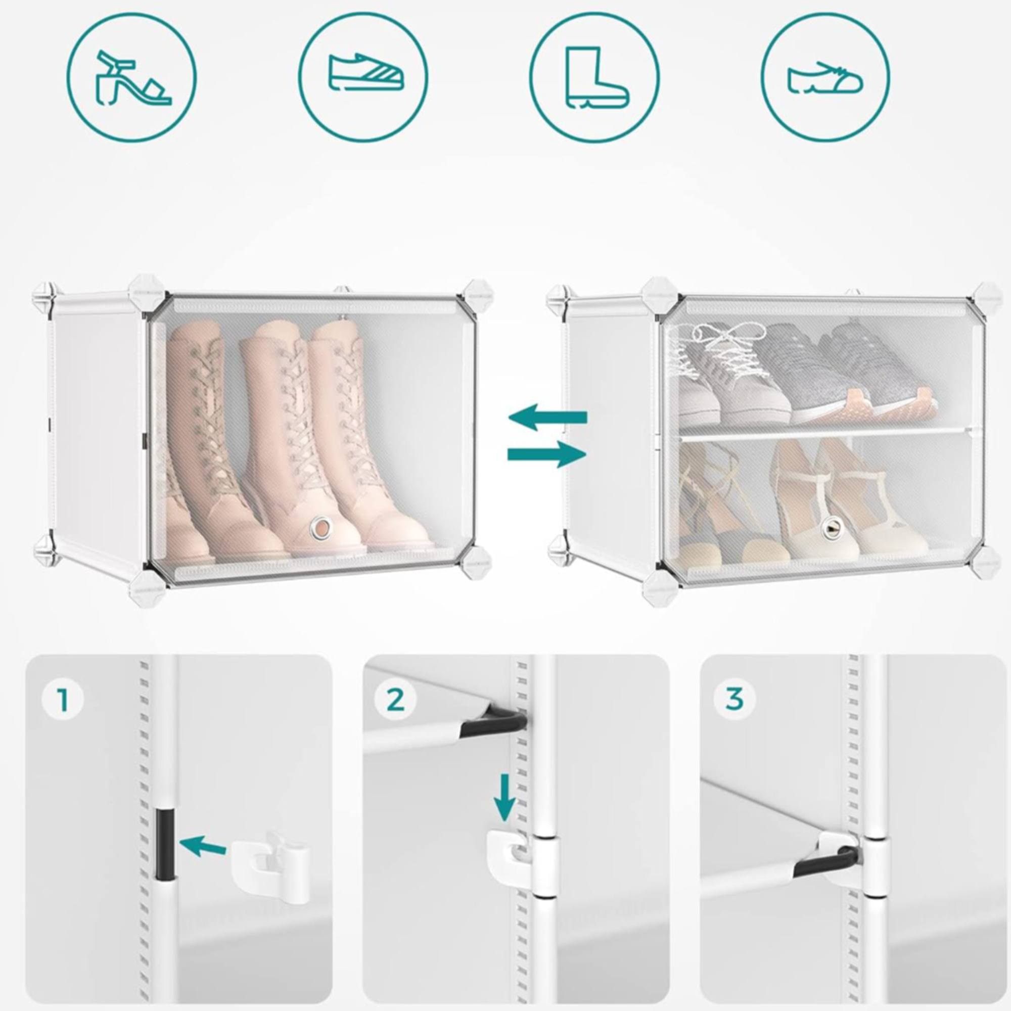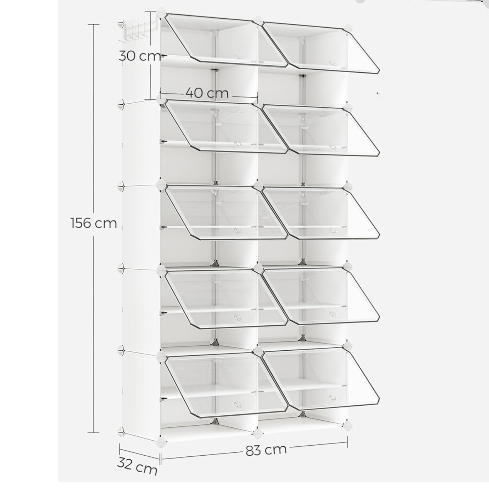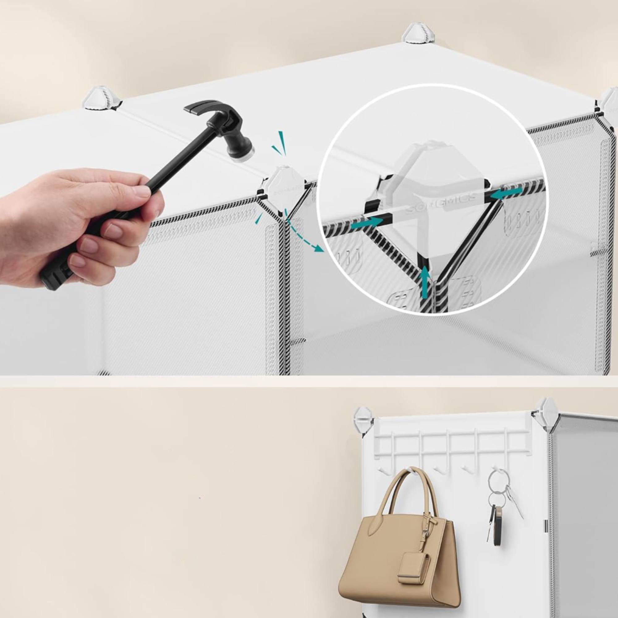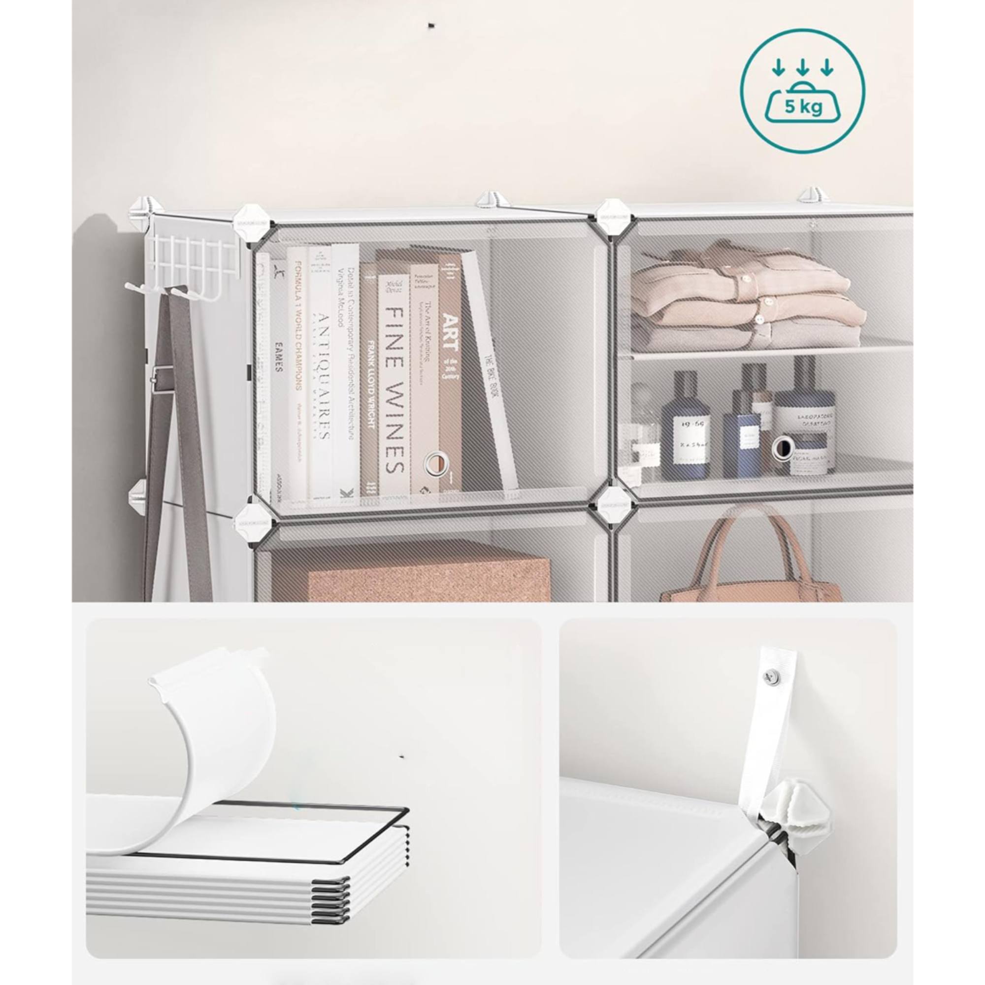 Súčasťou skrinky je 10 vložených políc, ktoré je možné v prípade potreby vybrať. Nechýbajú ani praktické háčiky. Dvierka sú vybavené otvormi, ktoré umožňujú nielen ich ľahké otváranie, ale podporujú aj vetranie.
