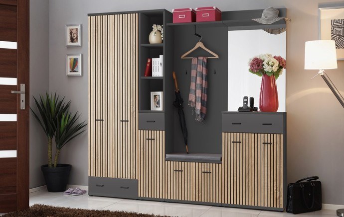 Vyrobená je z laminovaného dreveného materiálu, pre ktorý je typická jednoduchá udržiavateľnosť aj dlhá živostnosť. Korpus je ladený do antracitového odtieňa, zatiaľ čo predná plocha s dekoratívnym mriežkovaním je v prírodnom dekore dub artisan s decentnou kresbou dreva. Bohaté úložné miesto zaisťuje horná zásuvka a spodný priestor s dvoma policami krytý dvierkami. Manipuláciu uľahčujú praktické plastové rúčky.