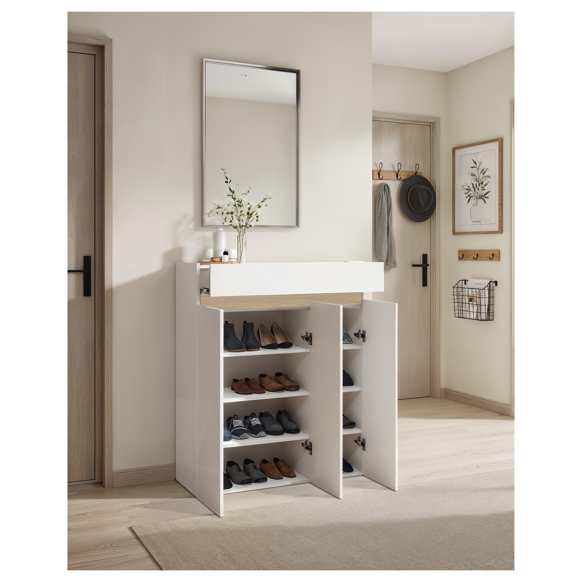 Skrinka ponúka dostatok úložného priestoru. Za jej dvierkami sa nachádza 6 vložených políc, na ktoré si môžete prehľadne uložiť vaše obľúbené topánky. Na uloženie rôznych drobností je ako stvorená 1 zásuvka.