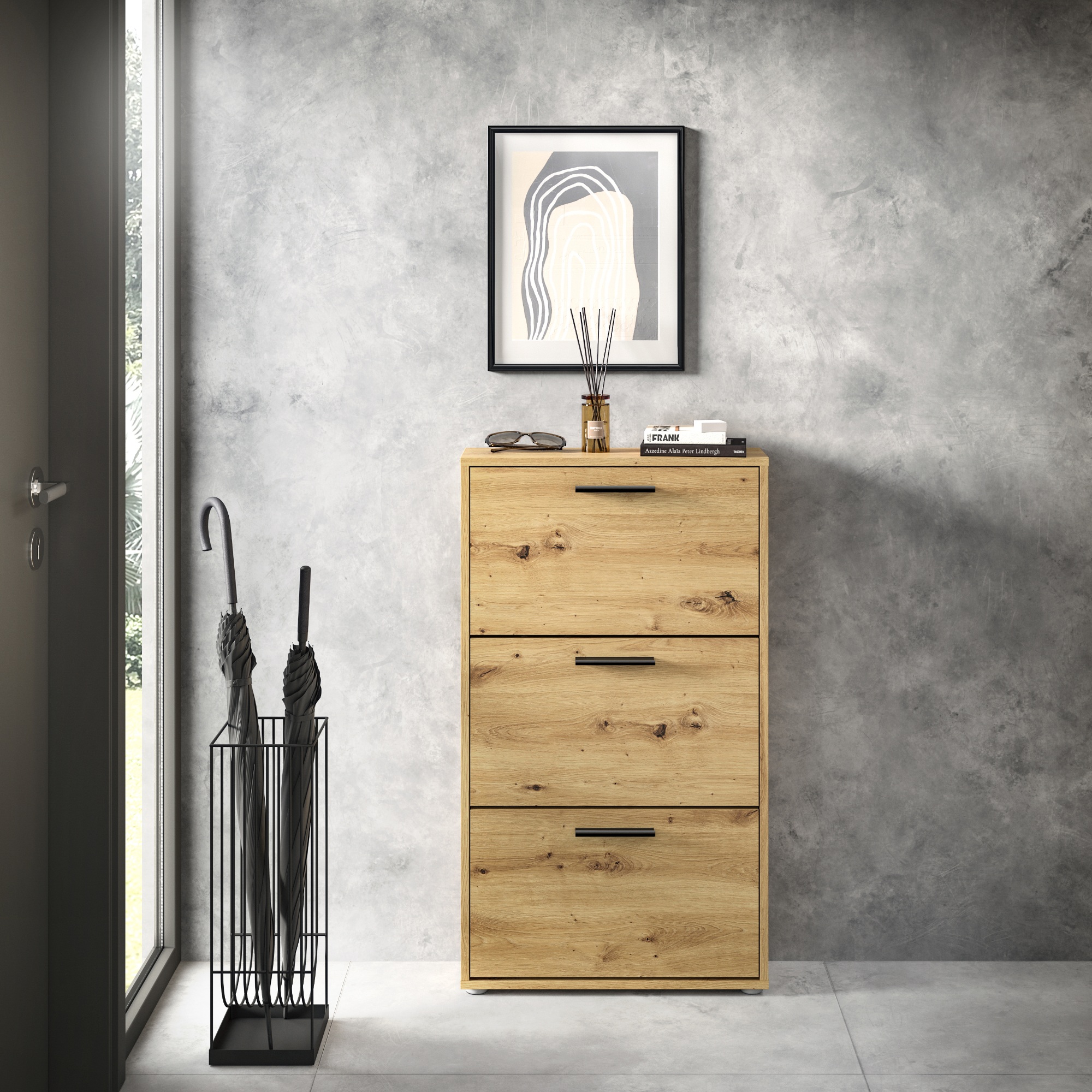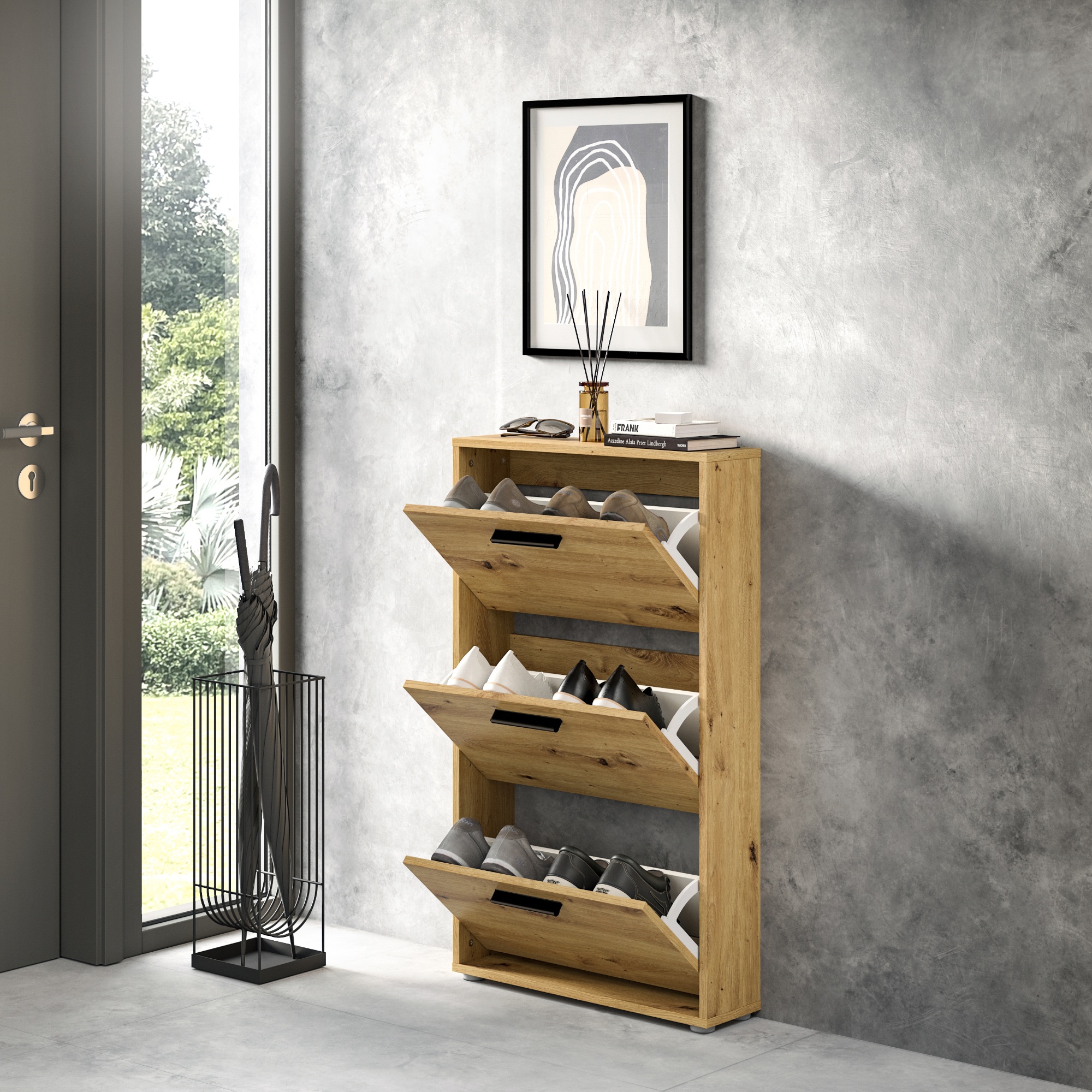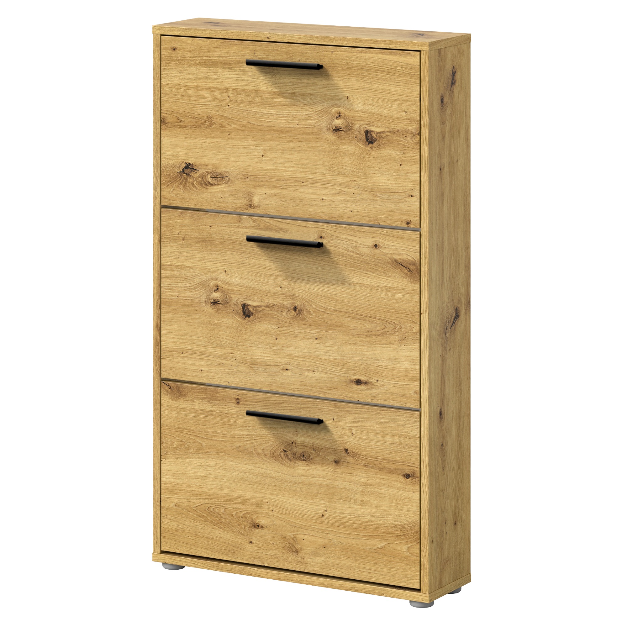 Za výklopnými dvierkami skrinky sa nachádza dostatok úložného priestoru pre vaše obľúbené topánky. Aby sa s nimi dobre manipulovalo, sú vybavené rúčkami.
