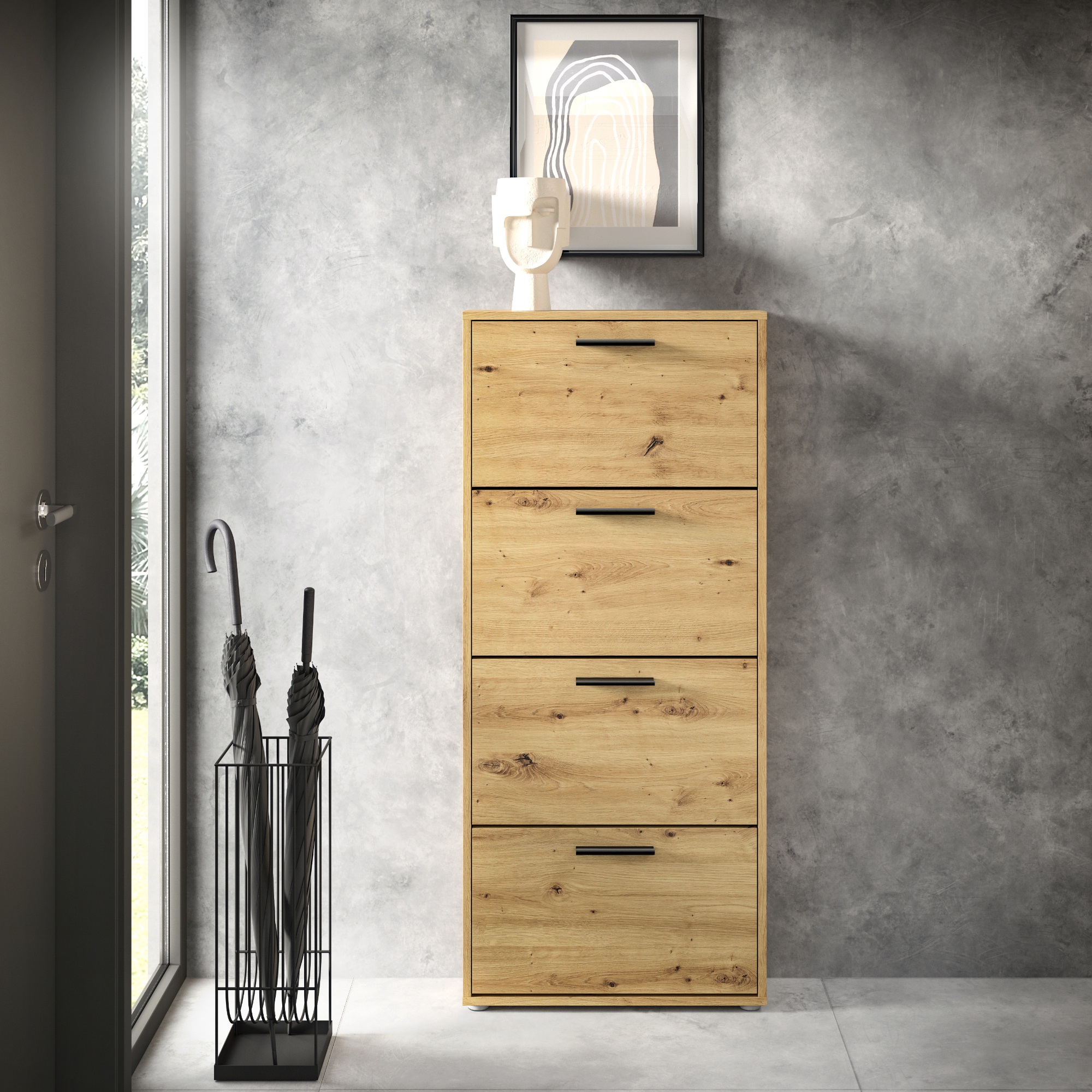 Za výklopnými dvierkami skrinky sa nachádza dostatok úložného priestoru pre vaše obľúbené topánky. Aby sa s nimi dobre manipulovalo, sú vybavené rúčkami.