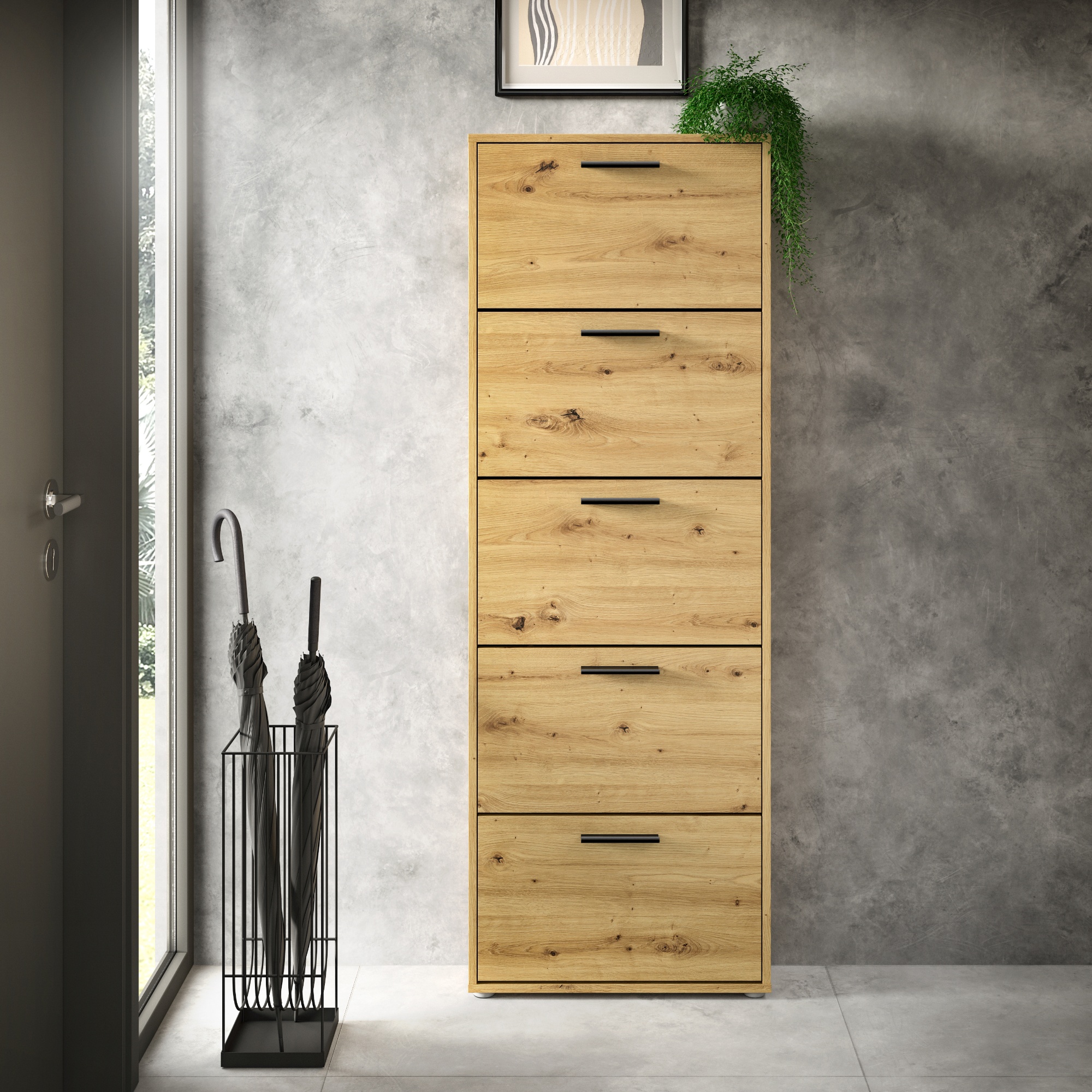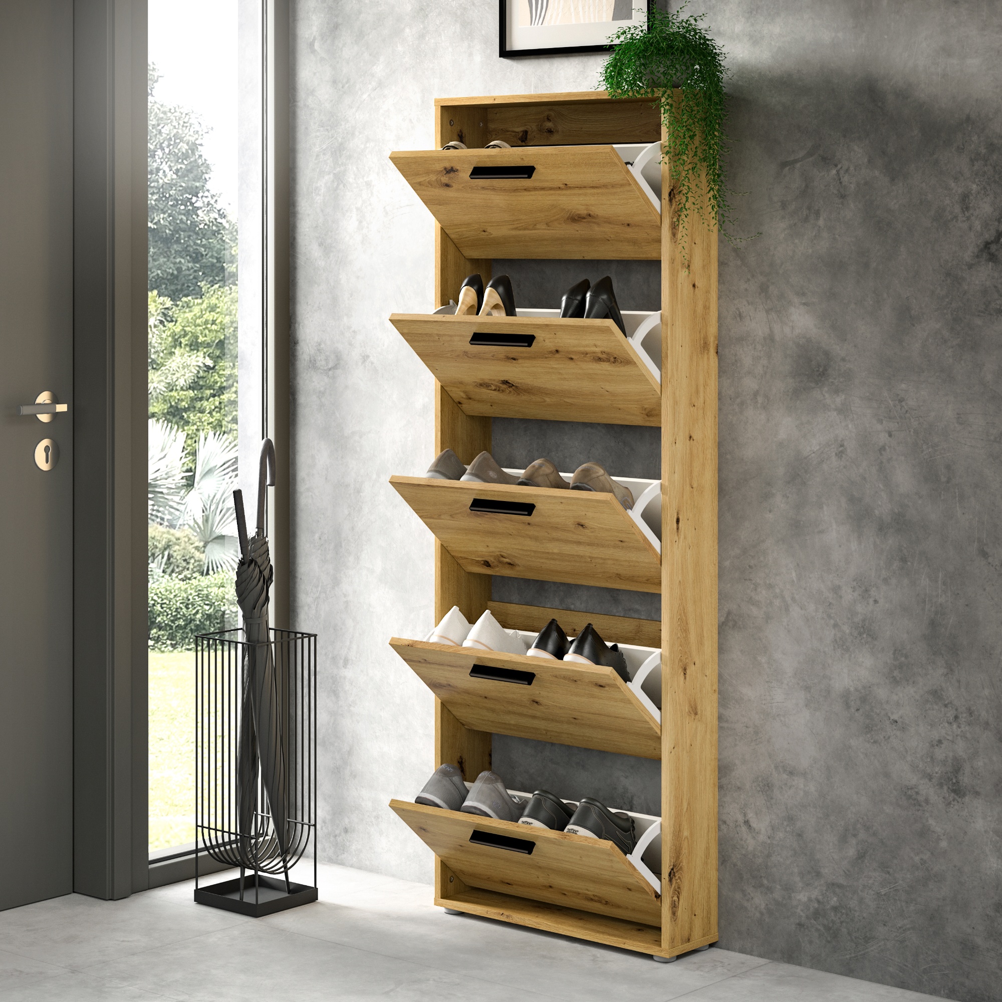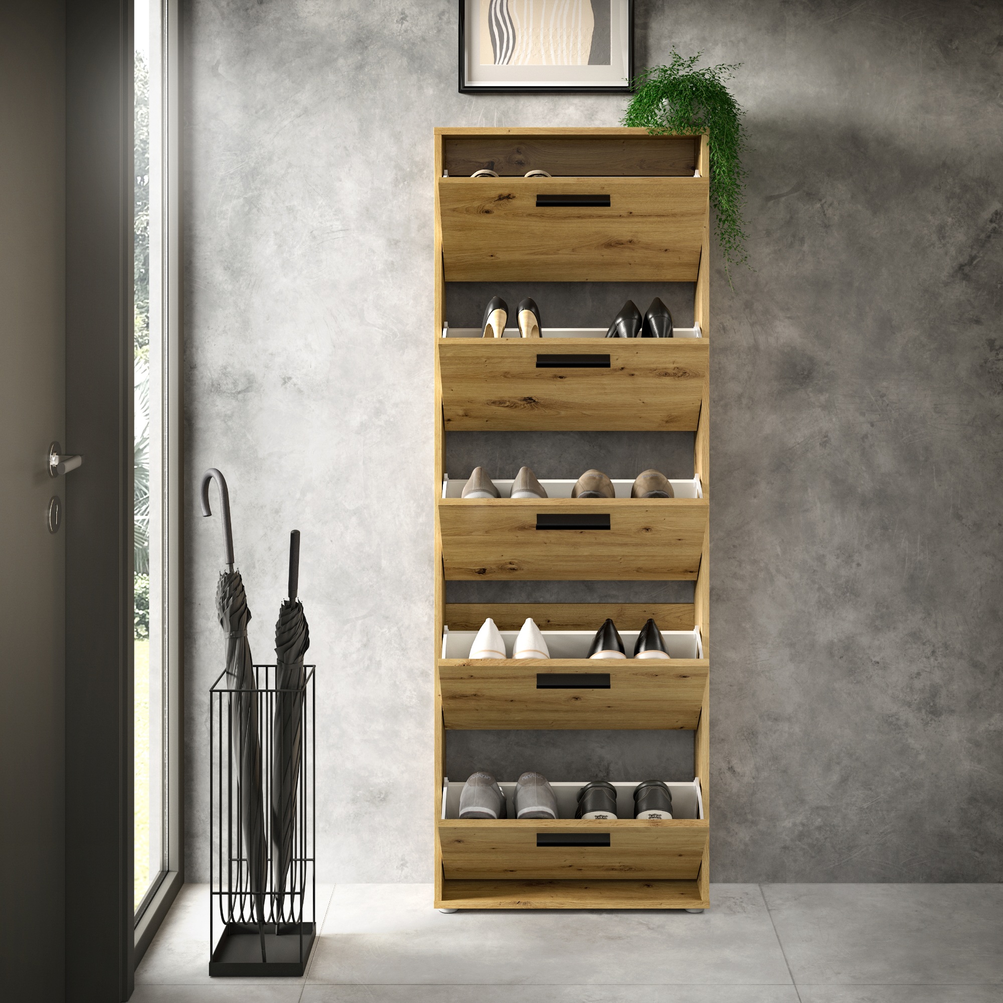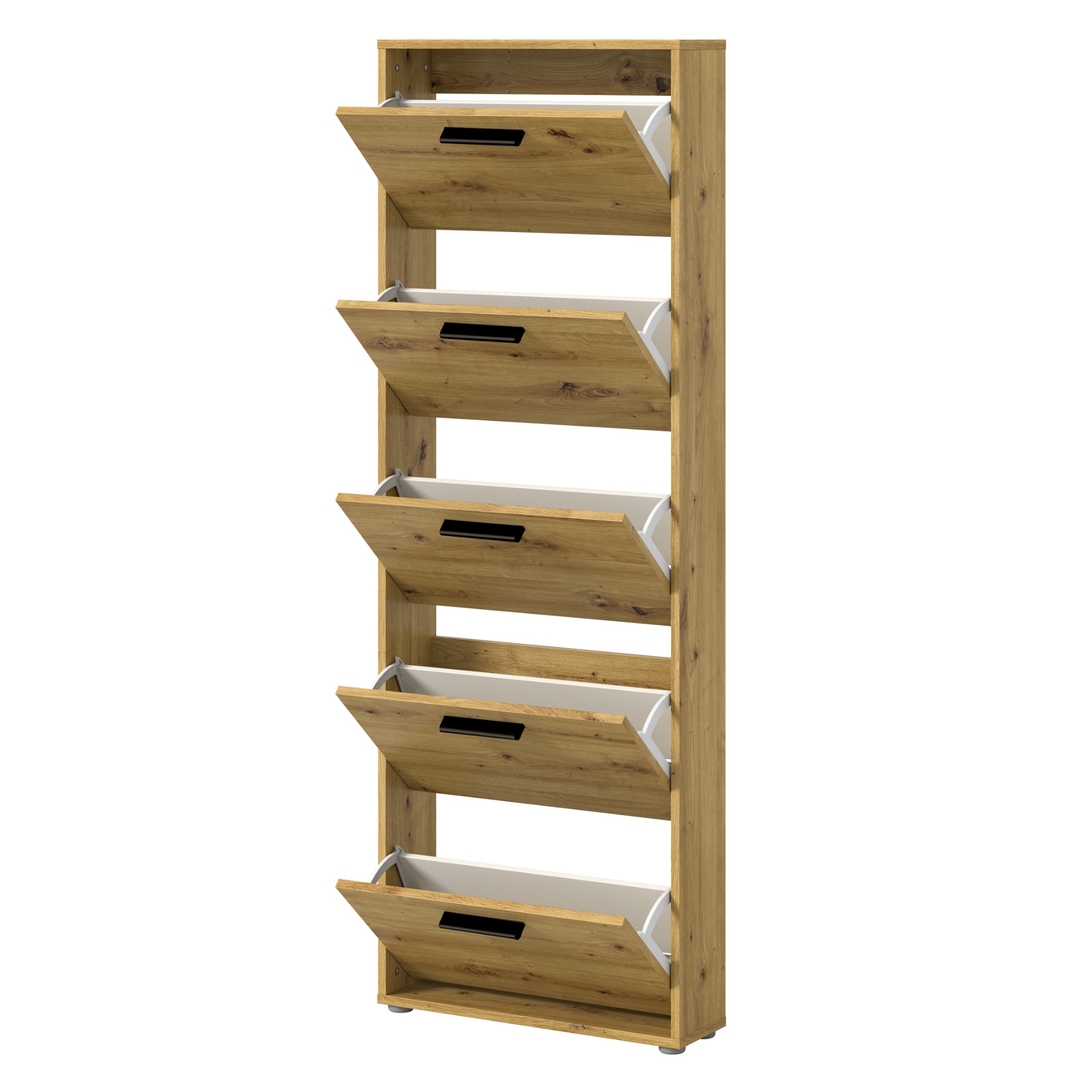 Za výklopnými dvierkami skrinky sa nachádza dostatok úložného priestoru pre vaše obľúbené topánky. Aby sa s nimi dobre manipulovalo, sú vybavené rúčkami.