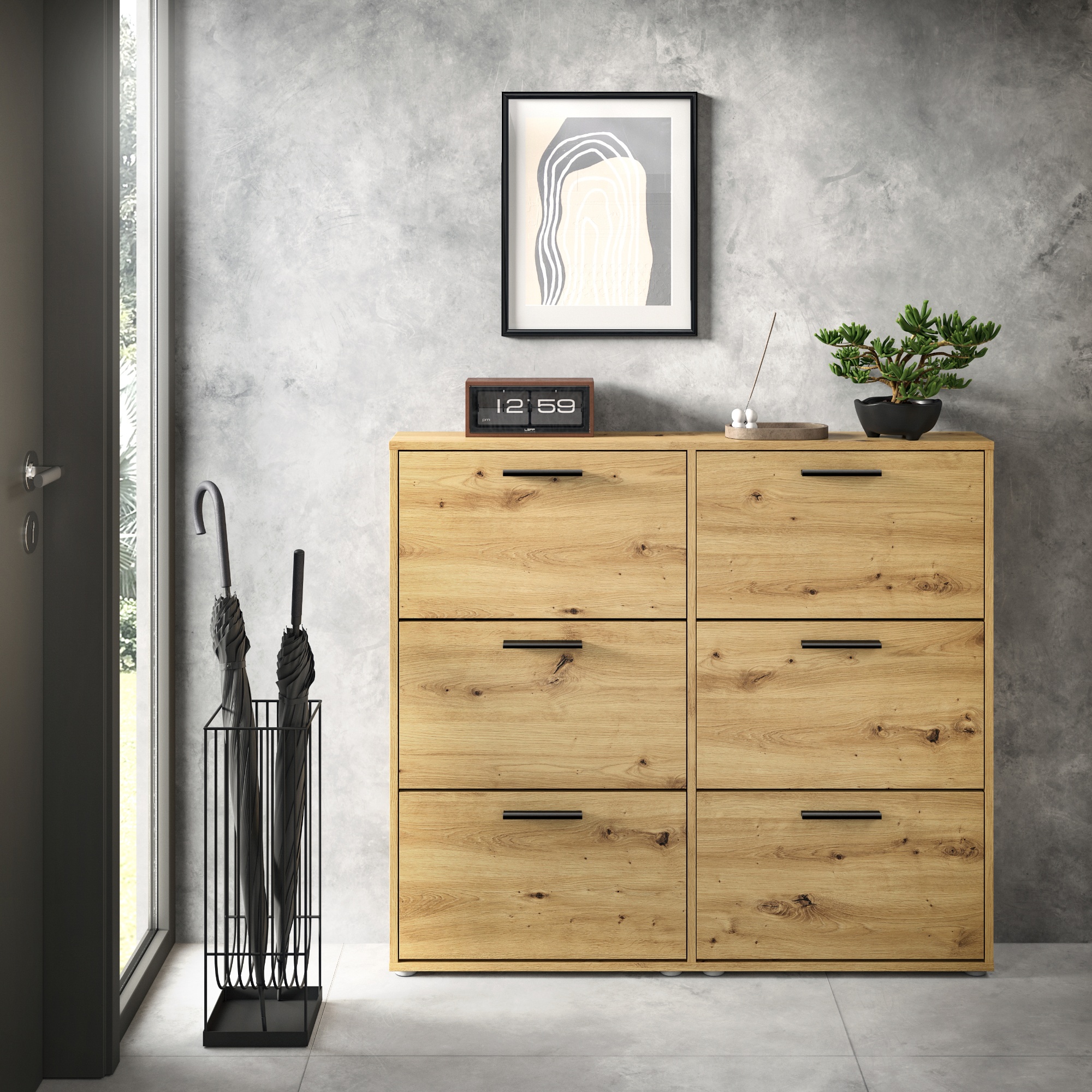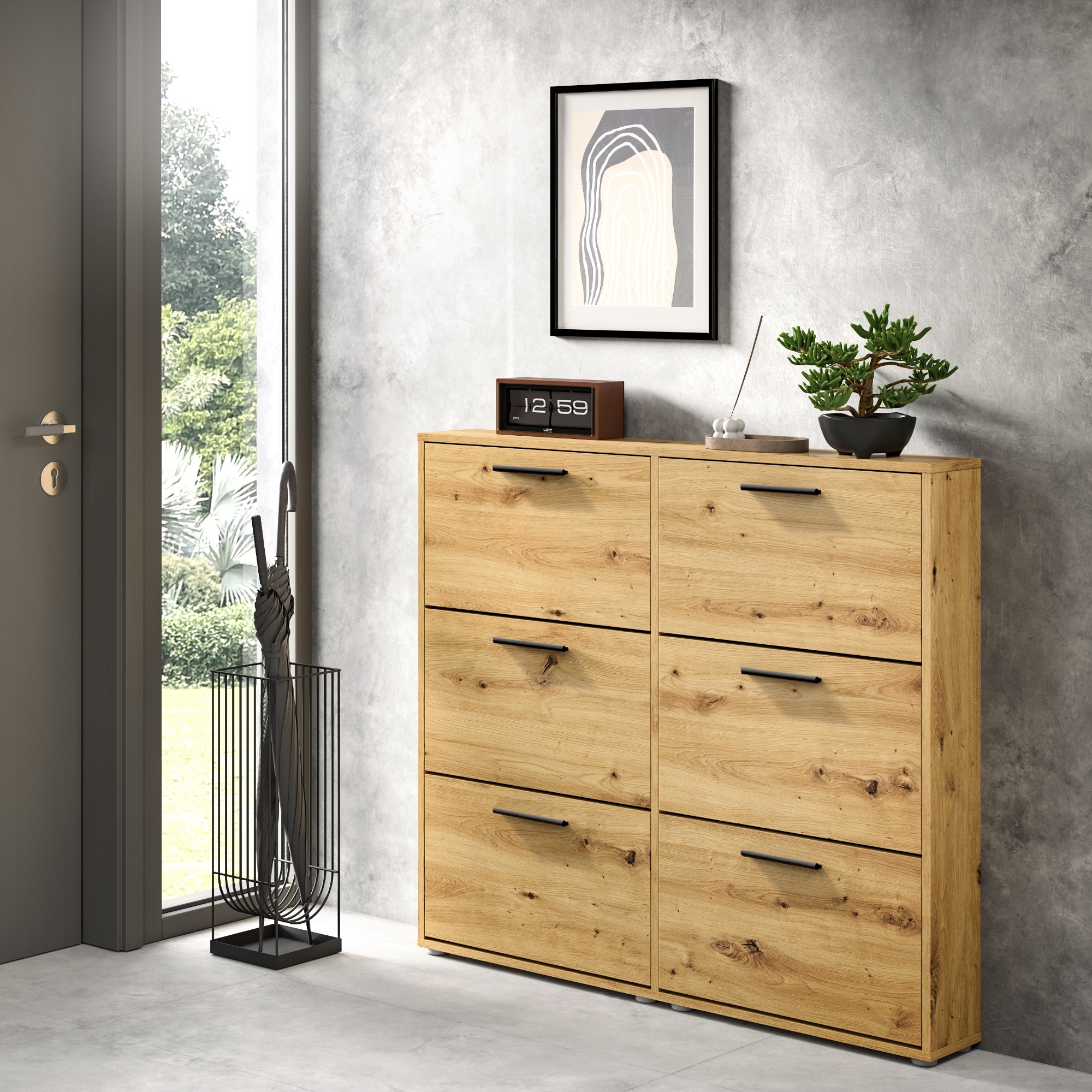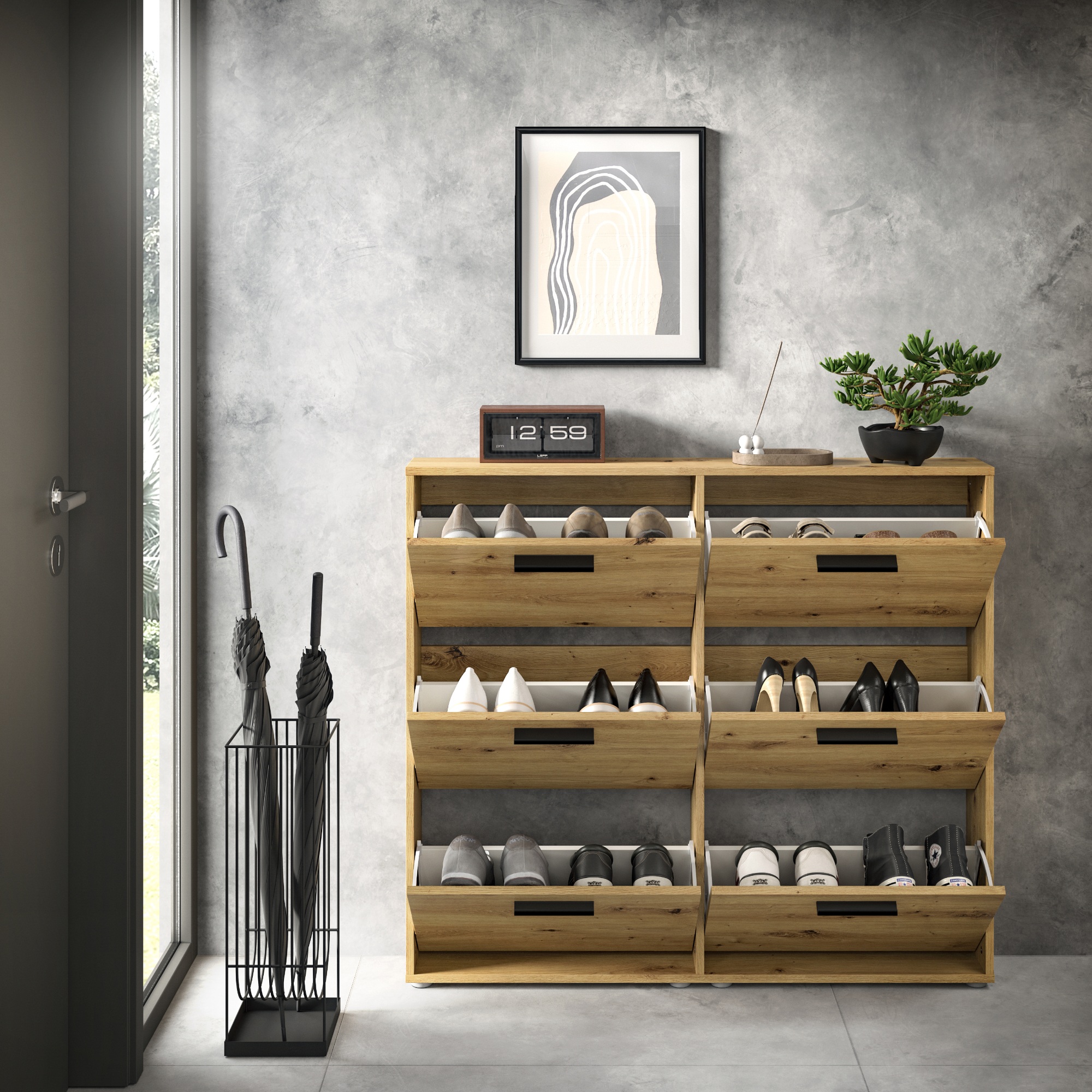 Za výklopnými dvierkami skrinky sa nachádza dostatok úložného priestoru pre vaše obľúbené topánky. Aby sa s nimi dobre manipulovalo, sú vybavené rúčkami.